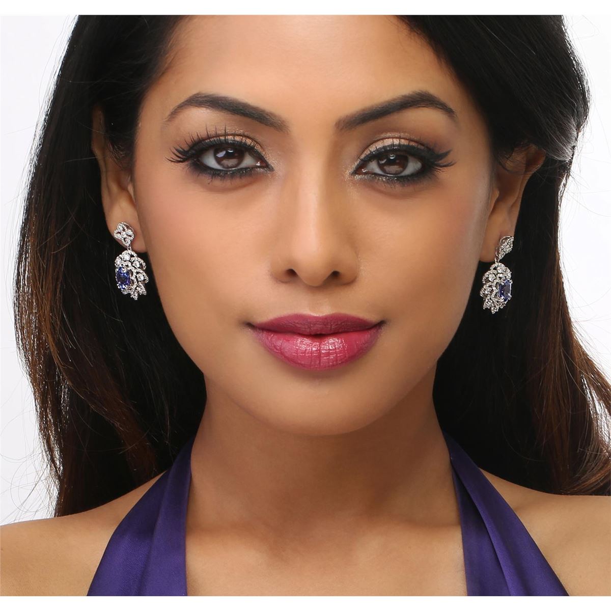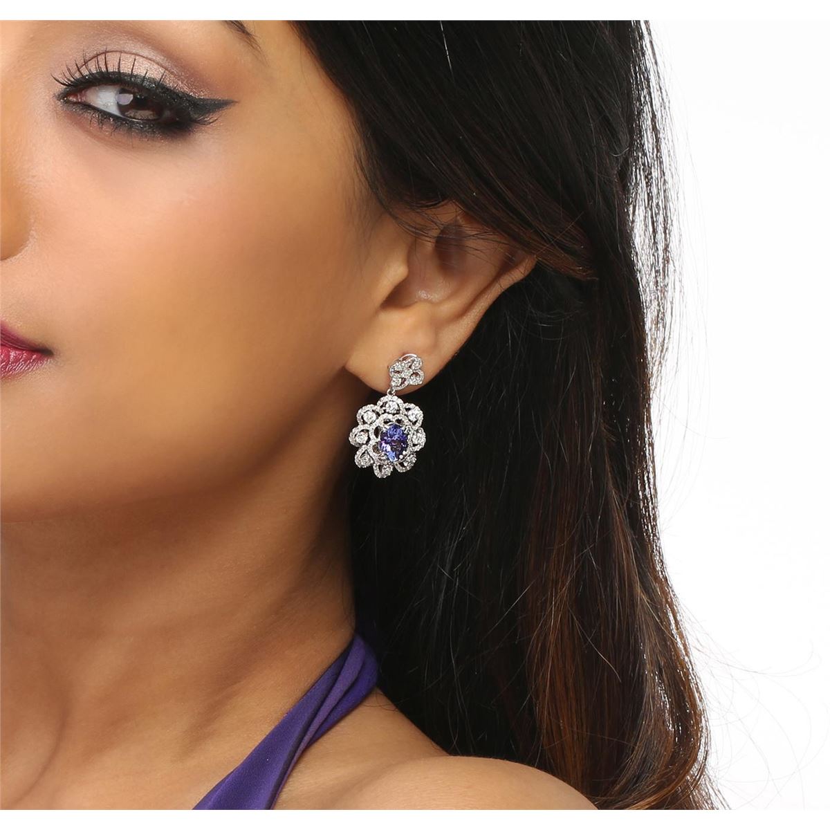One pair electronically tested 14KT white gold ladies combination cast & assembled dangle earrings with hinged clip backs with a bright polish finish. Condition is new. Identified with markings of "K14". Containing: Two prong set oval modified brilliant cut natural tanzanites, measuring 8.80 x 6.20 x 4.03mm, approximate. Total Weight of 3.04ct., clarity is eye clean, type I, medium light, very slightly grayish, bluish violet color, (GIA bV 4/3), cut is good. Sixteen prong set round brilliant cut diamonds, measuring 2.50 - 2.50 x 1.50mm (depth est.) approximate. Total Weight of 16 Stones = 0.91ct. Clarity: SI-1 to SI-2. Color: I - J, Cut is Good. Ten prong set round brilliant cut diamonds, measuring 2.20 - 2.20 x 1.32mm (depth est.) approximate. Total Weight of 10 Stones = 0.39ct. Clarity: SI-1 to SI-2. Color: H - I, Cut is Good. Two Hundred Sixteen prong set round brilliant cut diamonds, measuring 1.00 - 1.00 x 0.60mm (depth est.) approximate. Total Weight of 216 Stones = 0.78ct. Clarity: I-1 to I-2. Color: I - J, Cut is Good. Colored gemstones are presumed to have been subjected to commonly used enhancement processes. All diamonds and colored gemstones are graded in the mounting, unless otherwise stated. Total Weight of Colored Stones 3.04ct. Total Weight of Diamonds 2.08ct. Total Weight of Earrings 9.80 grams. GGL Appraised at $12,710.00.