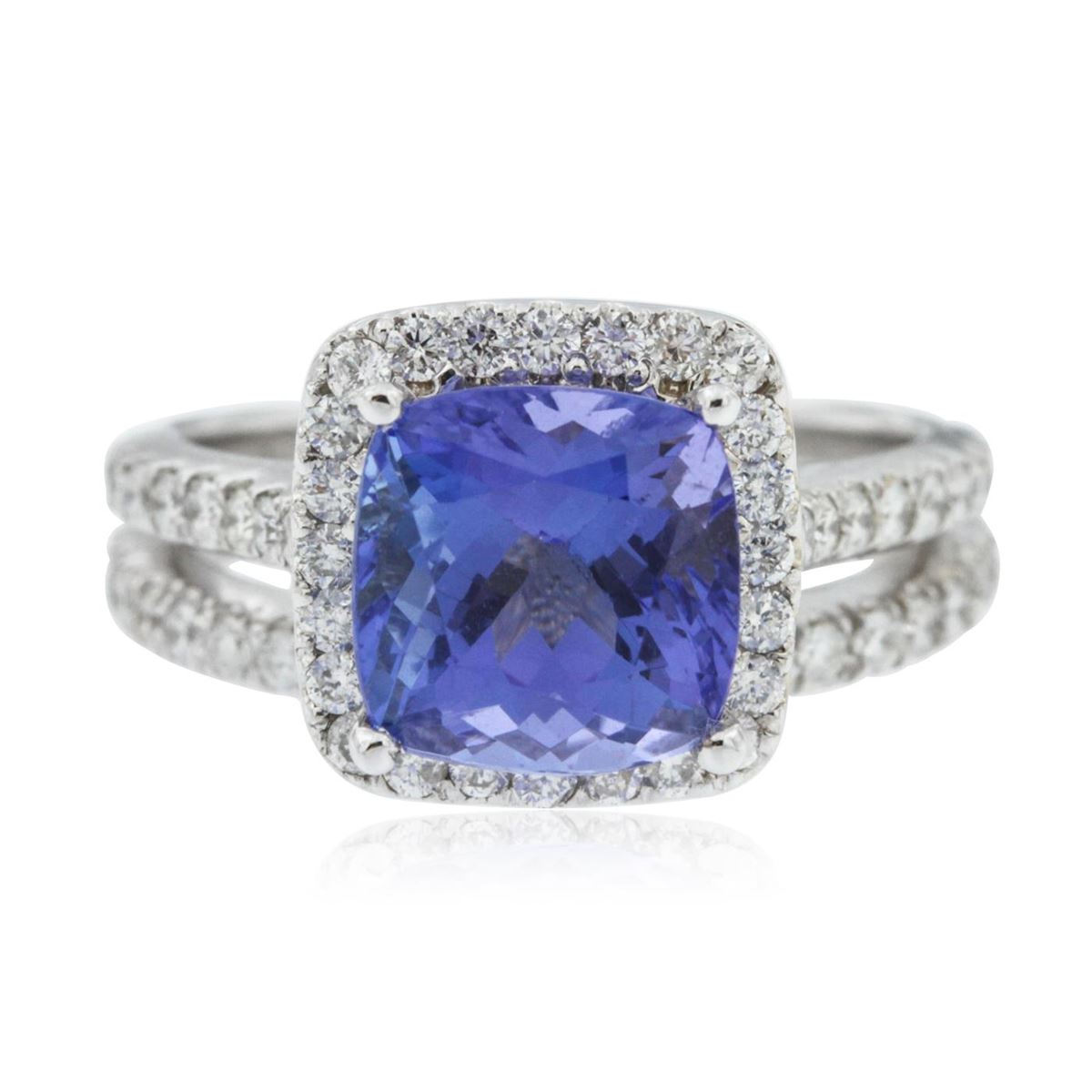 One electronically tested 14KT white gold ladies cast tanzanite and diamond ring & wedding band with a bright polish finish. Identified with markings of "14KT". Condition is new. Containing: One prong set square cushion modified brilliant cut natural tanzanite, measuring 8.40 x 8.40 x 5.47mm, approximate weight of 3.04ct., clarity is eye clean, type I, medium light, very slightly grayish, violet color, (GIA V 4/3), cut is very good. Sixty-Two prong set round brilliant cut diamonds, measuring 1.50 - 1.50 x 0.90mm (depth est.) approximate total weight of 62 Stones = 0.76ct. Clarity: SI-1 to I-1. Color: I - J, Cut is Good. Colored gemstones are presumed to have been subjected to commonly used enhancement processes. All diamonds and colored gemstones are graded in the mounting, unless otherwise stated. Total Weight of Colored Stones 3.04ct. Total Weight of Diamonds 0.76ct. Total Weight of Ring & Wedding Band 6.90 grams. GGL Appraised at $4,785.00.