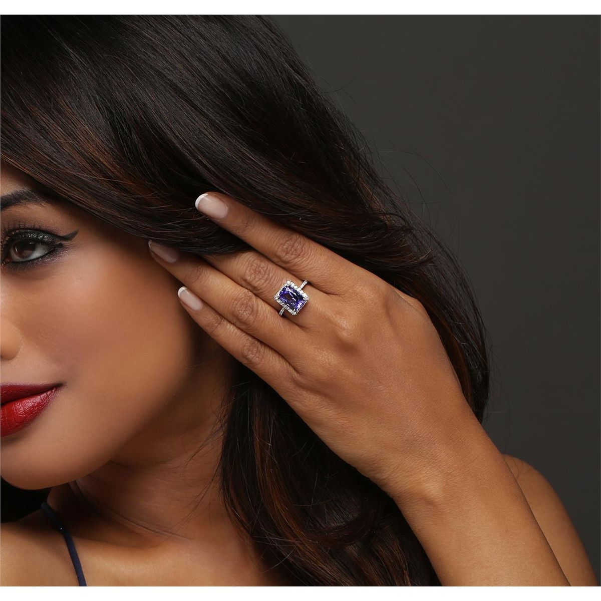 One electronically tested 14KT white gold ladies combination cast & assembled tanzanite and diamond ring with a flat shank with a bright polish finish. Identified with markings of "14K". Condition is new. Containing: One prong set rectangular cushion modified brilliant cut natural tanzanite, measuring 10.76 x 7.58 x 4.74mm, approximate weight of 3.04ct., clarity is eye clean, type I, medium, moderately strong, violet color, (GIA V 5/4), cut is good. Thirty-Six prong set round brilliant cut diamonds, measuring 1.50 - 1.00 x 0.75mm (depth est.) approximate total weight of 36 Stones = 0.26ct. Clarity: I-1 to I-2. Color: I - J, Cut is Good. Colored gemstones are presumed to have been subjected to commonly used enhancement processes. All diamonds and colored gemstones are graded in the mounting, unless otherwise stated. Total Weight of Colored Stones 3.04ct. Total Weight of Diamonds 0.26ct. Total Weight of Ring 3.10 grams. GGL Appraised at $5,850.00.