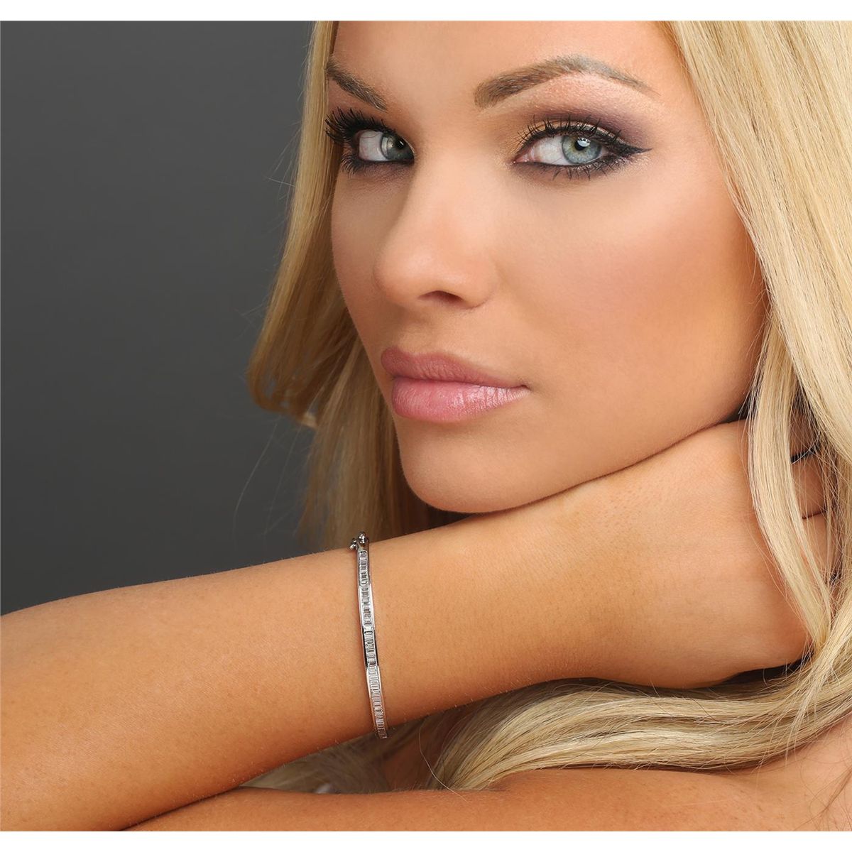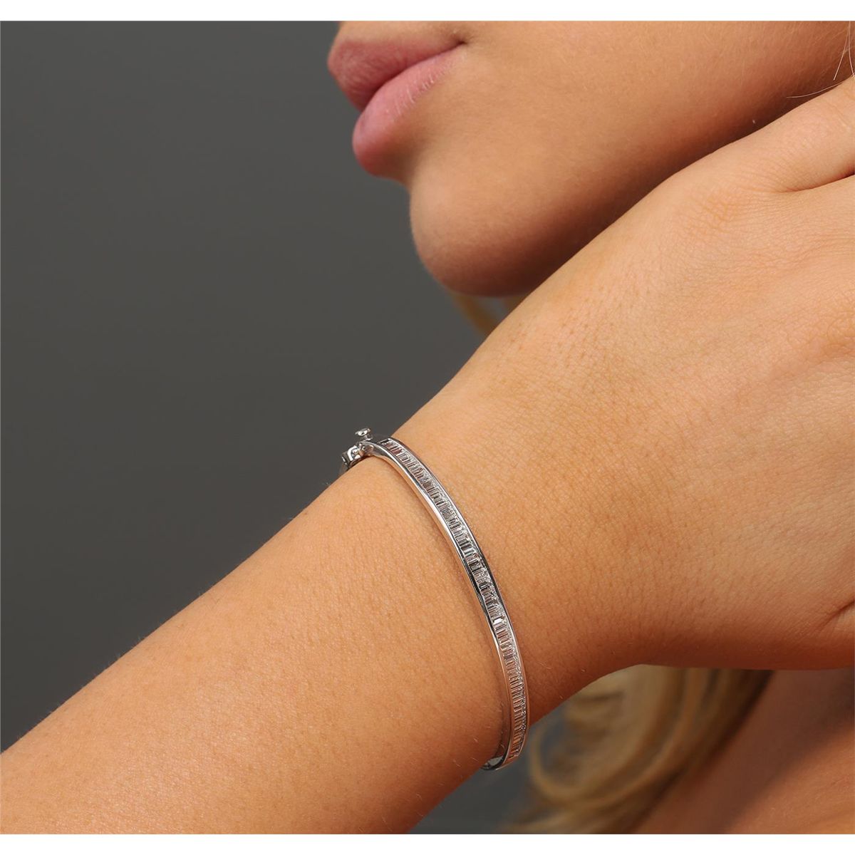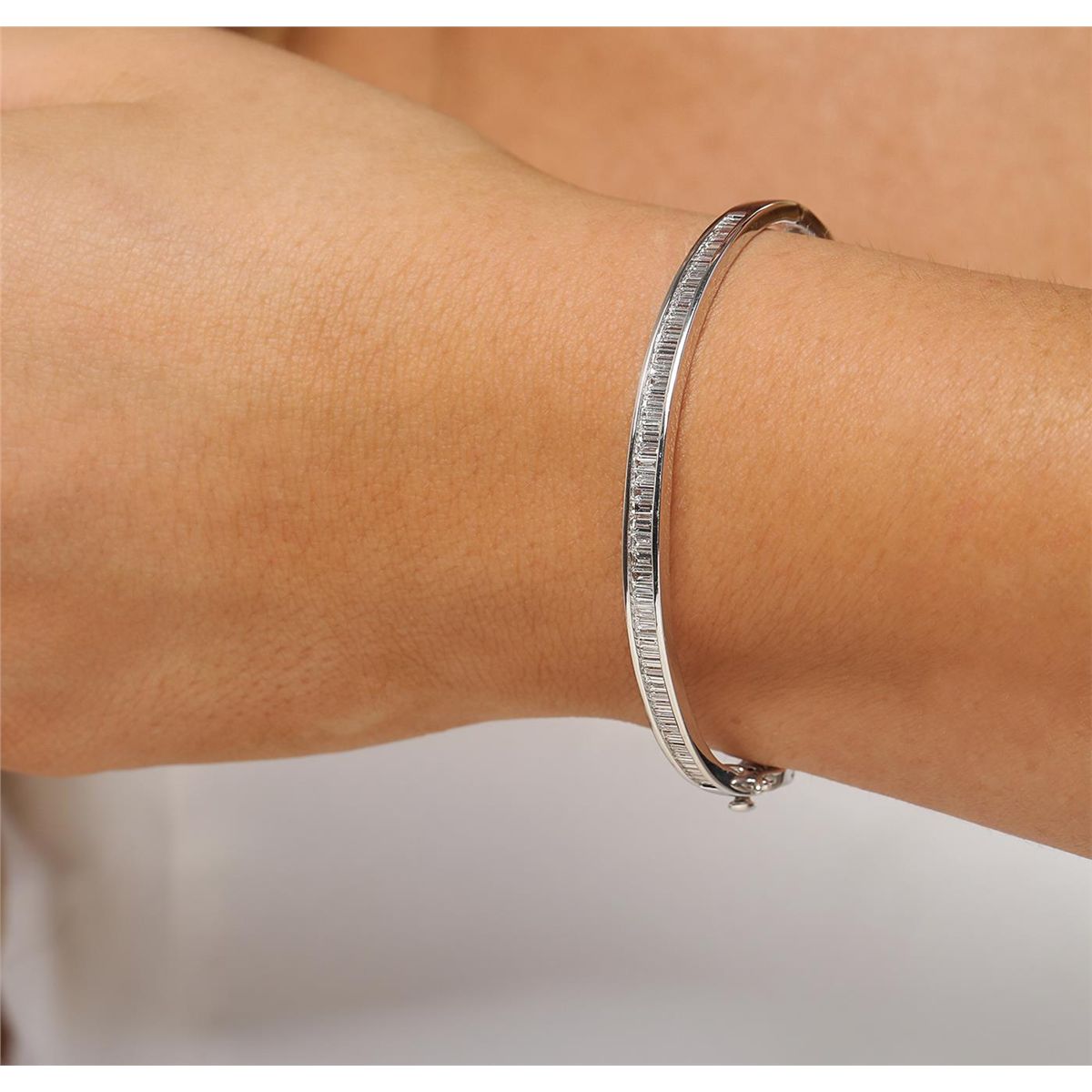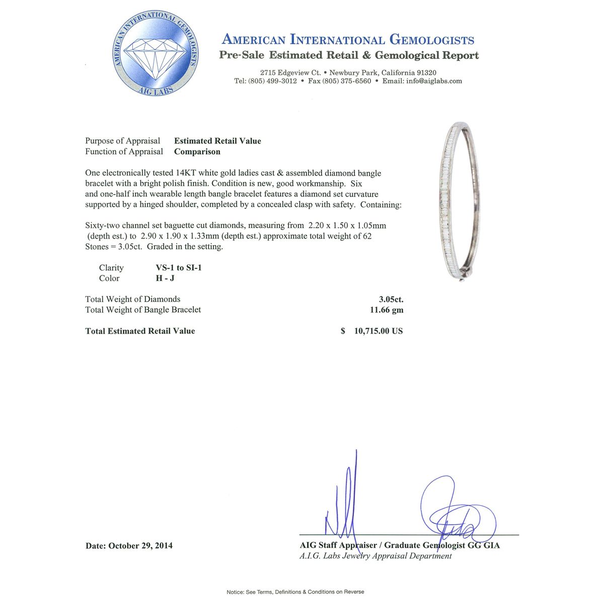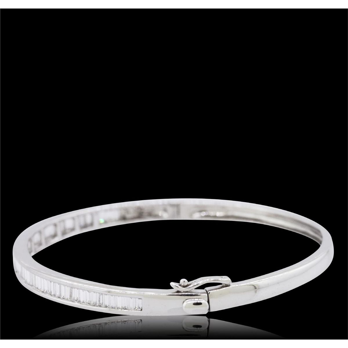 One electronically tested 14KT white gold ladies cast & assembled diamond bangle bracelet with a bright polish finish. Six and one-half inch wearable length bangle bracelet features a diamond set curvature supported by a hinged shoulder, completed by a concealed clasp with safety. Condition is new, good workmanship. Containing: Sixty-Two channel set baguette cut diamonds, measuring from 2.20 x 1.50 x 1.05mm (depth est.) to 2.90 x 1.90 x 1.33mm (depth est.) approximate total weight of 62 Stones = 3.05ct. Graded in the setting. Clarity: VS-1 to SI-1. Color: H - J. Total Weight of Diamonds 3.05ct. Total Weight of Bangle Bracelet 11.66 grams. AIG Appraised at $10,715.00.
