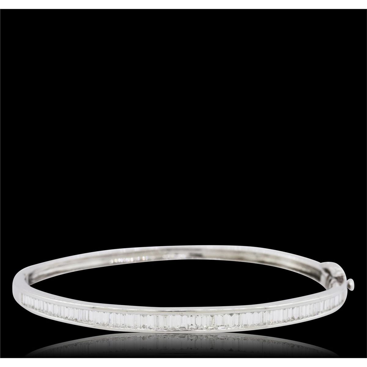 One electronically tested 14KT white gold ladies cast & assembled diamond bangle bracelet with a bright polish finish. Six and one-half inch wearable length bangle bracelet features a diamond set curvature supported by a hinged shoulder, completed by a concealed clasp with safety. Condition is new, good workmanship. Containing: Sixty-Two channel set baguette cut diamonds, measuring from 2.20 x 1.50 x 1.05mm (depth est.) to 2.90 x 1.90 x 1.33mm (depth est.) approximate total weight of 62 Stones = 3.05ct. Graded in the setting. Clarity: VS-1 to SI-1. Color: H - J. Total Weight of Diamonds 3.05ct. Total Weight of Bangle Bracelet 11.66 grams. AIG Appraised at $10,715.00.