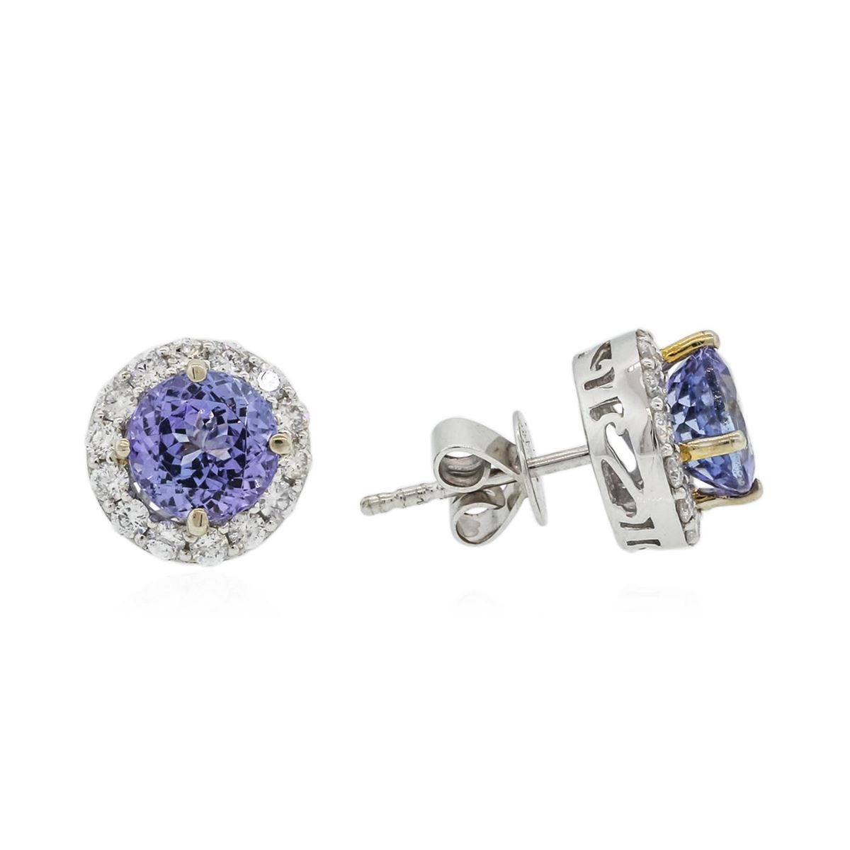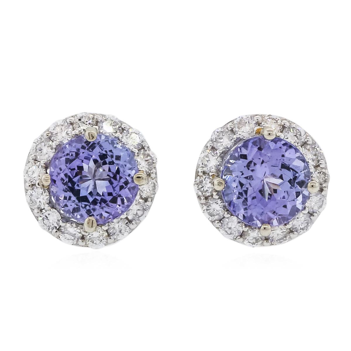 One pair electronically tested 14KT white gold ladies combination cast & assembled stud earrings with friction posts with a bright polish finish.  Identified with markings of "14K". Condition is new. Containing: Two prong set round modified brilliant cut natural tanzanites, measuring 7.05 - 7.05 x 4.58 mm, approximate total weight of 3.06ct., clarity is eye clean, type I, medium light, very slightly grayish, violet color, (GIA V 4/3), cut is good. Twenty-Eight prong set round brilliant cut diamonds, measuring 1.70 - 1.70 x 1.02mm (depth est.) approximate total weight of 28 Stones = 0.50ct. Clarity: SI-2 to I-1. Color: I - J, Cut is Good. Colored gemstones are presumed to have been subjected to commonly used enhancement processes. All diamonds and colored gemstones are graded in the mounting, unless otherwise stated. Total Weight of Colored Stones 3.06ct. Total Weight of Diamonds 0.50ct. Total Weight of Earrings 3.40 grams. GGL Appraised at $4,055.00.