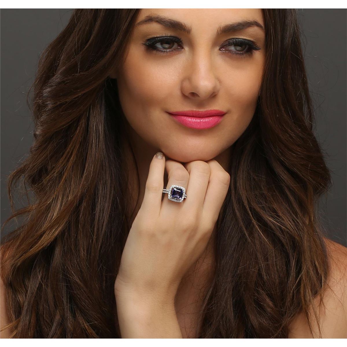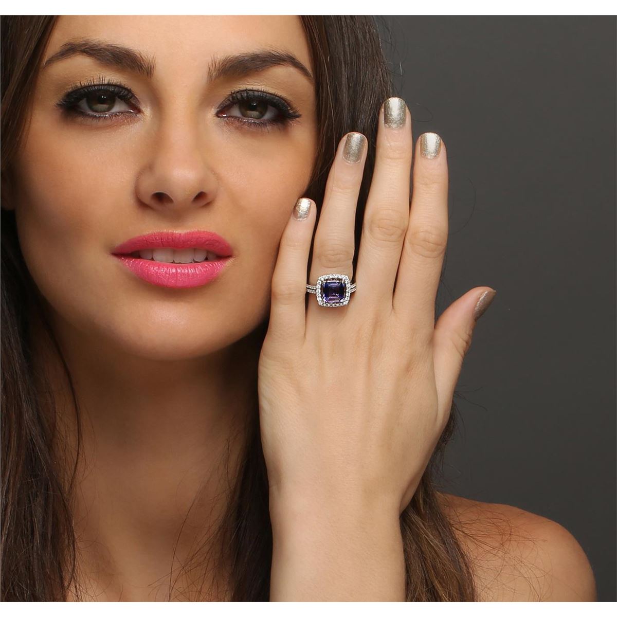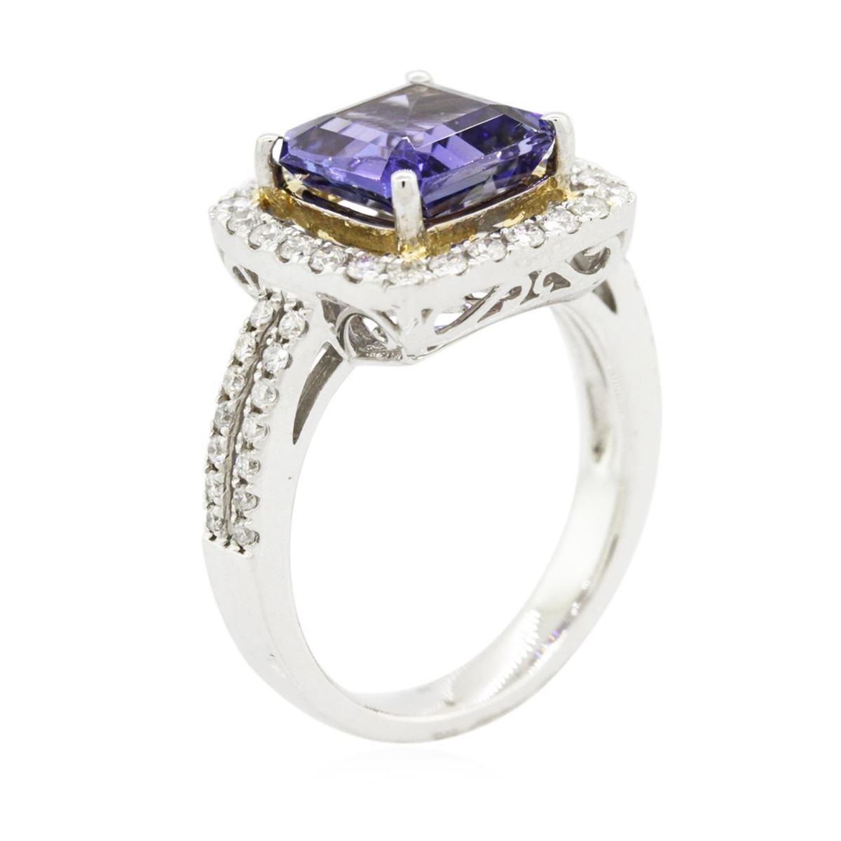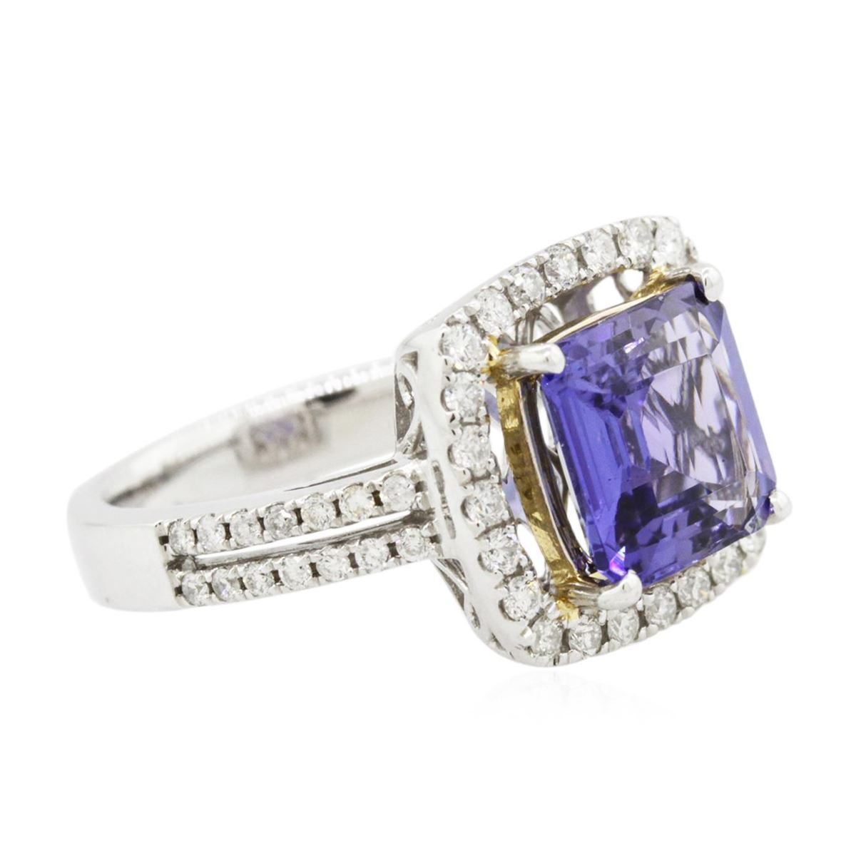 One electronically tested 14KT white gold ladies cast tanzanite & diamond ring with a bright finish. The featured tanzanite is set within a yellow gold accented basket and a diamond bezel, supported by an elaborate white gold under gallery and diamond set shoulders, completed by a three millimeter wide band. Identified with markings of "14K". Condition is new, good workmanship. Containing: One prong set square step cut natural tanzanite, measuring 8.80 x 8.50 x 4.65mm, 5% bulge factor, approximate weight of 3.06ct., clarity is slightly included, type I, medium dark, very slightly grayish, violetish blue color, (GIA vB 6/3), cut is good. Transmitting light with no distortion, transparent. Naturally occurring internal characteristics are present. Graded in the setting. Tanzanite is a very rare gemstone that is only found in the country of Tanzania. Originally discovered in 1967. Tiffany & Company, named the stone Tanzanite. It is found in the Usumburu Mountains that border the Umba Valley of northern Tanzania. Tanzanite occurs in gray, brown, violet, blue, reddish-purple, & green. The gem is interesting because of its exceptional pleochroism. Rotated in different directions a tanzanite will exhibit multiple changes of color. Tanzanite has a low tolerance to ultrasonic cleaning, and should not be cleaned using this method. Fifty-Two prong set round brilliant cut diamonds, measuring 1.55 - 1.30 x 0.87mm (depth est.) approximate total weight of 52 Stones = 0.56ct. Graded in the setting. Clarity: I-1 to I-2. Color: G - I. Total Weight of Colored Stones 3.06ct. Total Weight of Diamonds 0.56ct. Total Weight of Ring 6.40 grams. AIG Appraised at $9,500.00.
