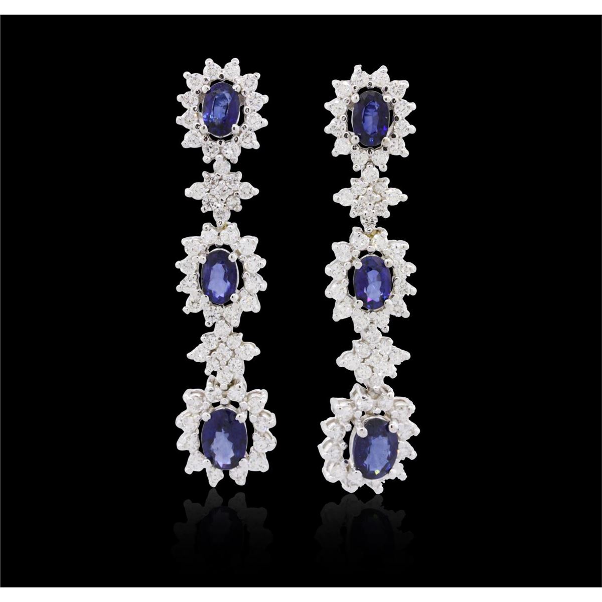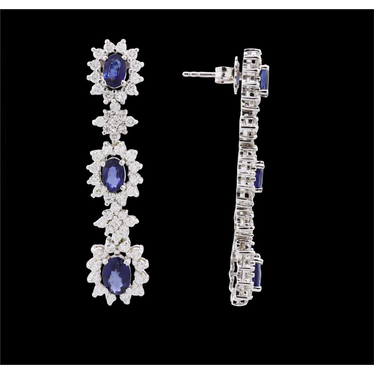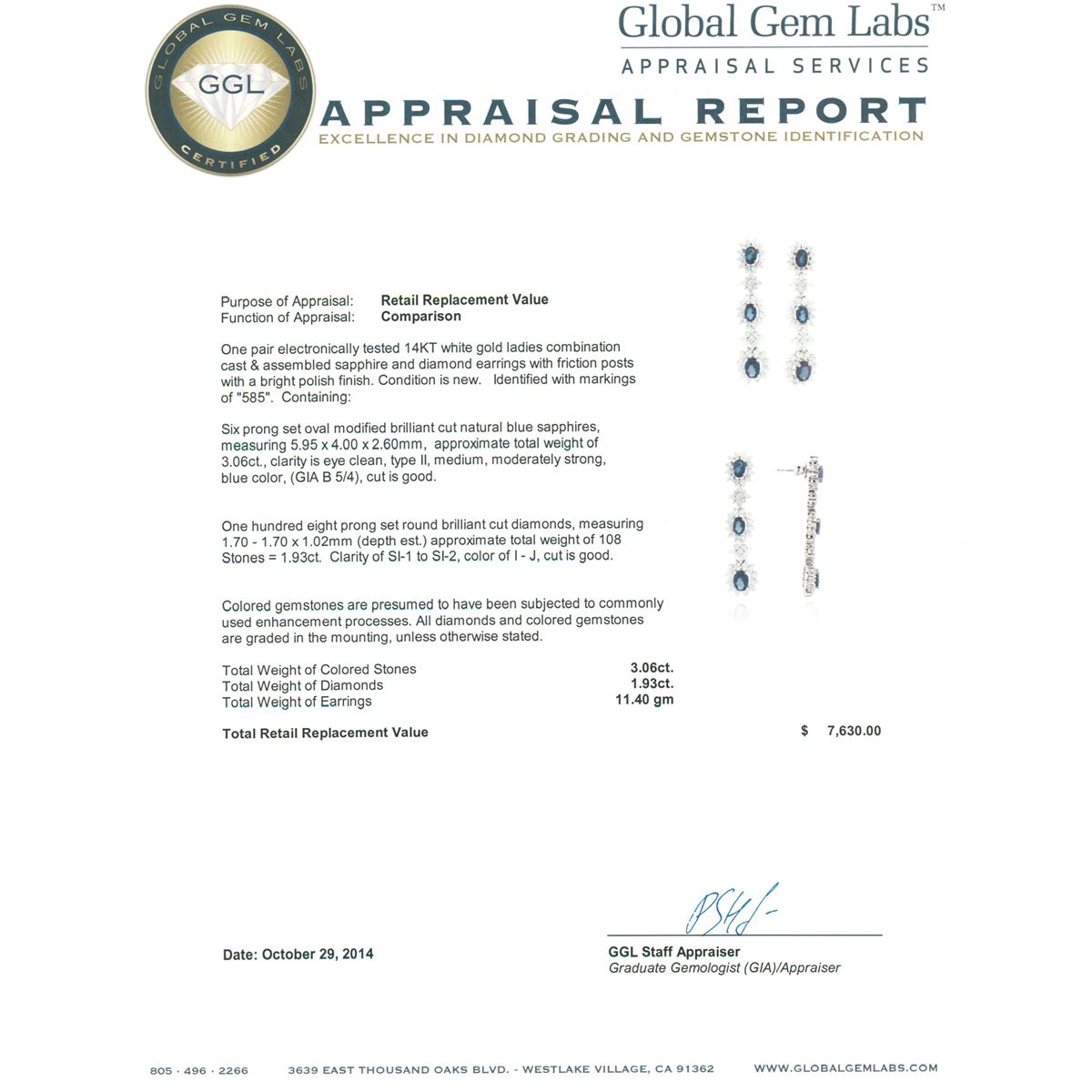 One pair electronically tested 14KT white gold ladies combination cast & assembled sapphire and diamond earrings with friction posts with a bright polish finish. Identified with markings of 585. Condition is new. Containing: Six prong set oval modified brilliant cut natural blue sapphires, measuring 5.95 x 4.00 x 2.60mm, approximate total weight of 3.06ct., clarity is eye clean, type II, medium, moderately strong, blue color, (GIA B 5/4), cut is good. One Hundred Eight prong set round brilliant cut diamonds, measuring 1.70 - 1.70 x 1.02mm (depth est.) approximate total weight of 108 Stones = 1.93ct. Clarity: SI-1 to SI-2. Color: I - J, Cut is Good. Colored gemstones are presumed to have been subjected to commonly used enhancement processes. All diamonds and colored gemstones are graded in the mounting, unless otherwise stated. Total Weight of Colored Stones 3.06ct. Total Weight of Diamonds 1.93ct. Total Weight of Earrings 11.40 grams. GGL Appraised at $7,630.00.