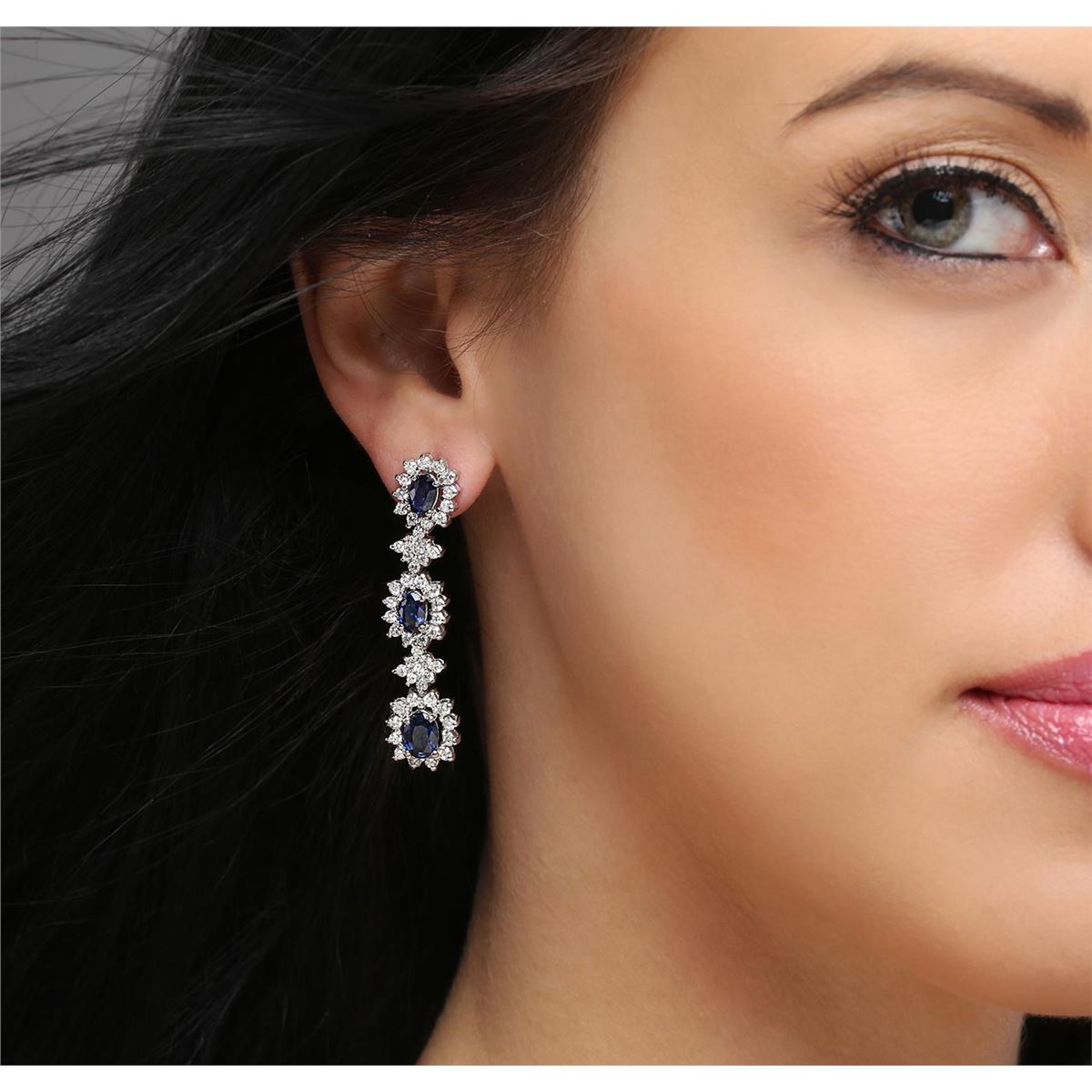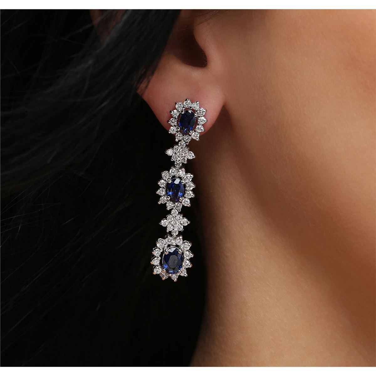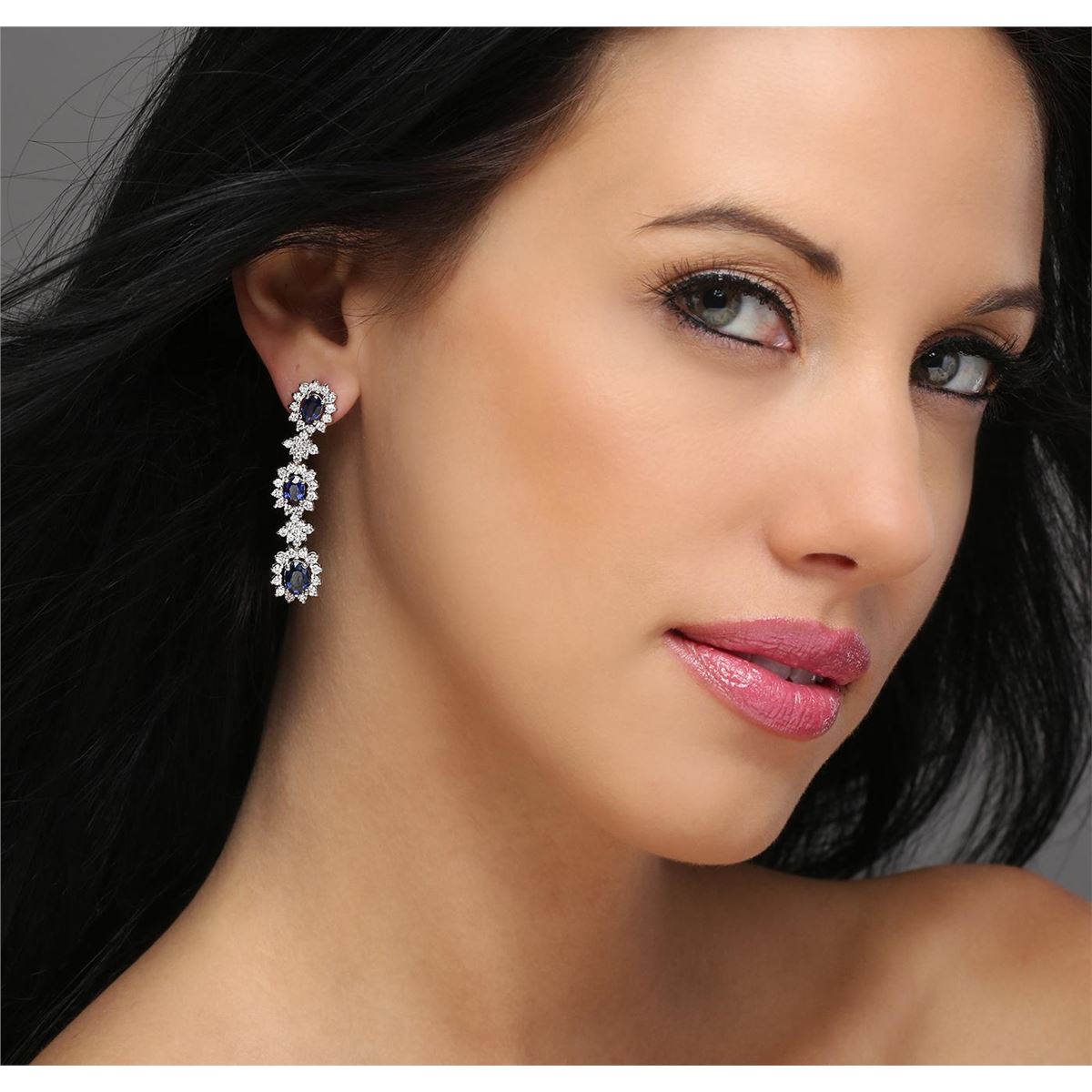 One pair electronically tested 14KT white gold ladies combination cast & assembled sapphire and diamond earrings with friction posts with a bright polish finish. Identified with markings of 585. Condition is new. Containing: Six prong set oval modified brilliant cut natural blue sapphires, measuring 5.95 x 4.00 x 2.60mm, approximate total weight of 3.06ct., clarity is eye clean, type II, medium, moderately strong, blue color, (GIA B 5/4), cut is good. One Hundred Eight prong set round brilliant cut diamonds, measuring 1.70 - 1.70 x 1.02mm (depth est.) approximate total weight of 108 Stones = 1.93ct. Clarity: SI-1 to SI-2. Color: I - J, Cut is Good. Colored gemstones are presumed to have been subjected to commonly used enhancement processes. All diamonds and colored gemstones are graded in the mounting, unless otherwise stated. Total Weight of Colored Stones 3.06ct. Total Weight of Diamonds 1.93ct. Total Weight of Earrings 11.40 grams. GGL Appraised at $7,630.00.