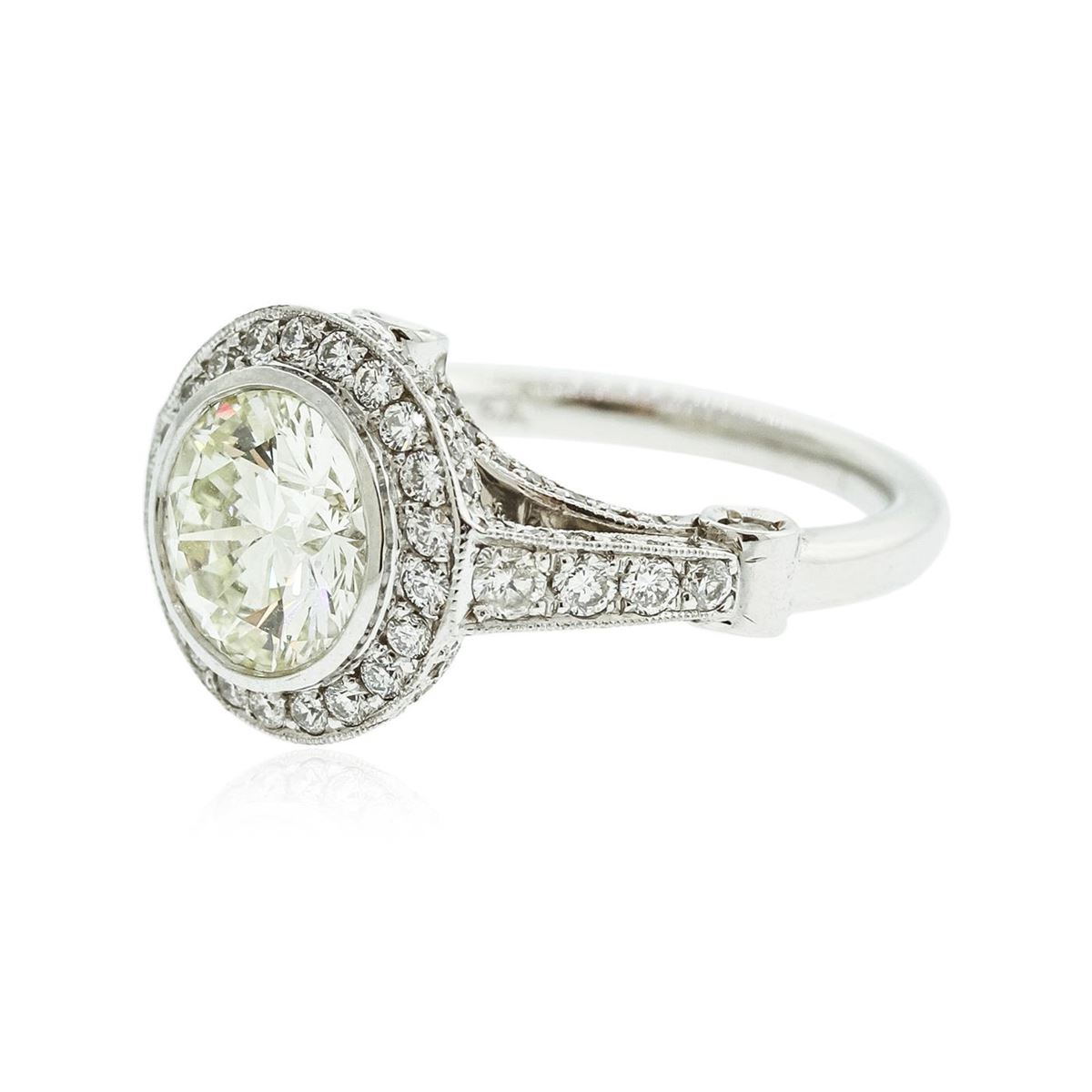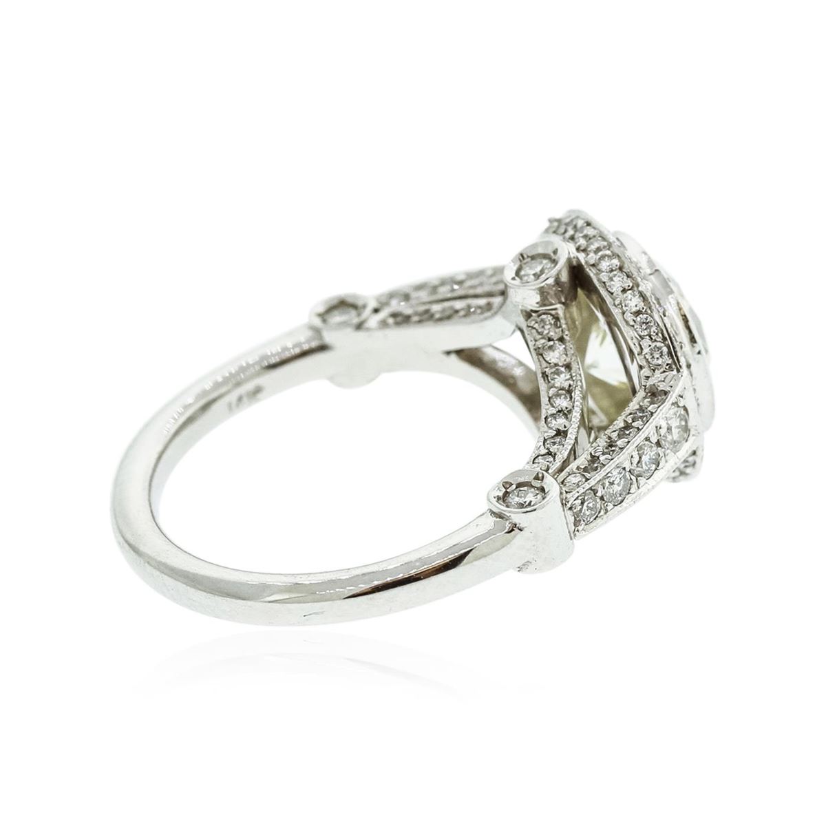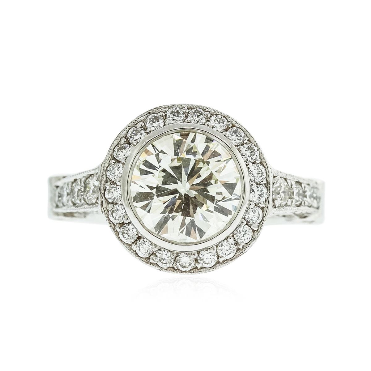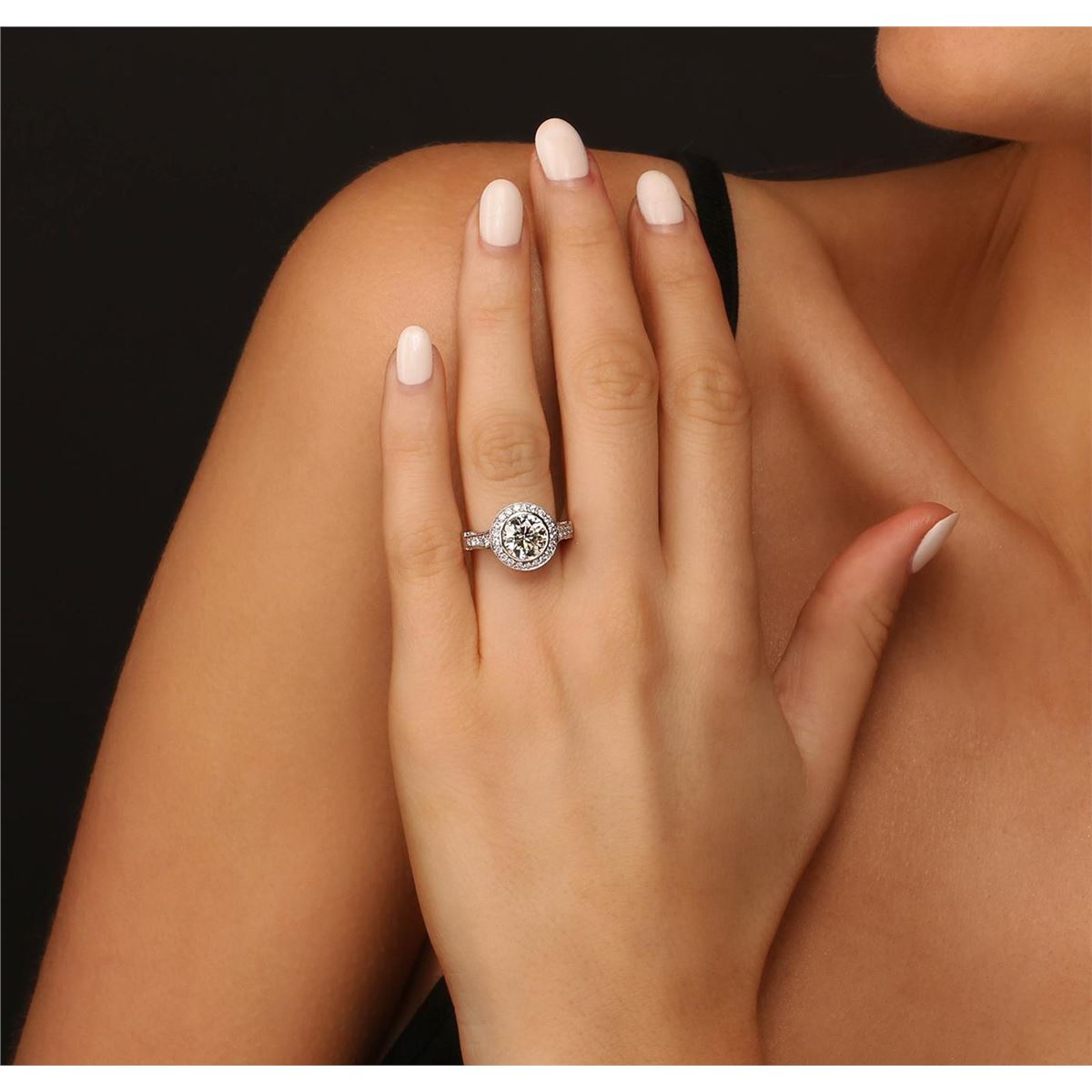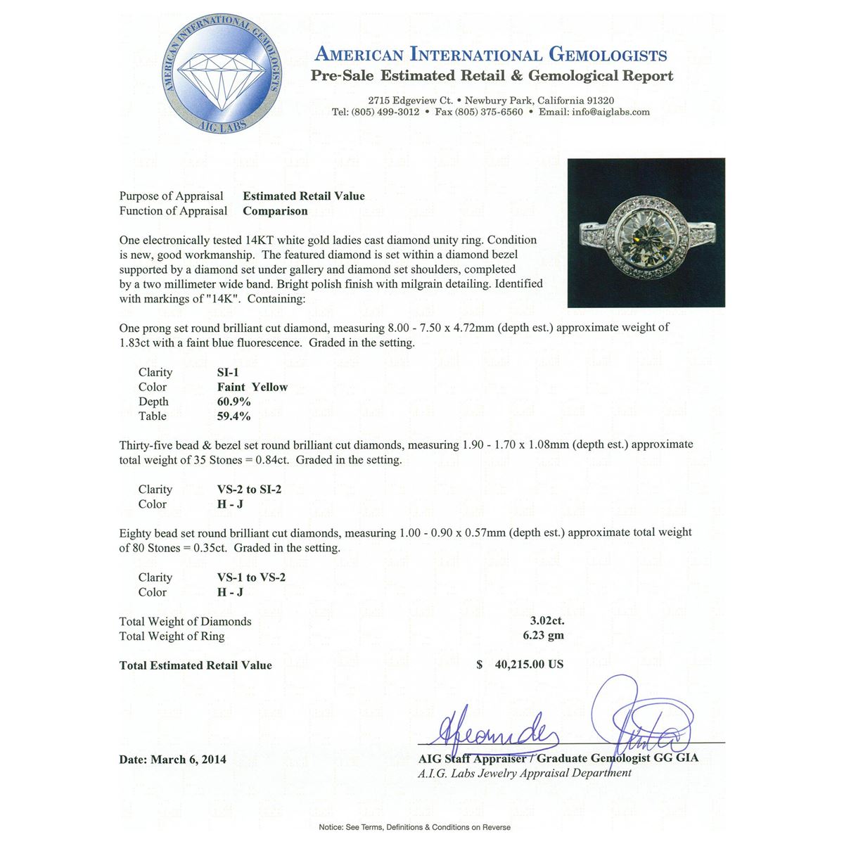 One electronically tested 14KT white gold ladies cast diamond unity ring. Condition is new, good workmanship. The featured diamond is set within a diamond bezel supported by a diamond set under gallery and diamond set shoulders, completed by a two millimeter wide band. Bright polish finish with milgrain detailing. Identified with markings of "14K". Containing: One prong set round brilliant cut diamond, measuring 8.00 - 7.50 x 4.72mm (depth est.) approximate weight of 1.83ct with a faint blue fluorescence. Graded in the setting. Clarity: SI-1. Depth: 60.9%. Table 59.4%. Thirty-Five bead & bezel set round brilliant cut diamonds, measuring 1.90 - 1.70 x 1.08mm (depth est.) approximate. Total Weight of 35 Stones = 0.84ct. Graded in the setting. Clarity: VS-2 to SI-2. Color: H - J Eighty bead set round brilliant cut diamonds, measuring 1.00 - 0.90 x 0.57mm (depth est.) approximate. Total Weight of 80 Stones = 0.35ct. Graded in the setting. Clarity: VS-1 to VS-2. Color: H - J. Total Weight of Diamonds 3.02ct. Total Weight of Ring 6.23 grams. AIG Appraised at $40,215.00.