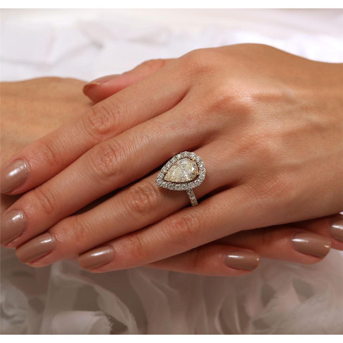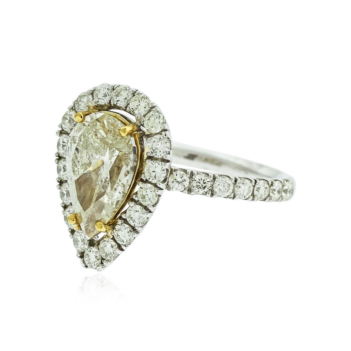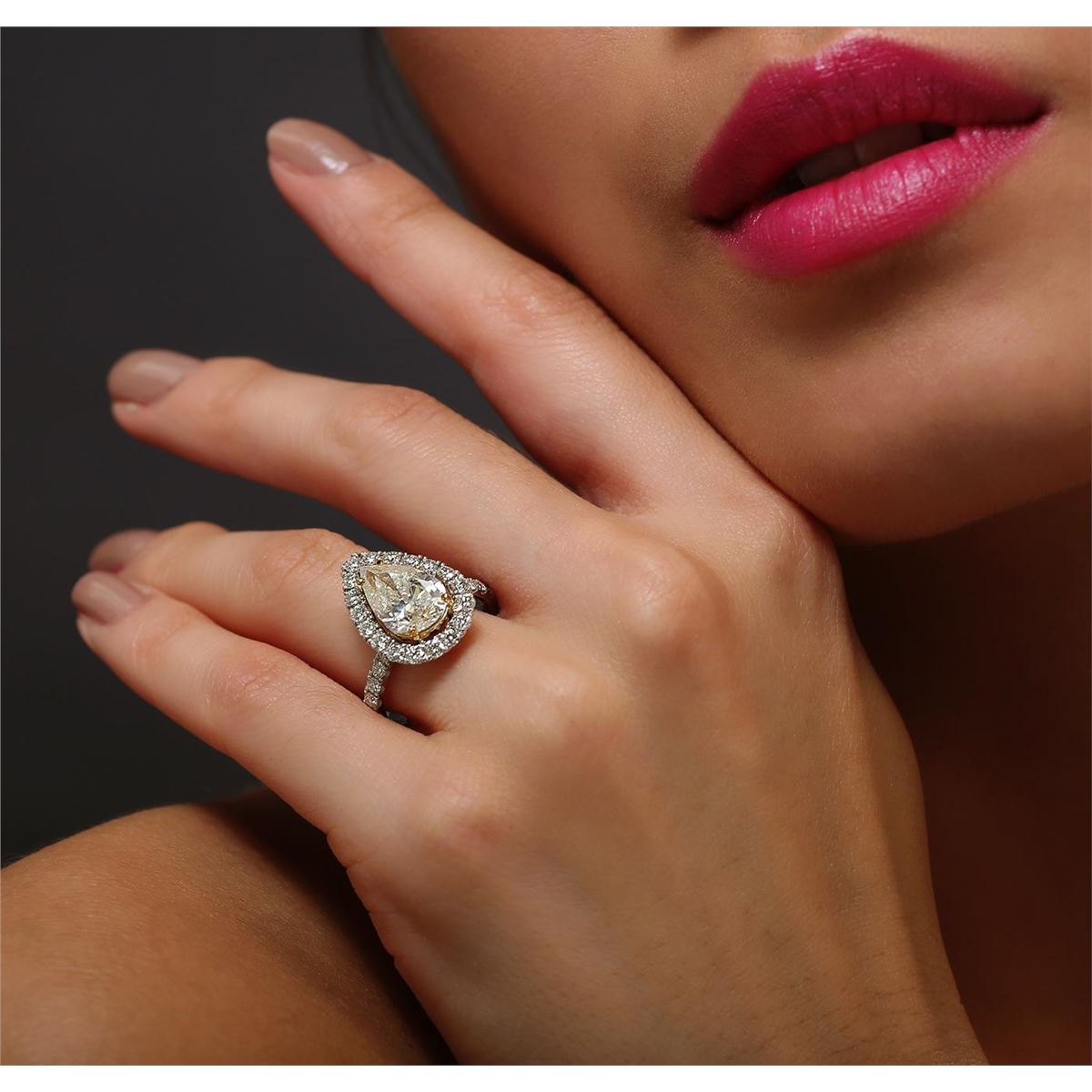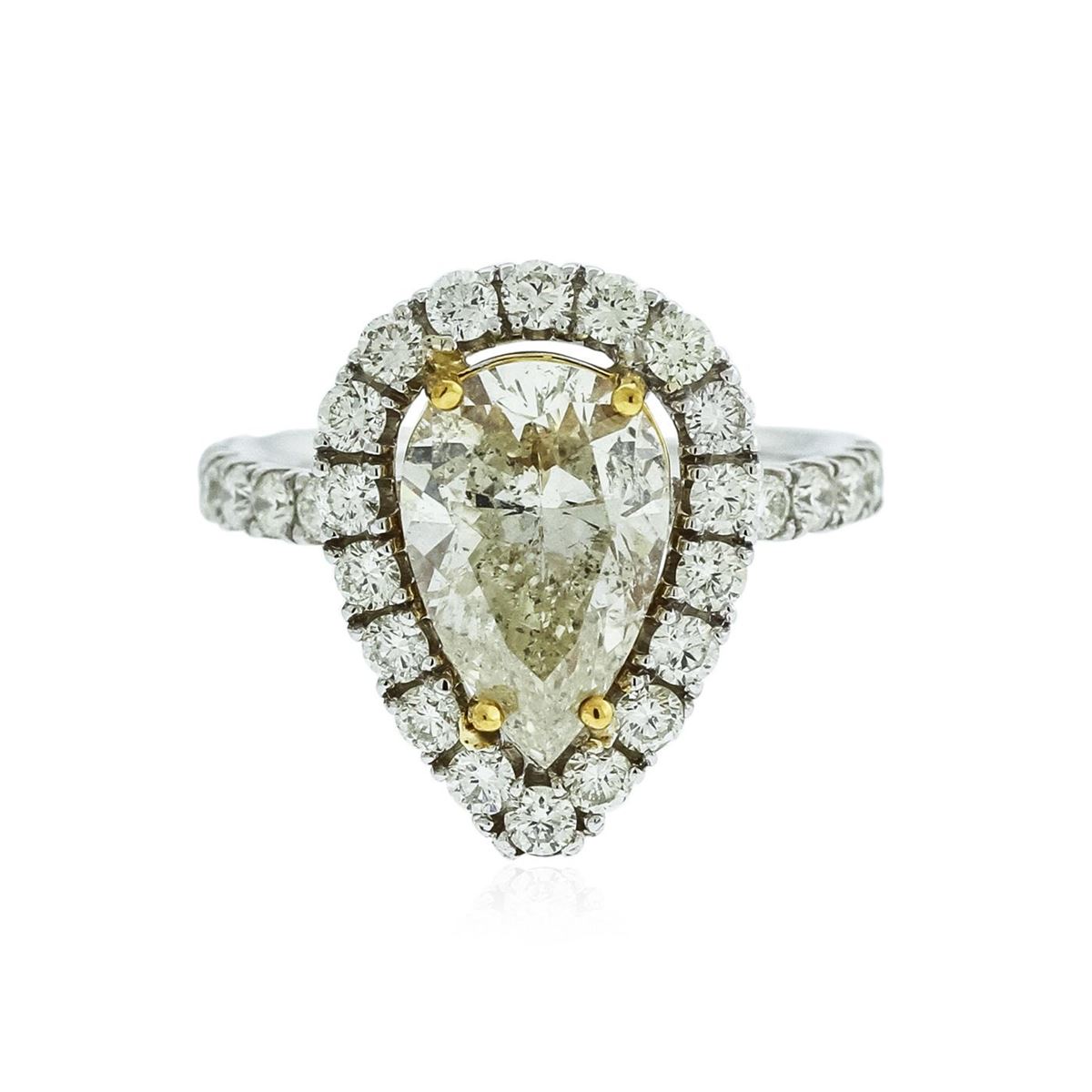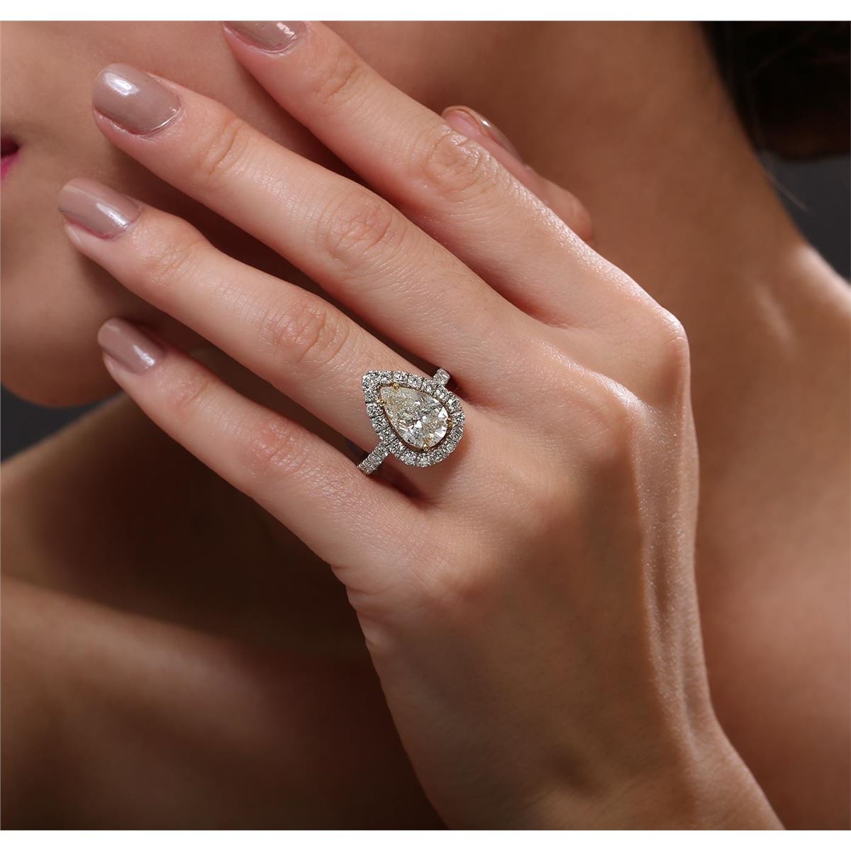One electronically tested 14KT white gold ladies cast & assembled diamond unity ring with a bright polish finish. Condition is new, good workmanship. The featured diamond is set within a yellow gold basket and placed within a diamond bezel. The ring is supported by diamond set shoulders, completed by a two millimeter wide band. Containing: One prong set pear shaped cut diamond, measuring 12.20 x 7.90 x 5.00mm (depth est.), 5.00% GTCF approximate weight of 3.07ct. Diamond Grading Report attached. Graded in the setting. Clarity I-1. Color L. Depth 63.3%. Table 59.5%. Thirty-two prong set round brilliant cut diamonds, measuring 2.20 - 2.10 x 1.29mm (depth est.) approximate total weight of 32 Stones = 1.18ct. Graded in the setting. Clarity VS-1 to SI-1. Color H - J. Total Weight of Diamonds 4.25ct. Total Weight of Ring 6.10gm. AIG Appraised at $38,150.00.