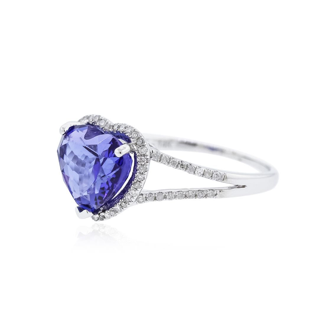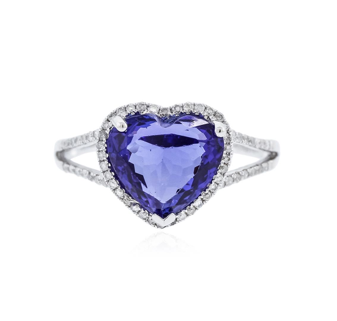 One electronically tested 14KT white gold ladies cast tanzanite and diamond ring with a split shank with a bright polish finish. Trademark is Orianne. Identified with markings of "14K". Condition is new. Containing: One prong set heart modified brilliant cut natural tanzanite, measuring 8.23 x 9.98 x 5.73mm, approximate weight of 3.07ct., clarity is eye clean, type I, medium, moderately strong, violetish blue color, (GIA vB 5/4), cut is good. Sixty-Eight prong set round brilliant cut diamonds, measuring 1.00 - 1.00 x 0.60mm (depth est.) approximate total weight of 68 Stones = 0.25ct. Clarity: I-1 to I-2. Color: I - J. All diamonds and colored gemstones are graded in the mounting, unless otherwise stated. Colored gemstones are presumed to have been subjected to commonly used enhancement processes. Total Weight of Colored Stones 3.07ct. Total Weight of Diamonds 0.25ct. Total Weight of Ring 3.00 grams. GGL Appraised at $4,035.00.