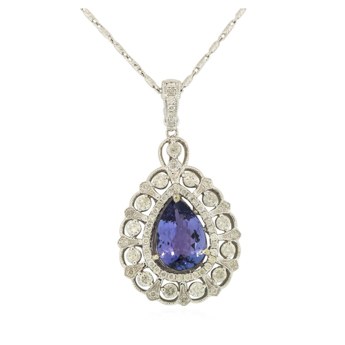 One electronically tested 14KT white gold cast & assembled tanzanite and diamond pendant/enhancer with chain. The pendant/enhancer features a tanzanite set within a diamond lattice gallery, completed by a diamond set snap-locking bail with safety. The pendant/enhancer is supported by an eighteen inch length 14KT white gold designer style chain, terminating in a lobster claw clasp. Bright polish finish with milgrain detailing. Trademark is Orianne. Identified with markings of "14K". Condition is new, good workmanship. Containing: One prong set pear brilliant cut natural tanzanite, measuring 12.00 x 8.20 x 4.40mm, 6% bulge factor, approximate weight of 3.07ct., clarity is eye clean, type I, medium dark, very slightly grayish, bluish violet color, (GIA bV 6/3), cut is good. Transmitting light with no distortion, transparent. Graded in the setting. Tanzanite is a very rare gemstone that is only found in the country of Tanzania. Originally discovered in 1967. Tiffany & Company, named the stone Tanzanite. It is found in the Usumburu Mountains that border the Umba Valley of northern Tanzania. Tanzanite occurs in gray, brown, violet, blue, reddish-purple, & green. The gem is interesting because of its exceptional pleochroism. Rotated in different directions a tanzanite will exhibit multiple changes of color. Tanzanite has a low tolerance to ultrasonic cleaning, and should not be cleaned using this method. Thirteen prong set round brilliant cut diamonds, measuring 2.50 - 2.40 x 1.47mm (depth est.) approximate total weight of 13 Stones = 0.80ct. Graded in the setting. Clarity: I-1 to I-2. Color: H - J Fifty prong set round brilliant cut diamonds, measuring 1.30 - 1.20 x 0.75mm (depth est.) approximate total weight of 50 Stones = 0.45ct. Graded in the setting. Clarity: I-1 to I-2. Color: H - J. Total Weight of Colored Stones 3.07ct. Total Weight of Diamonds 1.25ct. Total Weight of Pendant/Enhancer With Chain 8.72 grams. AIG Appraised at $12,010.00.