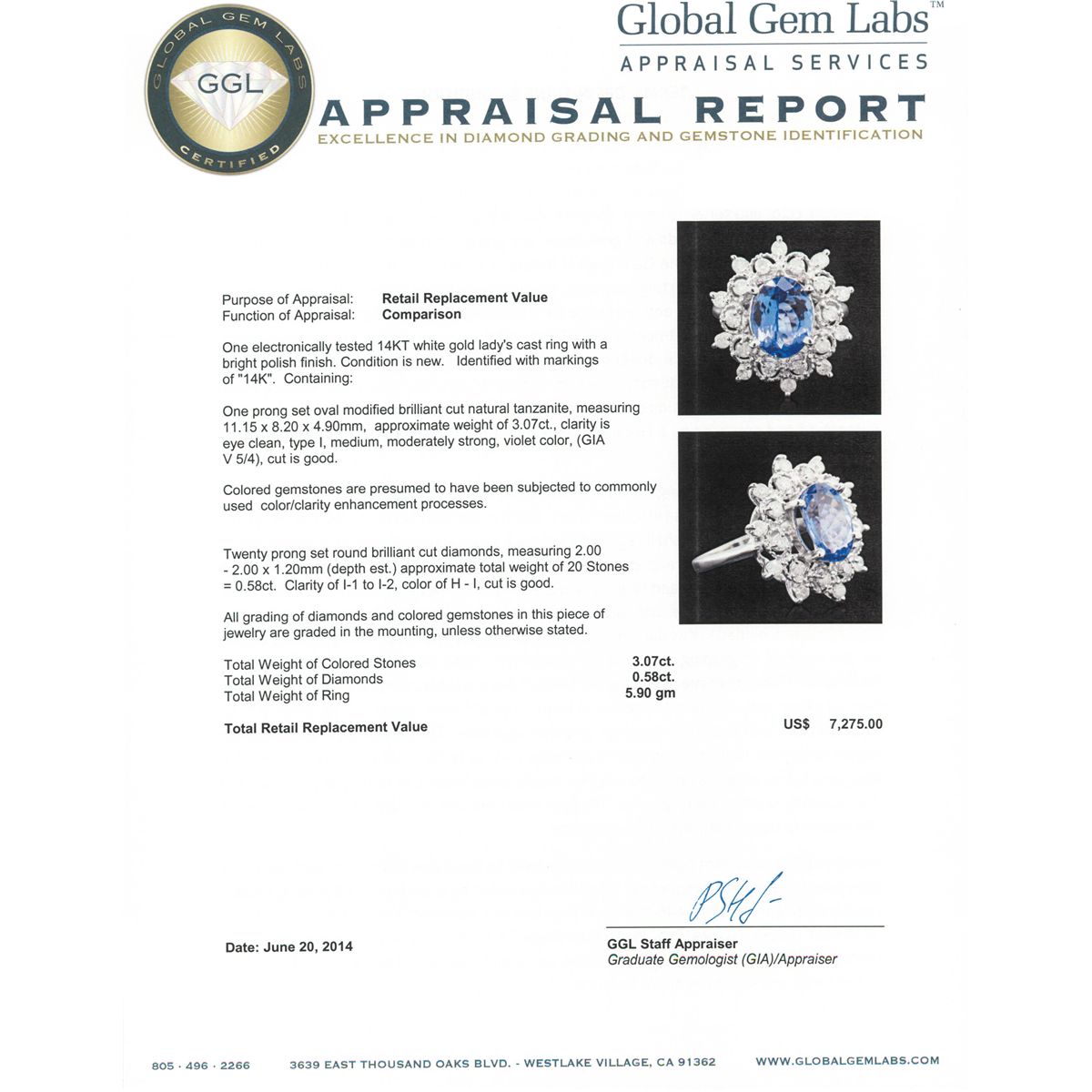 One electronically tested 14KT white gold Ladies cast ring with a bright polish finish. Condition is new. Identified with markings of "14K". Containing: One prong set oval modified brilliant cut natural tanzanite, measuring 11.15 x 8.20 x 4.90mm, approximate weight of 3.07ct., clarity is eye clean, type I, medium, moderately strong, violet color, (GIA V 5/4), cut is good. Colored gemstones are presumed to have been subjected to commonly used color/clarity enhancement processes. Twenty prong set round brilliant cut diamonds, measuring 2.00 - 2.00 x 1.20mm (depth est.) approximate. Total Weight of 20 Stones = 0.58ct. Clarity: I-1 to I-2. Color: H - I, Cut is Good. All grading of diamonds and colored gemstones in this piece of jewelry are graded in the mounting, unless otherwise stated. Total Weight of Colored Stones 3.07ct. Total Weight of Diamonds 0.58ct. Total Weight of Ring 5.90 grams. GGL Appraised at $7,275.00.
