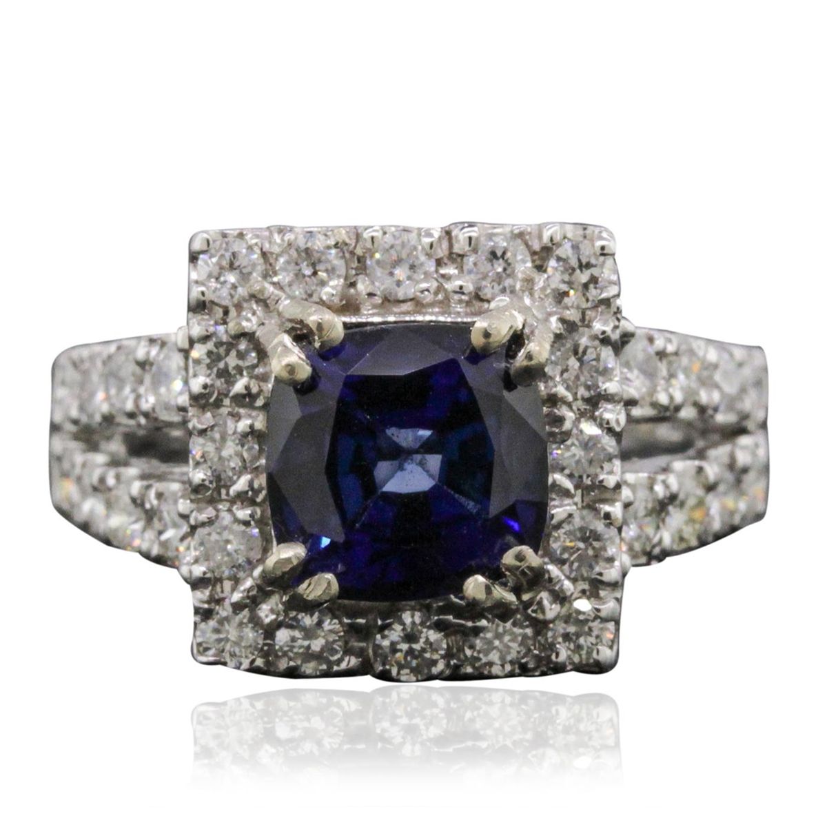 One electronically tested 14KT white gold ladies cast sapphire and diamond ring with a bright polish finish. The featured sapphire is set within a diamond bezel supported by diamond set split shoulders, completed by a two and one-half millimeter wide band. Identified with markings of "K14". Condition is new, good workmanship. Containing: One prong set square cushion brilliant cut natural blue sapphire, measuring 7.85 x 7.75 x 5.08mm, 6% bulge factor, approximate weight of 3.08ct., clarity is eye clean, type II, dark, very slightly grayish, blue color, (GIA B 7/3), cut is good. Transmitting light with no distortion, transparent. Indications of laboratory high temperature diffusion treatment. Graded in the setting. Thirty-Two prong set round brilliant cut diamonds, measuring 2.10 - 2.00 x 1.23mm (depth est.) approximate total weight of 32 Stones = 1.10ct. Graded in the setting. Clarity: SI-2 to I-2. Color: G - I. Total Weight of Colored Stones 3.08ct. Total Weight of Diamonds 1.10ct. Total Weight of Ring 7.33 grams. AIG Appraised at $5,840.00.