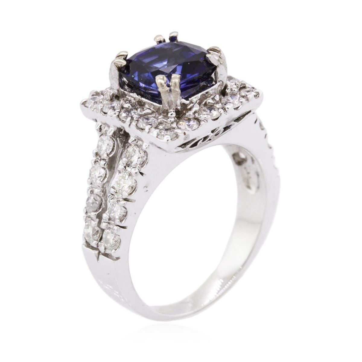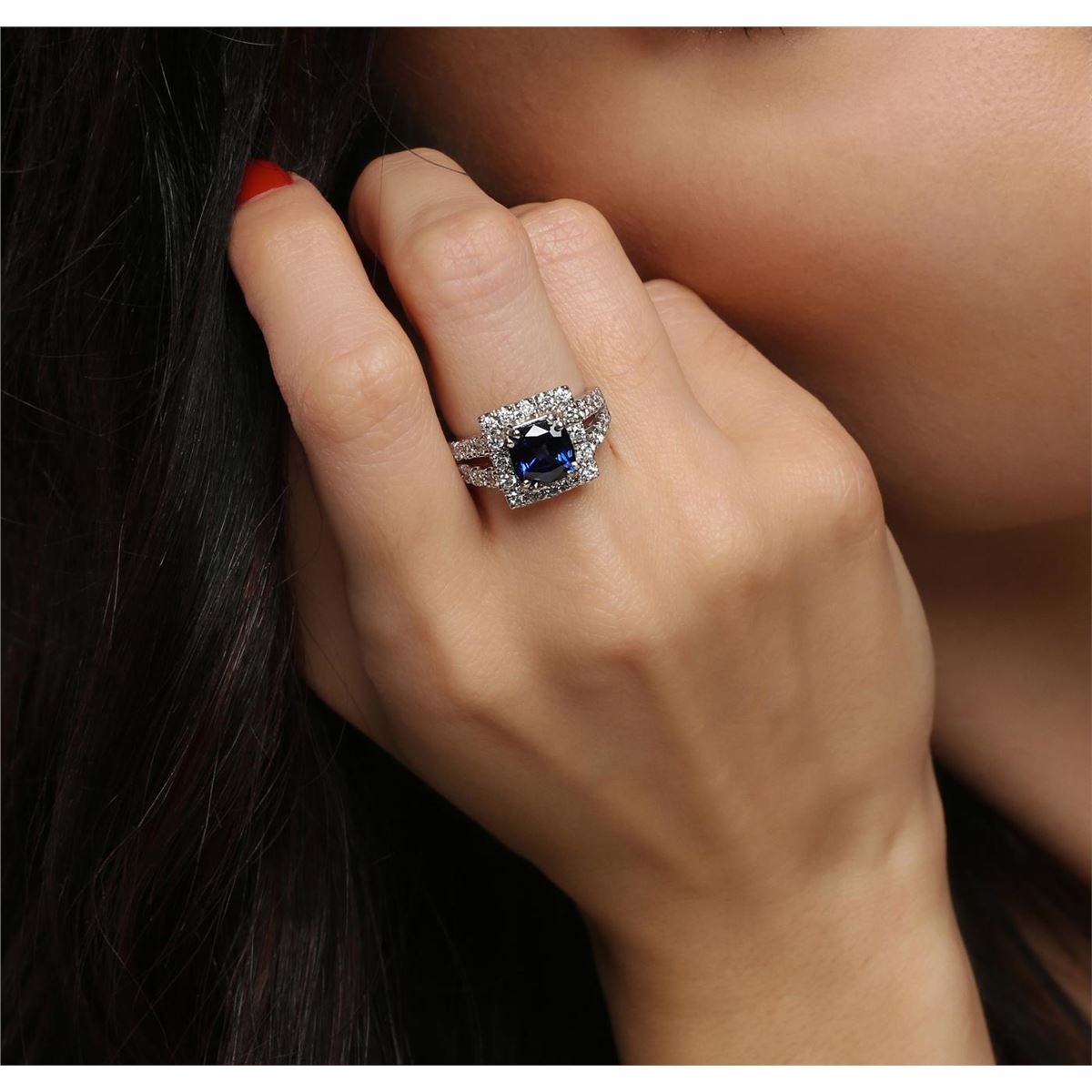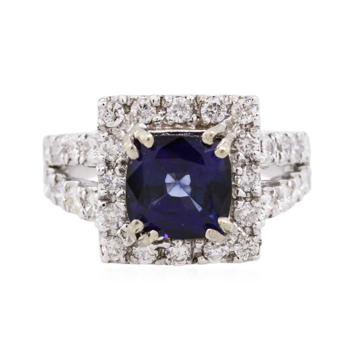 One electronically tested 14KT white gold ladies cast sapphire and diamond ring with a bright polish finish. The featured sapphire is set within a diamond bezel supported by diamond set split shoulders, completed by a two and one-half millimeter wide band. Identified with markings of "K14". Condition is new, good workmanship. Containing: One prong set square cushion brilliant cut natural blue sapphire, measuring 7.85 x 7.75 x 5.08mm, 6% bulge factor, approximate weight of 3.08ct., clarity is eye clean, type II, dark, very slightly grayish, blue color, (GIA B 7/3), cut is good. Transmitting light with no distortion, transparent. Indications of laboratory high temperature diffusion treatment. Graded in the setting. Thirty-Two prong set round brilliant cut diamonds, measuring 2.10 - 2.00 x 1.23mm (depth est.) approximate total weight of 32 Stones = 1.10ct. Graded in the setting. Clarity: SI-2 to I-2. Color: G - I. Total Weight of Colored Stones 3.08ct. Total Weight of Diamonds 1.10ct. Total Weight of Ring 7.33 grams. AIG Appraised at $5,840.00.