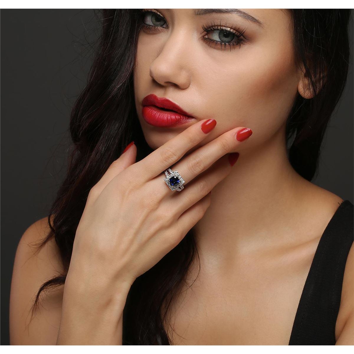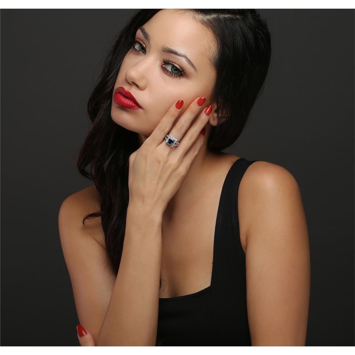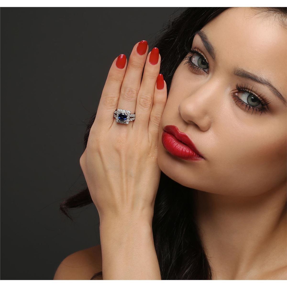 One electronically tested 14KT white gold ladies cast sapphire and diamond ring with a bright polish finish. The featured sapphire is set within a diamond bezel supported by diamond set split shoulders, completed by a two and one-half millimeter wide band. Identified with markings of "K14". Condition is new, good workmanship. Containing: One prong set square cushion brilliant cut natural blue sapphire, measuring 7.85 x 7.75 x 5.08mm, 6% bulge factor, approximate weight of 3.08ct., clarity is eye clean, type II, dark, very slightly grayish, blue color, (GIA B 7/3), cut is good. Transmitting light with no distortion, transparent. Indications of laboratory high temperature diffusion treatment. Graded in the setting. Thirty-Two prong set round brilliant cut diamonds, measuring 2.10 - 2.00 x 1.23mm (depth est.) approximate total weight of 32 Stones = 1.10ct. Graded in the setting. Clarity: SI-2 to I-2. Color: G - I. Total Weight of Colored Stones 3.08ct. Total Weight of Diamonds 1.10ct. Total Weight of Ring 7.33 grams. AIG Appraised at $5,840.00.