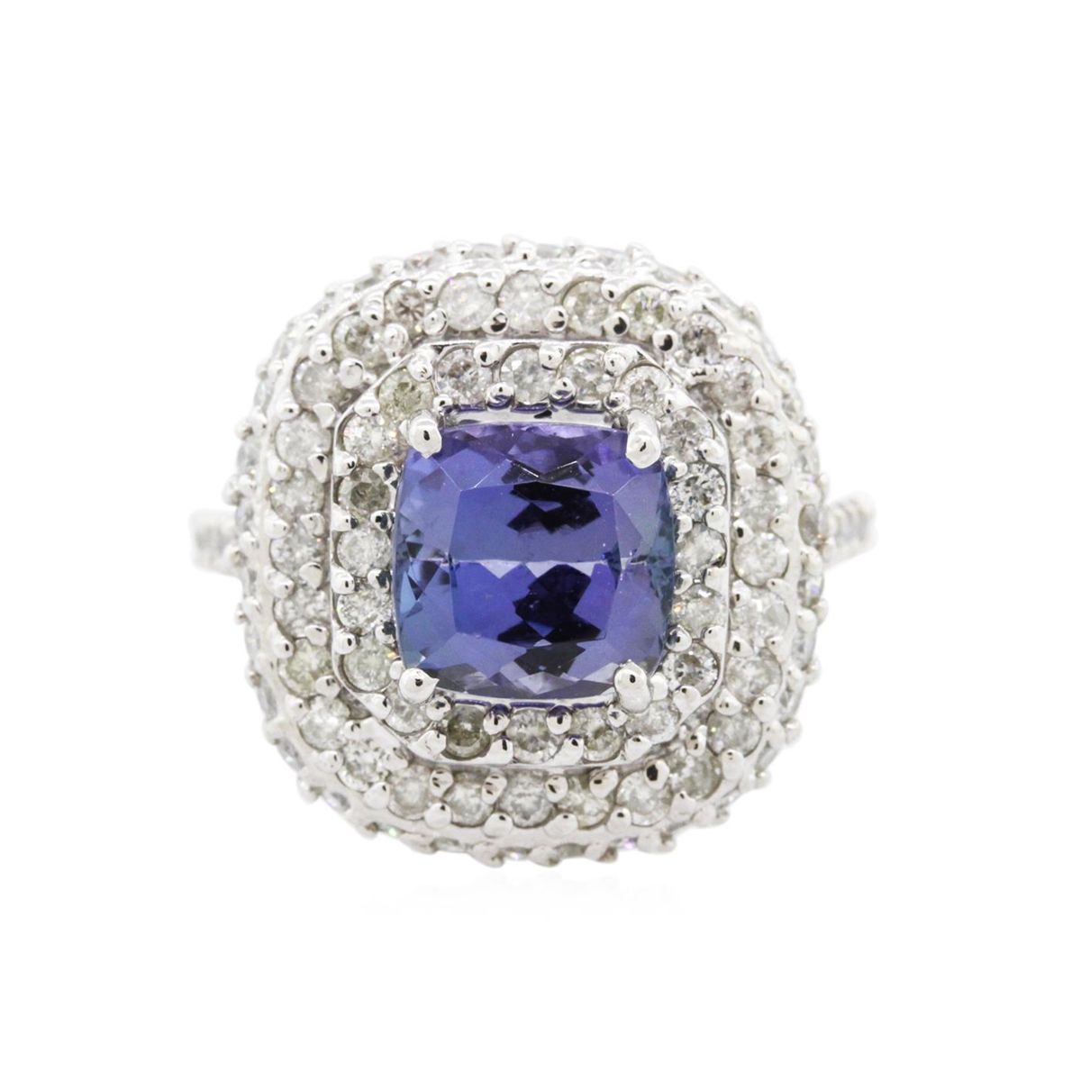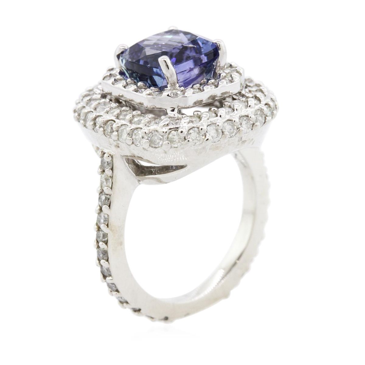 One electronically tested 14KT white gold ladies combination cast & assembled tanzanite and diamond ring with a flat shank with a bright polish finish. Identified with markings of "K14". Condition is new. Containing: One prong set square cushion modified brilliant cut natural tanzanite, measuring 8.51 x 8.37 x 5.49mm, approximate weight of 3.08ct., clarity is eye clean, type I, medium light, moderately strong, violet color, (GIA V 4/4), cut is good. One Hundred Four prong set round brilliant cut diamonds, measuring 1.70 - 1.50 x 0.96mm (depth est.) approximate total weight of 104 Stones = 1.55ct. Clarity: SI-2 to I-1. Color: I - J, Cut is Good. Colored gemstones are presumed to have been subjected to commonly used enhancement processes. All diamonds and colored gemstones are graded in the mounting, unless otherwise stated. Total Weight of Colored Stones 3.08ct. Total Weight of Diamonds 1.55ct. Total Weight of Ring 9.40 grams. GGL Appraised at $10,985.00.