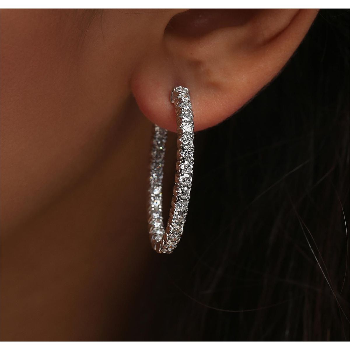One pair electronically tested 14KT white gold ladies combination cast & assembled diamond hoop earrings with a bright polish finish. Identified with markings of "14K". Condition is new. Containing: Fifty-Four prong set round brilliant cut diamonds, measuring 2.50 - 2.50 x 1.50mm (depth est.) approximate total weight of 54 Stones = 3.08ct. Clarity: SI-2 to I-1. Color: J, Cut is Good. All diamonds are graded in the mounting, unless otherwise stated. Total Weight of Diamonds 3.08ct. Total Weight of Earrings 11.40 grams. GGL Appraised at $10,355.00.