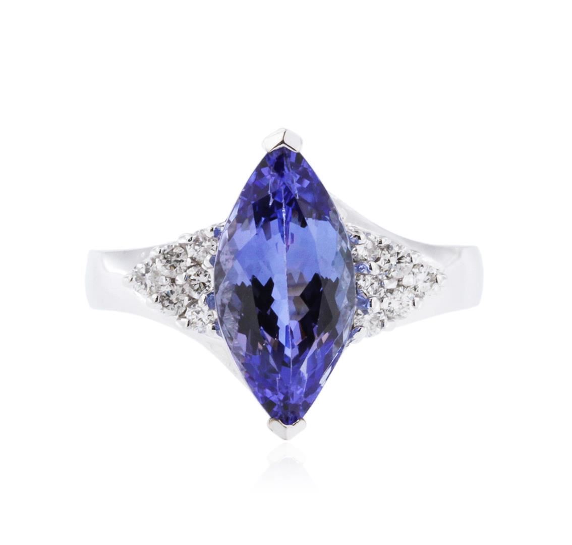 One electronically tested 14KT white gold ladies cast tanzanite and diamond ring with a bright polish finish. Identified with markings of "14K". Condition is new. Containing: One prong set marquise modified brilliant cut natural tanzanite, measuring 14.40 x 7.20 x 4.68mm, approximate weight of 3.09ct., clarity is eye clean, type I, medium light, slightly grayish, violet color, (GIA V 4/2), cut is good. Twelve prong set round brilliant cut diamonds, measuring 1.60 - 1.60 x 0.96mm (depth est.) approximate total weight of 12 Stones = 0.18ct. Clarity: SI-1. Color: H - I, Cut is Good. Colored gemstones are presumed to have been subjected to commonly used enhancement processes. All diamonds and colored gemstones are graded in the mounting, unless otherwise stated. Total Weight of Colored Stones 3.09ct. Total Weight of Diamonds 0.18ct. Total Weight of Ring 6.00 grams. GGL Appraised at $3,550.00.
