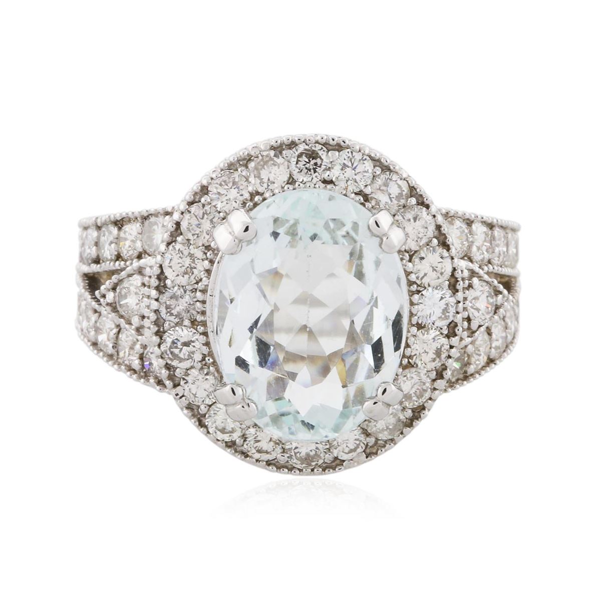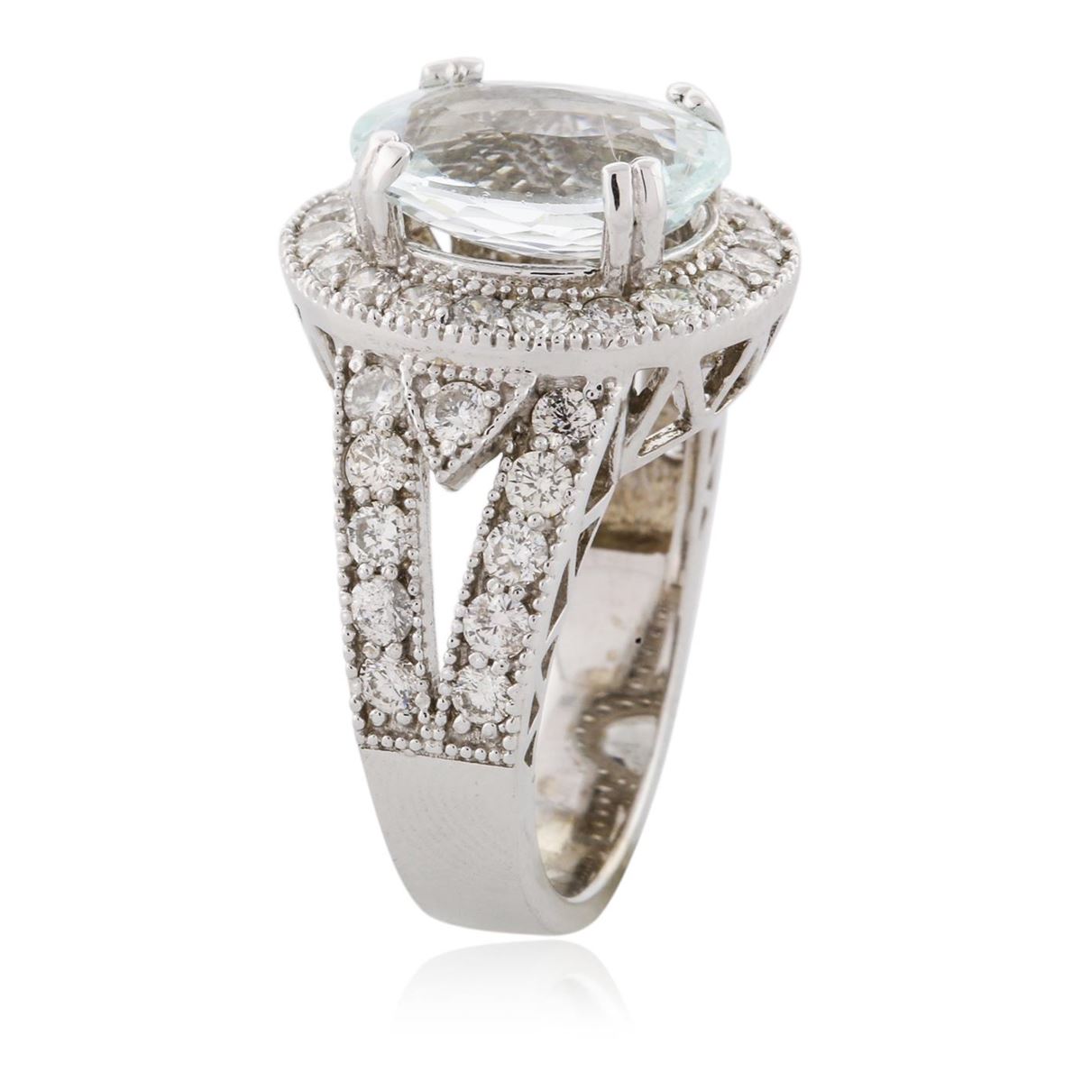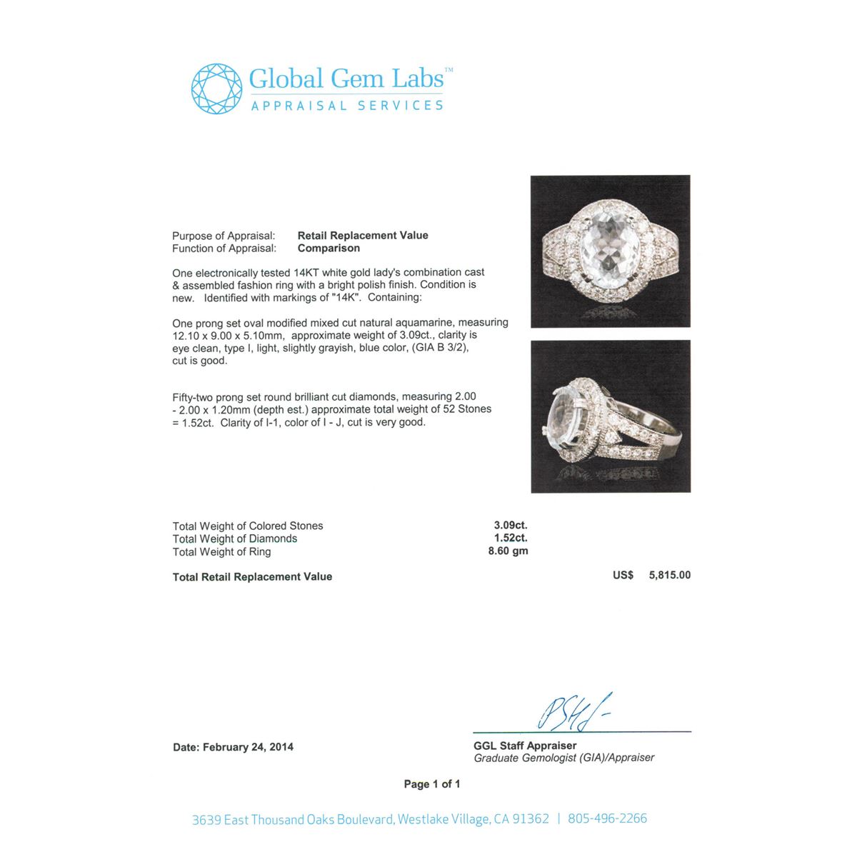 One electronically tested 14KT white gold Ladies combination cast & assembled fashion ring with a bright polish finish. Condition is new. Identified with markings of "14K". Containing: One prong set oval modified mixed cut natural aquamarine, measuring 12.10 x 9.00 x 5.10mm, approximate weight of 3.09ct., clarity is eye clean, type I, light, slightly grayish, blue color, (GIA B 3/2), cut is good. Fifty-Two prong set round brilliant cut diamonds, measuring 2.00 - 2.00 x 1.20mm (depth est.) approximate total weight of 52 Stones = 1.52ct. Clarity of I-1, Color of I - J, Cut is Very Good. Total Weight of Colored Stones 3.09ct. Total Weight of Diamonds 1.52ct. Total Weight of Ring 8.60gm. GGL Appraised at $5,815.00.