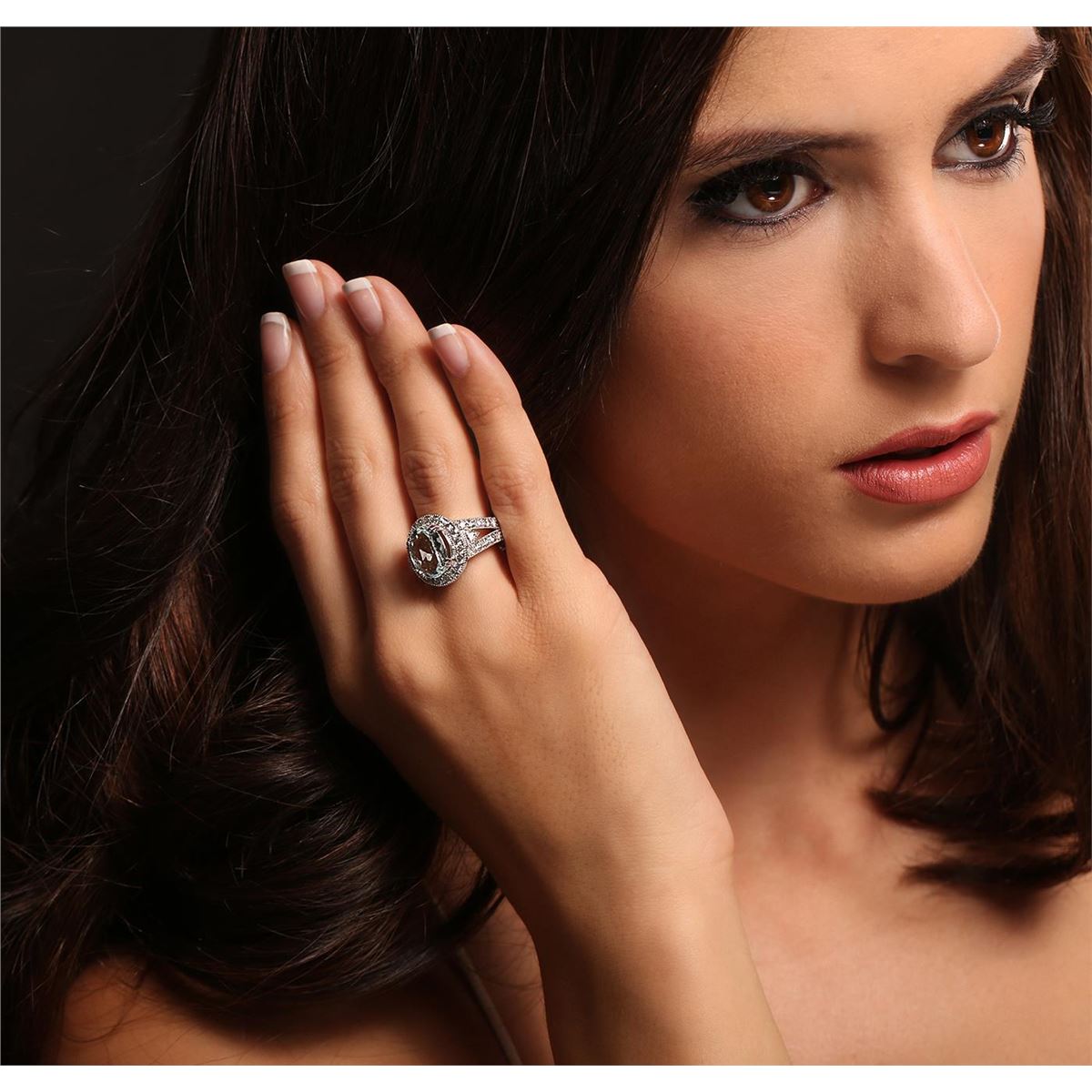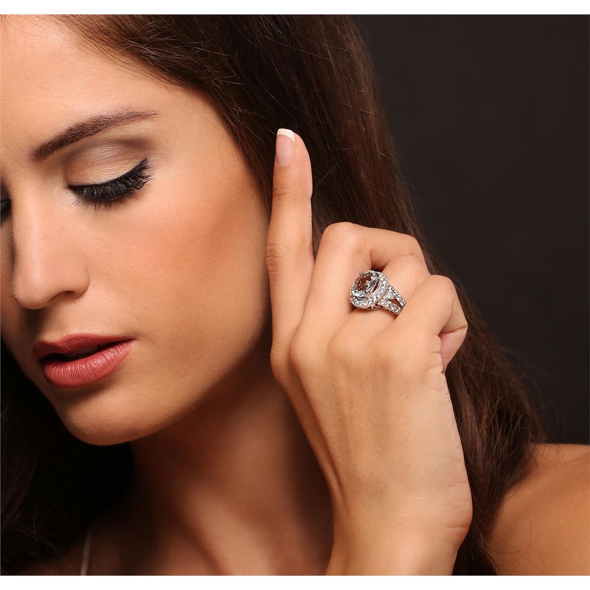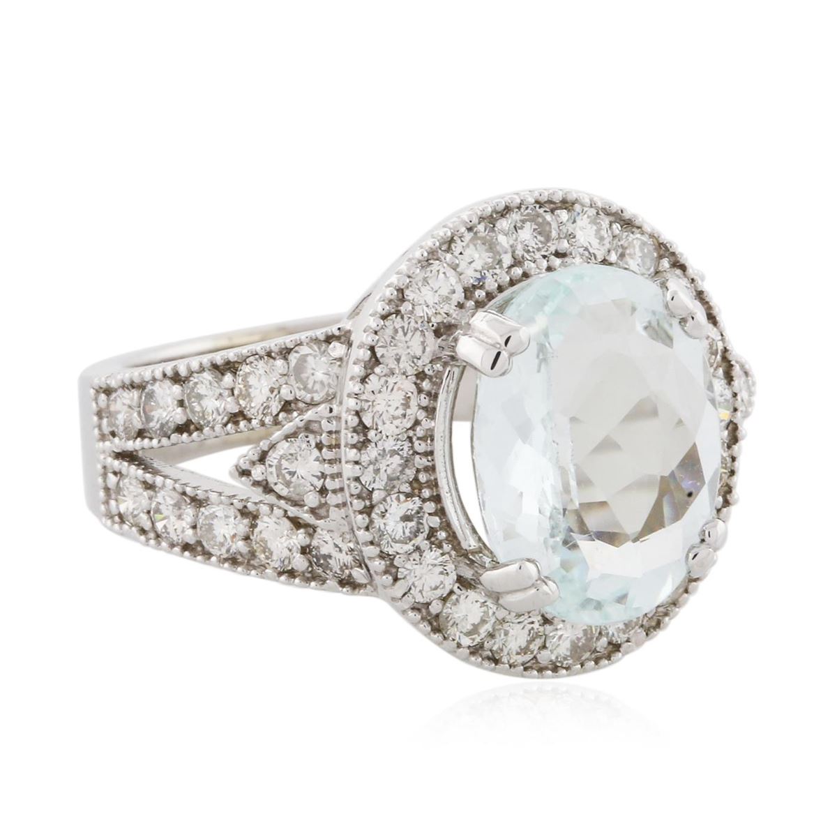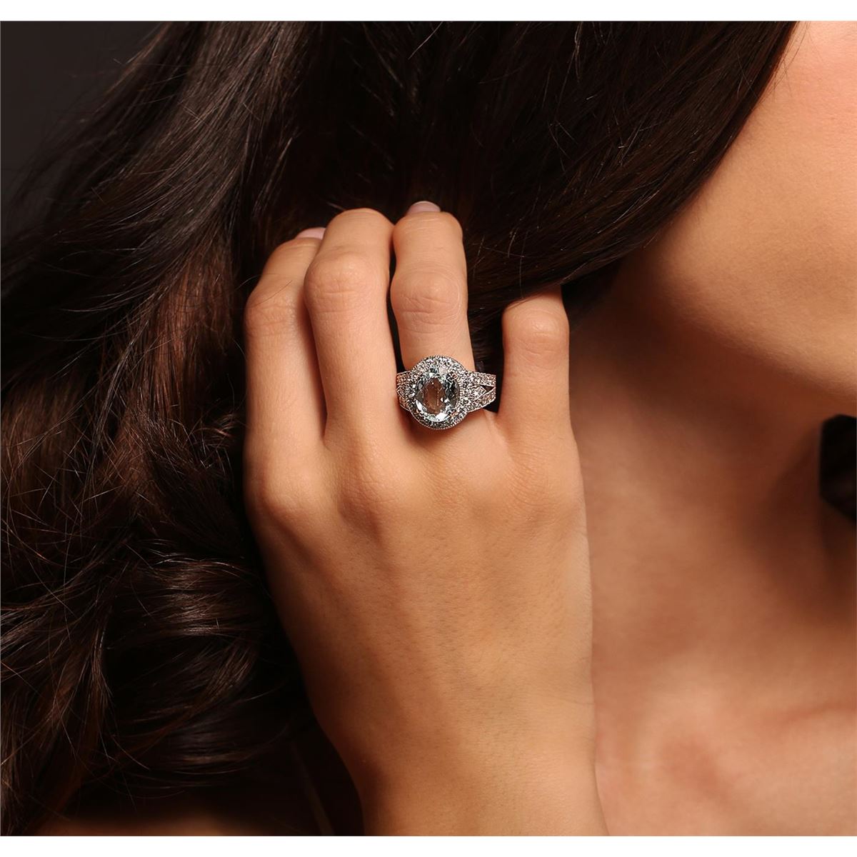One electronically tested 14KT white gold Ladies combination cast & assembled fashion ring with a bright polish finish. Condition is new. Identified with markings of "14K". Containing: One prong set oval modified mixed cut natural aquamarine, measuring 12.10 x 9.00 x 5.10mm, approximate weight of 3.09ct., clarity is eye clean, type I, light, slightly grayish, blue color, (GIA B 3/2), cut is good. Fifty-Two prong set round brilliant cut diamonds, measuring 2.00 - 2.00 x 1.20mm (depth est.) approximate total weight of 52 Stones = 1.52ct. Clarity of I-1, Color of I - J, Cut is Very Good. Total Weight of Colored Stones 3.09ct. Total Weight of Diamonds 1.52ct. Total Weight of Ring 8.60gm. GGL Appraised at $5,815.00.