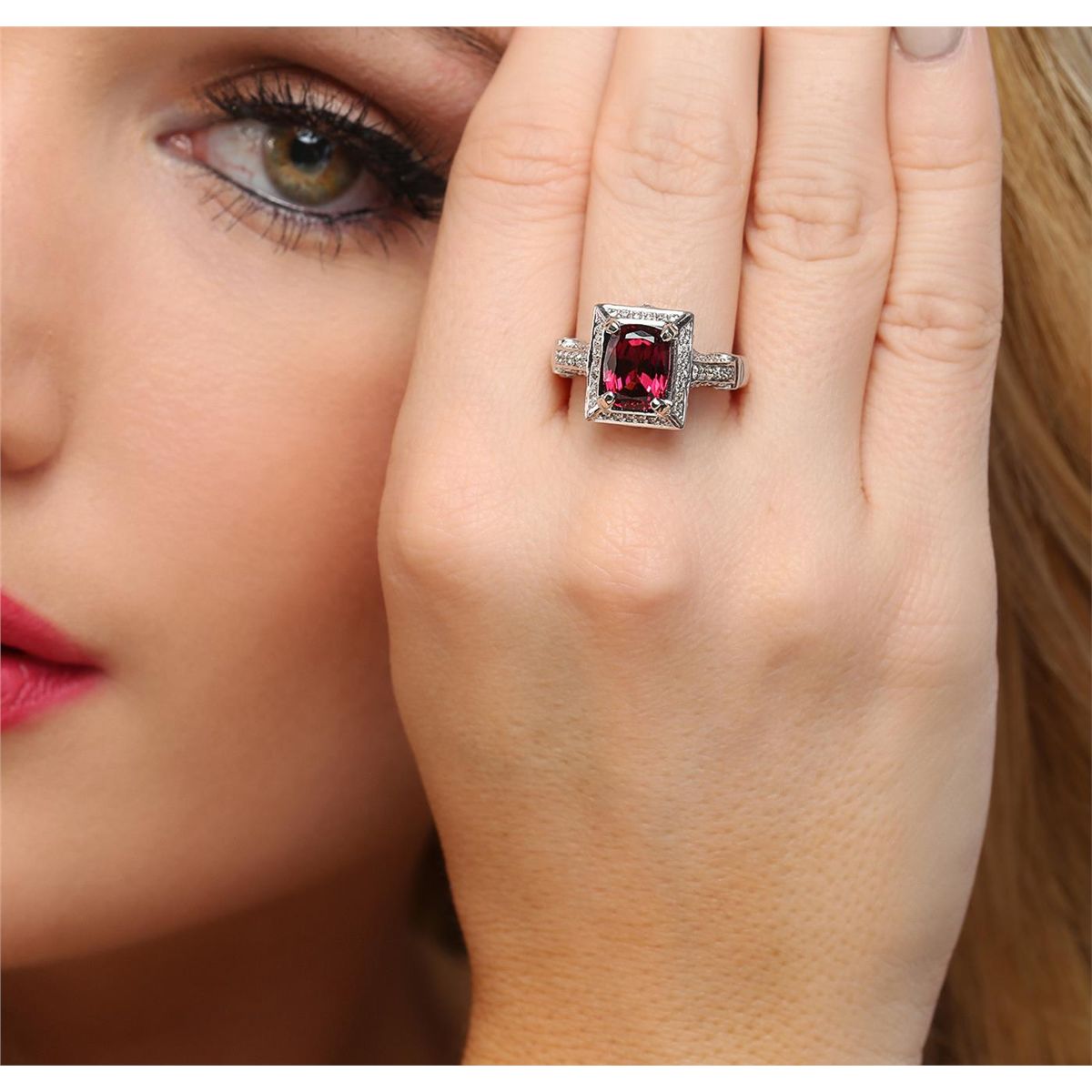 One electronically tested 14KT white gold ladies cast rhodolite garnet and diamond ring with a bright polish finish. The featured rhodolite garnet is set within a diamond bezel supported by a diamond set under gallery and diamond set shoulders, completed by a three millimeter wide band. Identified with markings of "14K". Condition is new, good workmanship. Containing: One prong set rectangular cushion mixed cut natural rhodolite garnet, measuring 9.10 x 6.90 x 5.20mm, 6%. bulge factor, approximate weight of 3.09ct., clarity is eye clean, type II, dark, very slightly brownish, strongly purplish red color, (GIA stpR 7/3), cut is good. Transmitting light with no distortion, transparent. Refractive index testing results of 1.76. This is a conclusive result for pyrope-almandite garnet(rhodolite). Graded in the setting. Six bezel set round brilliant cut diamonds, measuring 2.40 - 2.40 x 1.44mm (depth est.) approximate total weight of 6 Stones = 0.35ct. Graded in the setting. Clarity: SI-1 to SI-2. Color: G - I Ninety-Six prong set round brilliant cut diamonds, measuring 1.10 - 1.00 x 0.63mm (depth est.) approximate total weight of 96 Stones = 0.50ct. Graded in the setting. Clarity: SI-1 to I-1. Color: G - I. Total Weight of Colored Stones 3.09ct. Total Weight of Diamonds 0.85ct. Total Weight of Ring 11.68 grams. AIG Appraised at $5,555.00.