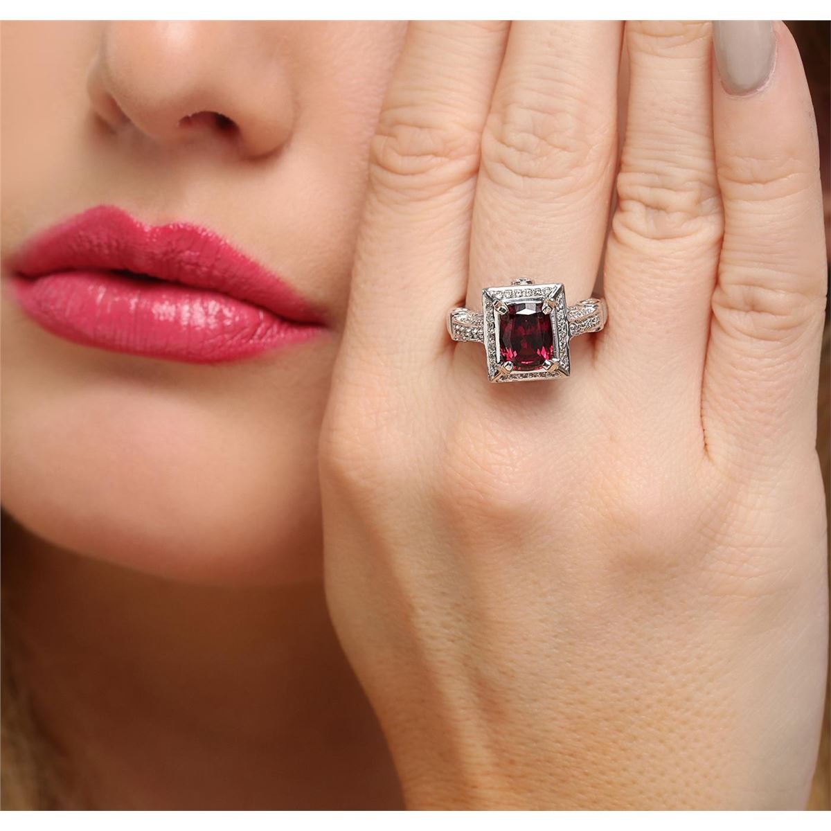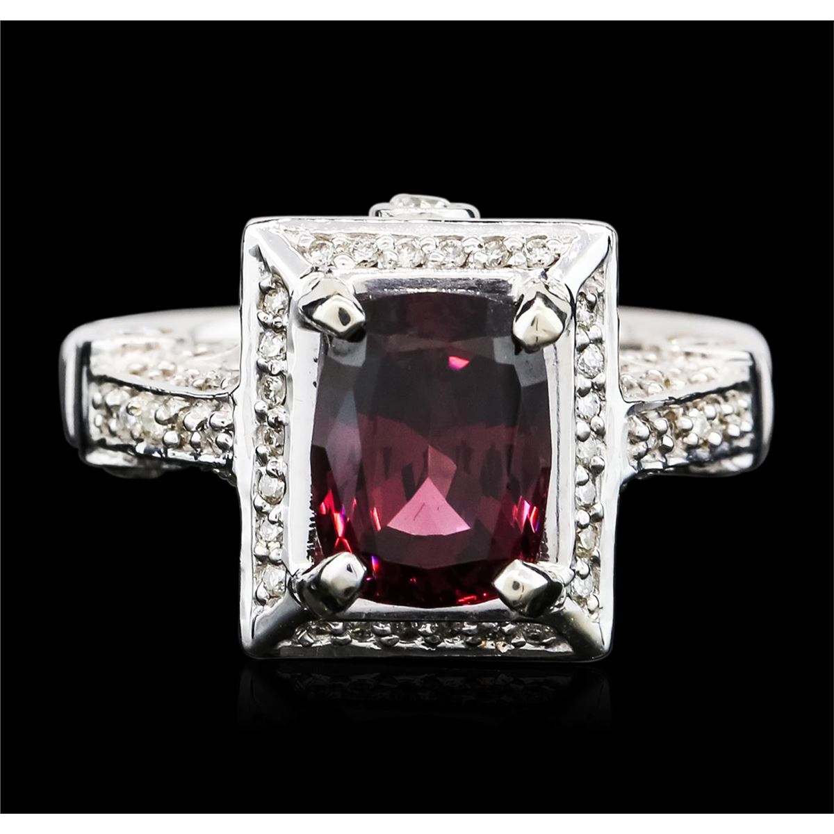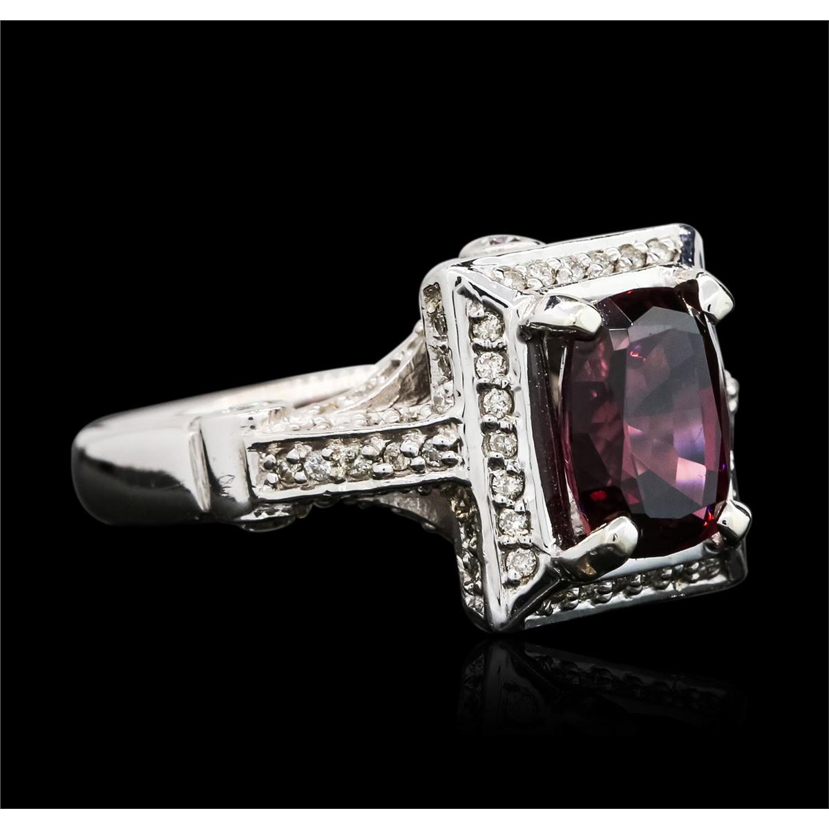 One electronically tested 14KT white gold ladies cast rhodolite garnet and diamond ring with a bright polish finish. The featured rhodolite garnet is set within a diamond bezel supported by a diamond set under gallery and diamond set shoulders, completed by a three millimeter wide band. Identified with markings of "14K". Condition is new, good workmanship. Containing: One prong set rectangular cushion mixed cut natural rhodolite garnet, measuring 9.10 x 6.90 x 5.20mm, 6%. bulge factor, approximate weight of 3.09ct., clarity is eye clean, type II, dark, very slightly brownish, strongly purplish red color, (GIA stpR 7/3), cut is good. Transmitting light with no distortion, transparent. Refractive index testing results of 1.76. This is a conclusive result for pyrope-almandite garnet(rhodolite). Graded in the setting. Six bezel set round brilliant cut diamonds, measuring 2.40 - 2.40 x 1.44mm (depth est.) approximate total weight of 6 Stones = 0.35ct. Graded in the setting. Clarity: SI-1 to SI-2. Color: G - I Ninety-Six prong set round brilliant cut diamonds, measuring 1.10 - 1.00 x 0.63mm (depth est.) approximate total weight of 96 Stones = 0.50ct. Graded in the setting. Clarity: SI-1 to I-1. Color: G - I. Total Weight of Colored Stones 3.09ct. Total Weight of Diamonds 0.85ct. Total Weight of Ring 11.68 grams. AIG Appraised at $5,555.00.