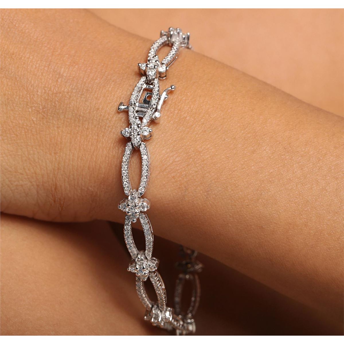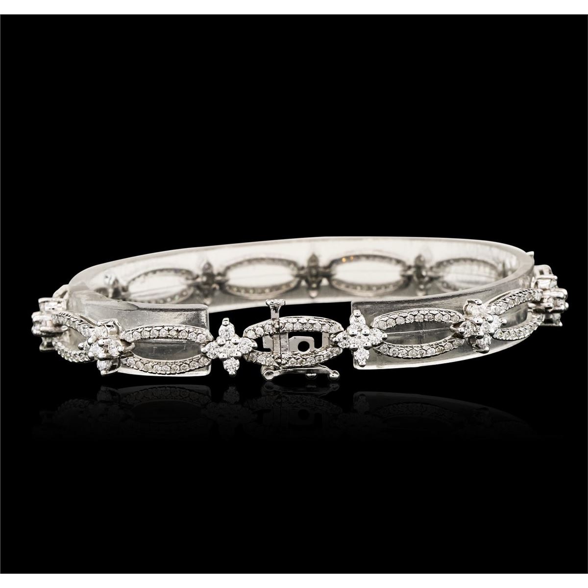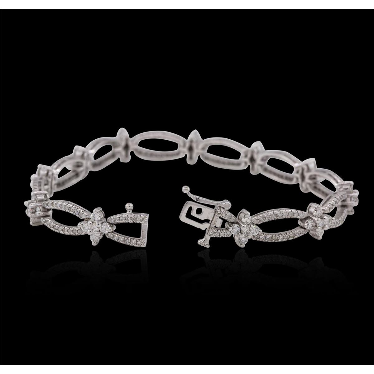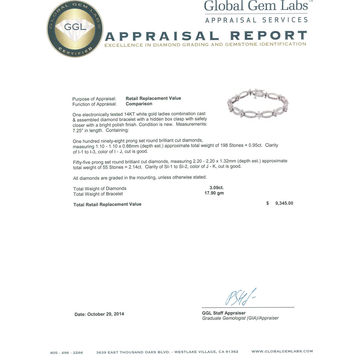 One electronically tested 14KT white gold ladies combination cast & assembled diamond bracelet with a hidden box clasp with safety closer with a bright polish finish. Measurements: 7.25 in length. Condition is new. Containing: One Hundred Ninety-Eight prong set round brilliant cut diamonds, measuring 1.10 - 1.10 x 0.66mm (depth est.) approximate total weight of 198 Stones = 0.95ct. Clarity: I-1 to I-3. Color: I - J, Cut is Good. Fifty-Five prong set round brilliant cut diamonds, measuring 2.20 - 2.20 x 1.32mm (depth est.) approximate total weight of 55 Stones = 2.14ct. Clarity: SI-1 to SI-2. Color: J - K, Cut is Good. All diamonds are graded in the mounting, unless otherwise stated. Total Weight of Diamonds 3.09ct. Total Weight of Bracelet 17.90 grams. GGL Appraised at $9,345.00.