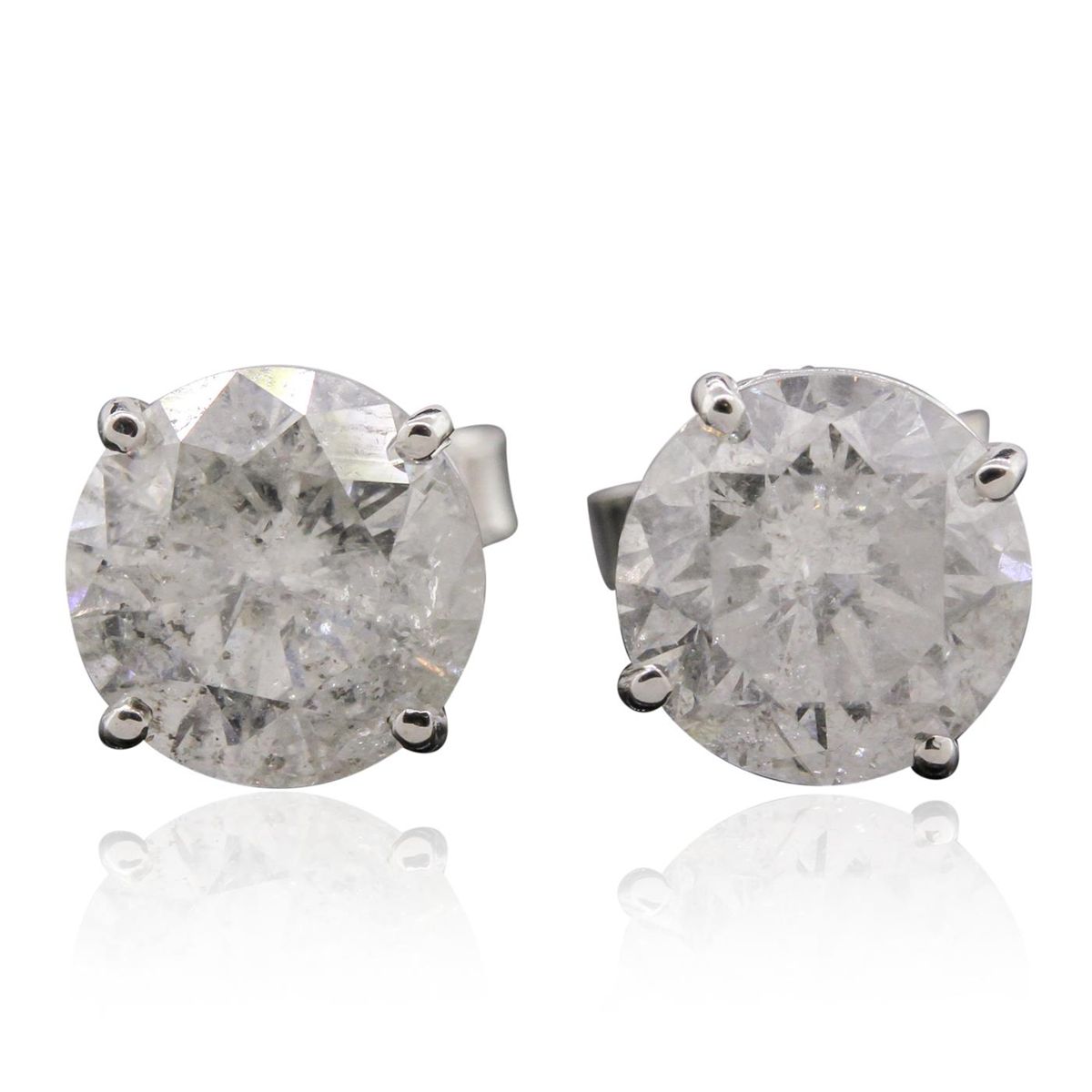 One electronically tested 14KT white gold Ladies cast stud earrings with friction posts with a bright polish finish. Condition is new. Identified with markings of "14K". Containing: One prong set round brilliant cut diamond, measuring 7.35 - 7.25 x 4.80mm (depth est.) approximate weight of 1.56ct. Clarity: I-3. Color: I, Cut is Good. One prong set round brilliant cut diamond, measuring 7.15 - 7.14 x 4.90mm (depth est.) approximate weight of 1.53ct. Clarity: I-3. Color: F, Cut is Fair. Total Weight of Diamonds 3.09ct. Total Weight of Earrings 1.60 grams. GGL Appraised at $18,945.00.