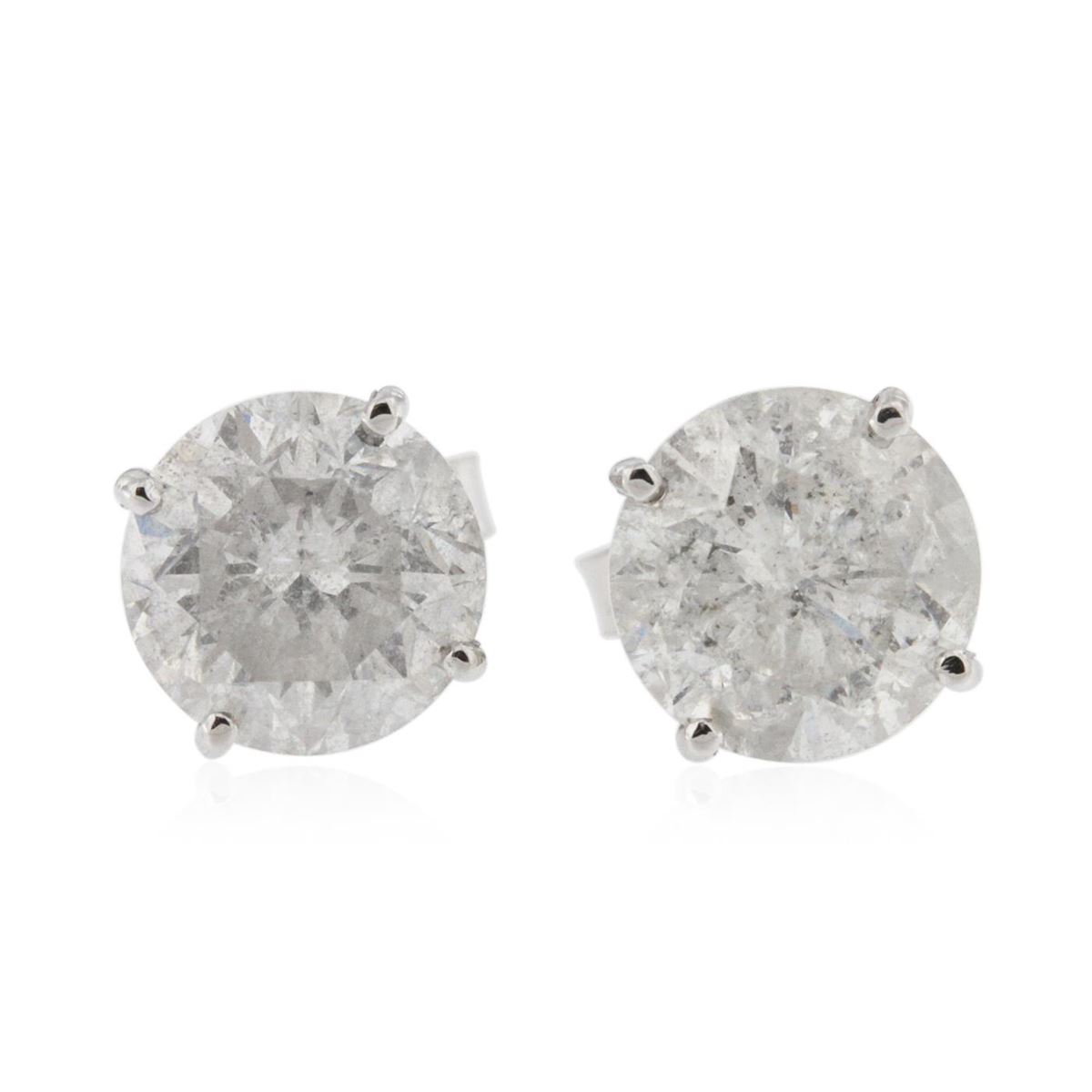 One electronically tested 14KT white gold Ladies cast stud earrings with friction posts with a bright polish finish. Condition is new. Identified with markings of "14K". Containing: One prong set round brilliant cut diamond, measuring 7.35 - 7.25 x 4.80mm (depth est.) approximate weight of 1.56ct. Clarity: I-3. Color: I, Cut is Good. One prong set round brilliant cut diamond, measuring 7.15 - 7.14 x 4.90mm (depth est.) approximate weight of 1.53ct. Clarity: I-3. Color: F, Cut is Fair. Total Weight of Diamonds 3.09ct. Total Weight of Earrings 1.60 grams. GGL Appraised at $18,945.00.