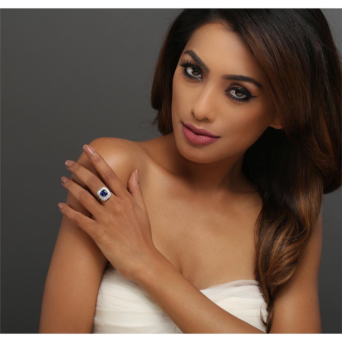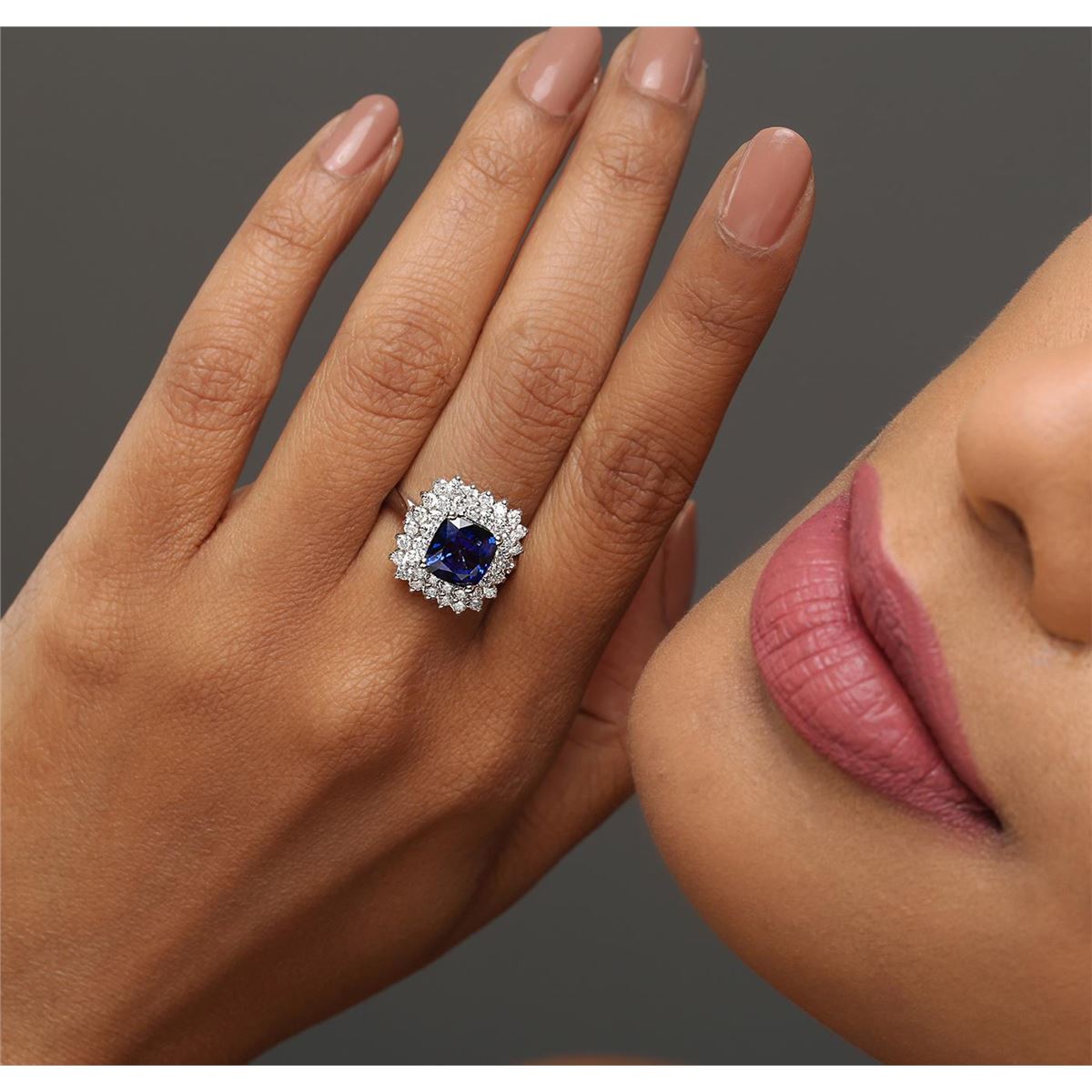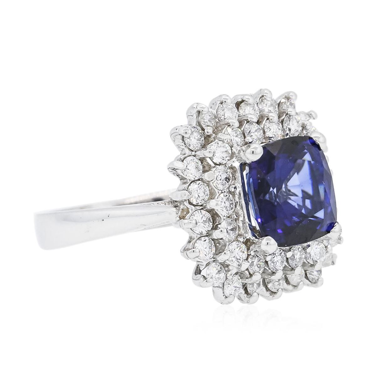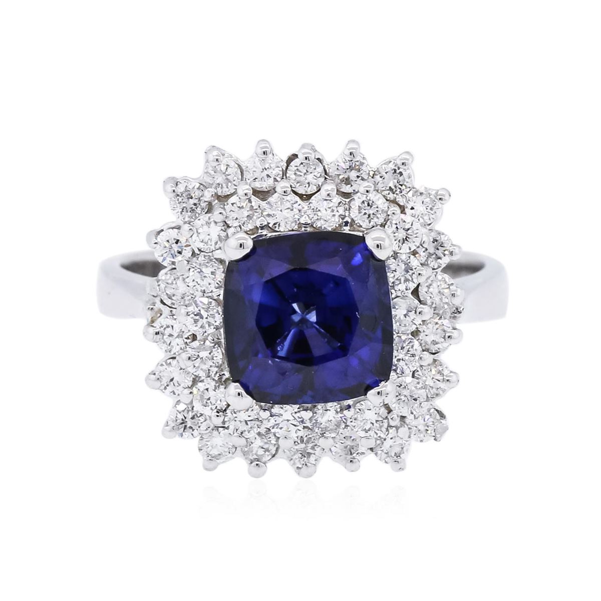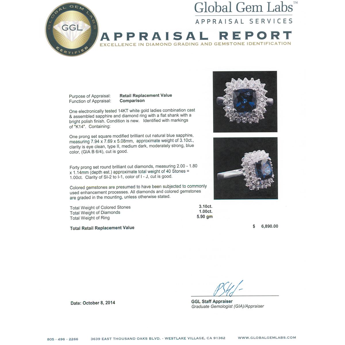 One electronically tested 14KT white gold ladies combination cast & assembled sapphire and diamond ring with a flat shank with a bright polish finish. Identified with markings of "K14". Condition is new. Containing: One prong set square modified brilliant cut natural blue sapphire, measuring 7.94 x 7.69 x 5.08mm, approximate weight of 3.10ct., clarity is eye clean, type II, medium dark, moderately strong, blue color, (GIA B 6/4), cut is good. Forty prong set round brilliant cut diamonds, measuring 2.00 - 1.80 x 1.14mm (depth est.) approximate total weight of 40 Stones = 1.00ct. Clarity: SI-2 to I-1. Color: I - J, Cut is Good. Colored gemstones are presumed to have been subjected to commonly used enhancement processes. All diamonds and colored gemstones are graded in the mounting, unless otherwise stated. Total Weight of Colored Stones 3.10ct. Total Weight of Diamonds 1.00ct. Total Weight of Ring 5.90 grams. GGL Appraised at $6,890.00.