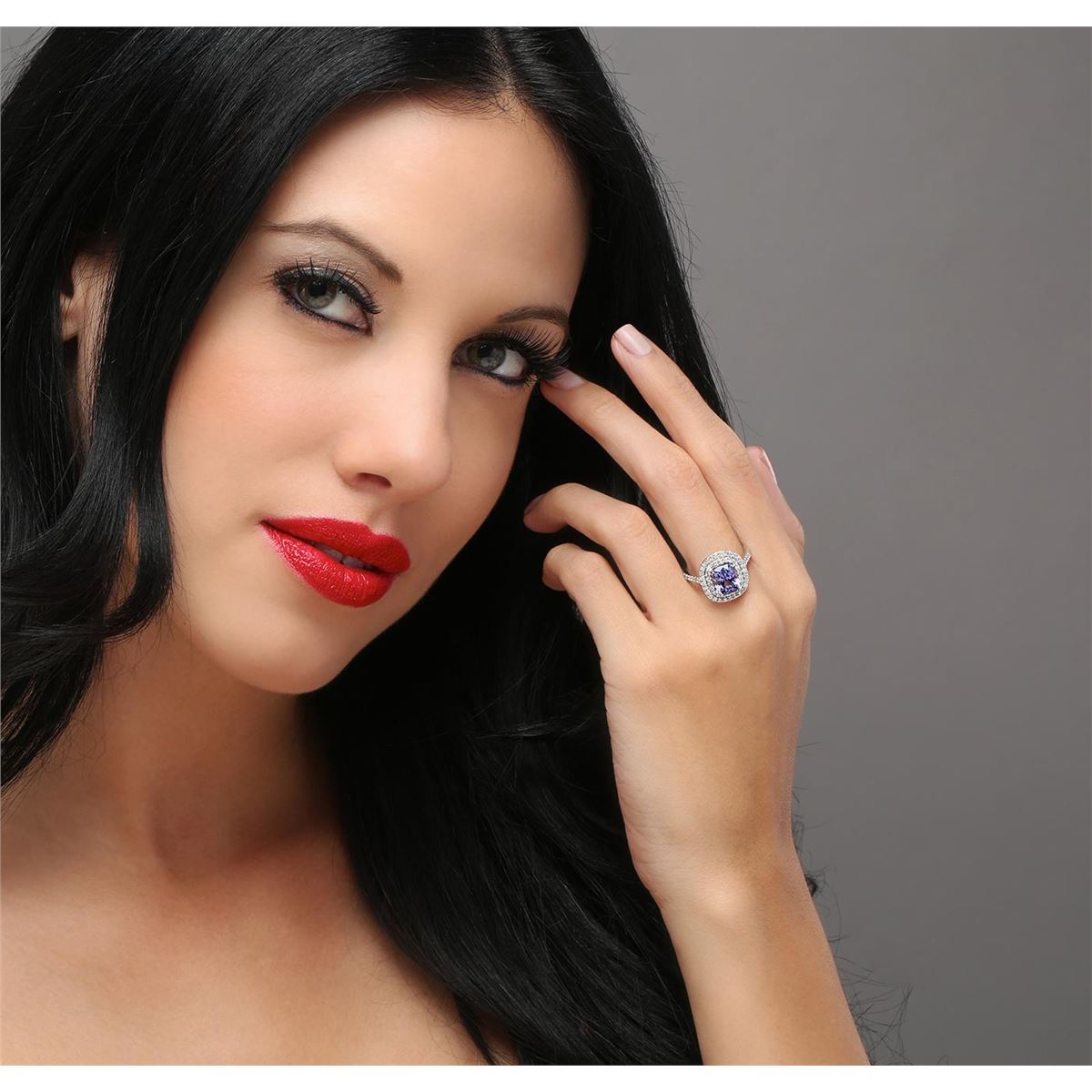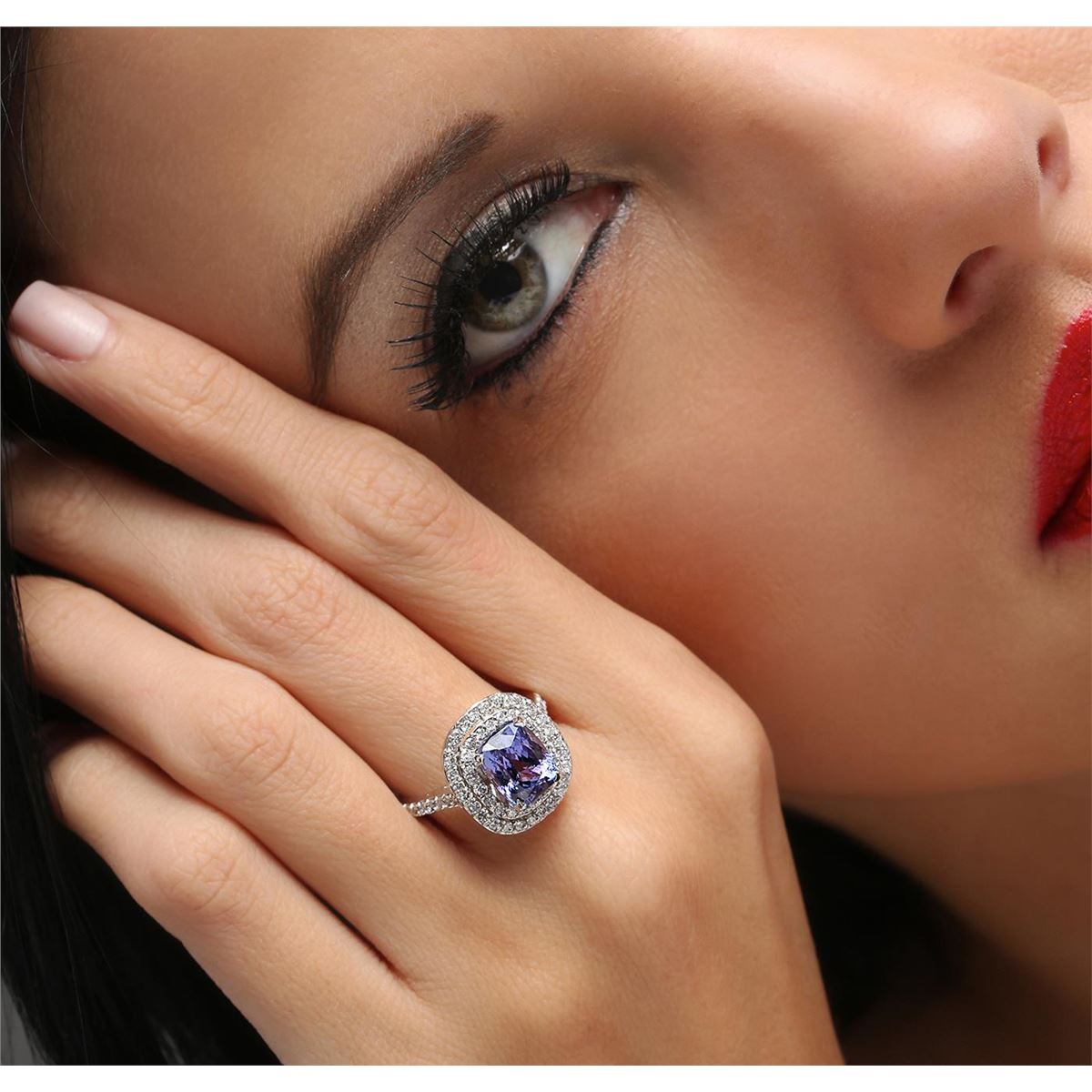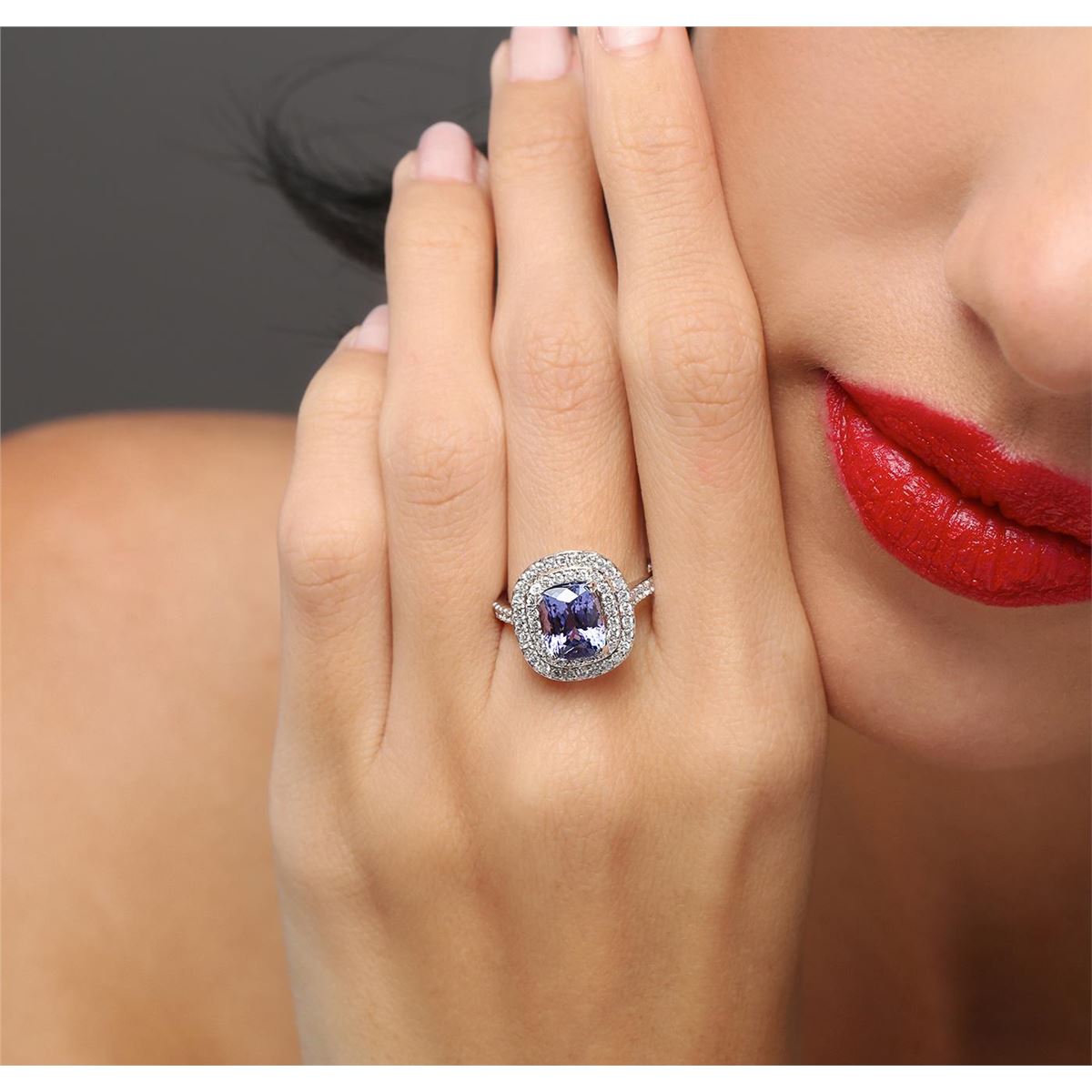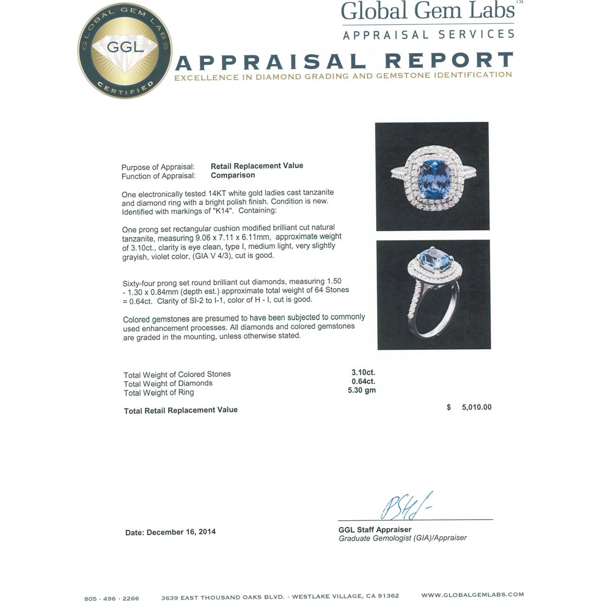 One electronically tested 14KT white gold ladies cast tanzanite and diamond ring with a bright polish finish. Identified with markings of "K14". Condition is new. Containing: One prong set rectangular cushion modified brilliant cut natural tanzanite, measuring 9.06 x 7.11 x 6.11mm, approximate weight of 3.10ct., clarity is eye clean, type I, medium light, very slightly grayish, violet color, (GIA V 4/3), cut is good. Sixty-Four prong set round brilliant cut diamonds, measuring 1.50 - 1.30 x 0.84mm (depth est.) approximate total weight of 64 Stones = 0.64ct. Clarity: SI-2 to I-1. Color: H - I, Cut is Good. Colored gemstones are presumed to have been subjected to commonly used enhancement processes. All diamonds and colored gemstones are graded in the mounting, unless otherwise stated. Total Weight of Colored Stones 3.10ct. Total Weight of Diamonds 0.64ct. Total Weight of Ring 5.30 grams. GGL Appraised at $5,010.00.