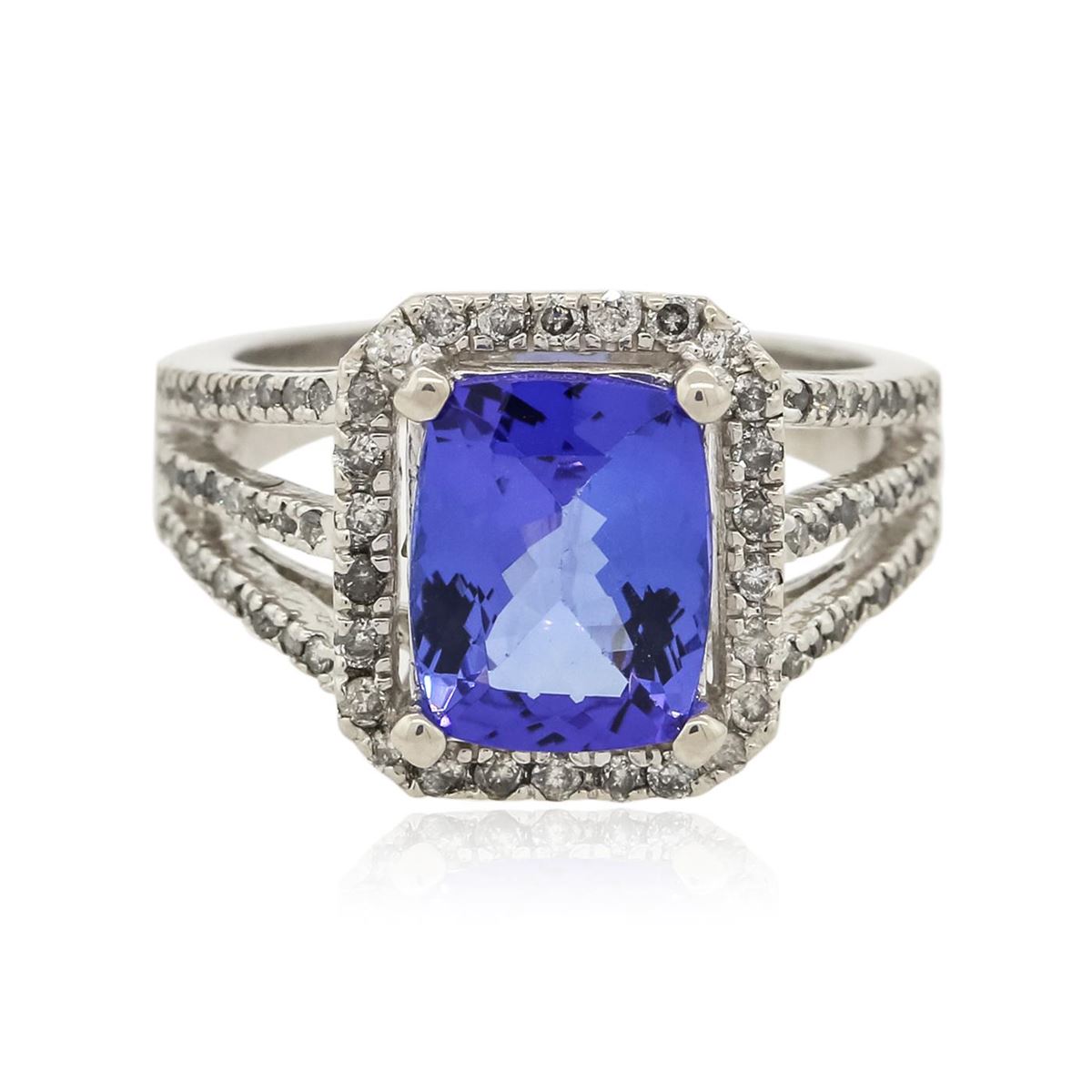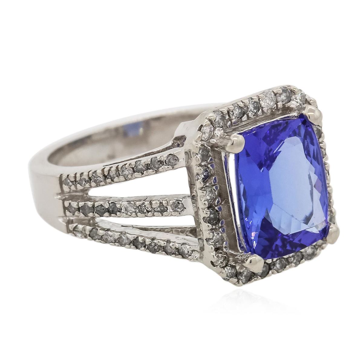 One electronically tested 14KT white gold ladies cast tanzanite and diamond ring with a bright polish finish. Condition is new, good workmanship. The featured tanzanite is set within a diamond bezel supported by split diamond set shoulders, completed by a two and one-half millimeter wide band. Identified with markings of "K14". Containing: One prong set rectangular cushion mixed cut natural tanzanite, measuring 10.00 x 7.80 x 4.60mm, 10% bulge factor, approximate weight of 3.10ct, clarity is eye clean, type I, medium dark, very slightly grayish, violetish blue color (GIA vB 6/3) cut is good. Transmitting light with no distortion, transparent. Graded in the setting. Tanzanite is a very rare gemstone that is only found in the country of Tanzania. Originally discovered in 1967. Tiffany & Company, named the stone Tanzanite. It is found in the Usumburu Mountains that border the Umba Valley of northern Tanzania. Tanzanite occurs in gray, brown, violet, blue, reddish-purple, & green. The gem is interesting because of its exceptional pleochroism. Rotated in different directions a tanzanite will exhibit multiple changes of color. Tanzanite has a low tolerance to ultrasonic cleaning, and should not be cleaned using this method. Seventy-four prong set round brilliant cut diamonds, measuring 1.30 - 1.20 x 0.75mm (depth est) approximate total weight of 74 Stones = 0.54ct. Graded in the setting. Clarity I-1 to I-2 Color H-J. Total Weight of Colored Stones 3.10ct. Total Weight of Diamonds 0.54ct. Total Weight of Ring 6.71 grams. AIG Appraised at $10,470.00.