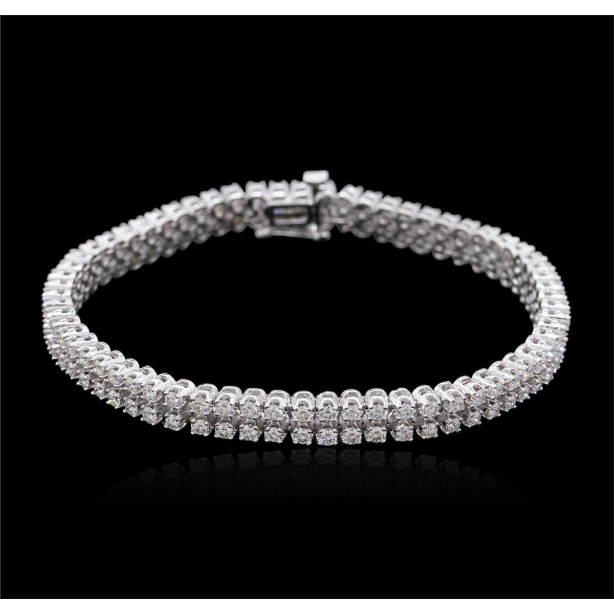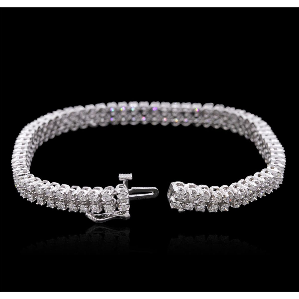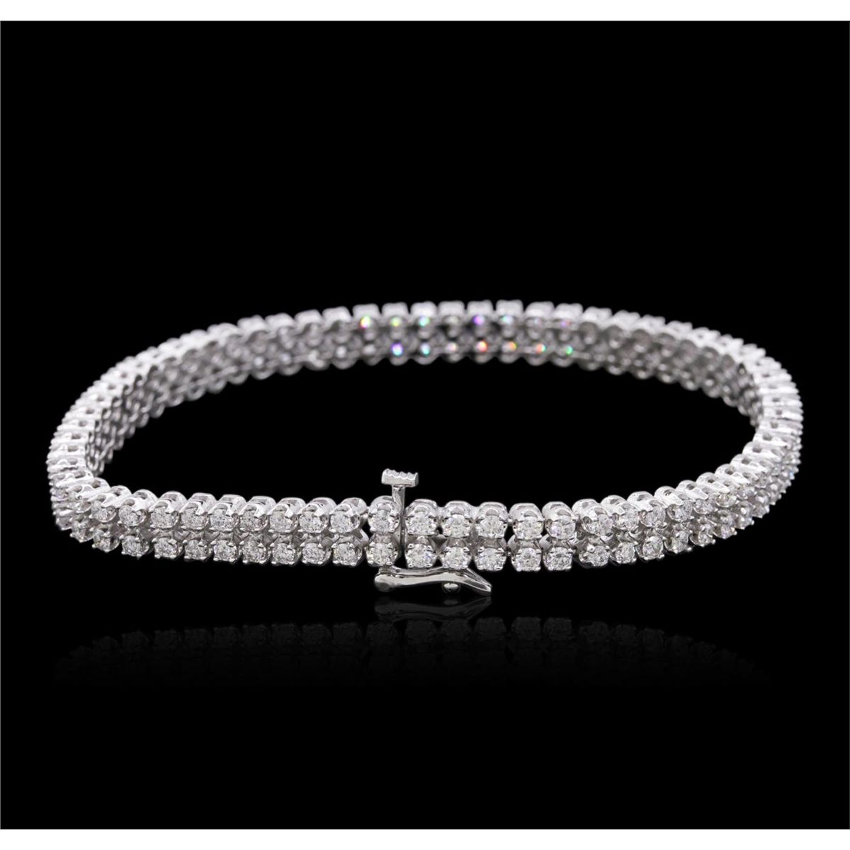 One electronically tested 14KT white gold ladies cast & assembled diamond bracelet with a bright polish finish. Seven inch length bracelet features two flexible diamond ribbons, terminating in a concealed clasp with safety. Identified with markings of 14K. Condition is new, good workmanship. Containing: One Hundred Thirty prong set round brilliant cut diamonds, measuring 1.90 - 1.80 x 1.11mm (depth est.) approximate total weight of 130 Stones = 3.10ct. Graded in the setting. Clarity: SI-1 to I-1. Color: G - I. Total Weight of Diamonds 3.10ct. Total Weight of Bracelet 16.50 grams. AIG Appraised at $11,725.00.