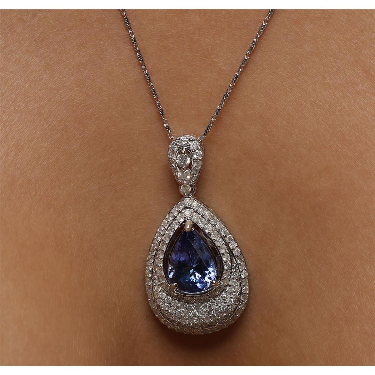 One electronically tested 14KT white gold ladies cast & assembled tanzanite and diamond pendant with chain. The pendant features a tanzanite set within a diamond gallery, completed by a diamond set bail. The pendant is supported by an eighteen inch length 14KT white gold designer style chain, terminating in a lobster claw clasp. Bright polish finish. Trademark is Orianne. Identified with markings of "14K". Condition is new, good workmanship. Containing: One prong set pear brilliant cut natural tanzanite, measuring 11.00 x 7.50 x 5.30mm, 6% bulge factor, approximate weight of 3.11ct., clarity is eye clean, type I, medium dark, very slightly grayish, bluish violet color, (GIA bV 6/3), cut is good. Transmitting light with no distortion, transparent. Graded in the setting. Tanzanite is a very rare gemstone that is only found in the country of Tanzania. Originally discovered in 1967. Tiffany & Company, named the stone Tanzanite. It is found in the Usumburu Mountains that border the Umba Valley of northern Tanzania. Tanzanite occurs in gray, brown, violet, blue, reddish-purple, & green. The gem is interesting because of its exceptional pleochroism. Rotated in different directions a tanzanite will exhibit multiple changes of color. Tanzanite has a low tolerance to ultrasonic cleaning, and should not be cleaned using this method. One Hundred Thirty-Four prong set round brilliant cut diamonds, measuring 1.40 - 1.30 x 0.81mm (depth est.) approximate total weight of 134 Stones = 1.30ct. Graded in the setting. Clarity: I-1 to I-2. Color: H - J Three prong set round brilliant cut diamonds, measuring 2.20 - 1.80 x 1.20mm (depth est.) approximate total weight of 3 Stones = 0.10ct. Graded in the setting. Clarity: I-1 to I-2. Color: G - I. Total Weight of Colored Stones 3.11ct. Total Weight of Diamonds 1.40ct. Total Weight of Pendant With Chain 7.84 grams. AIG Appraised at $12,755.00.
