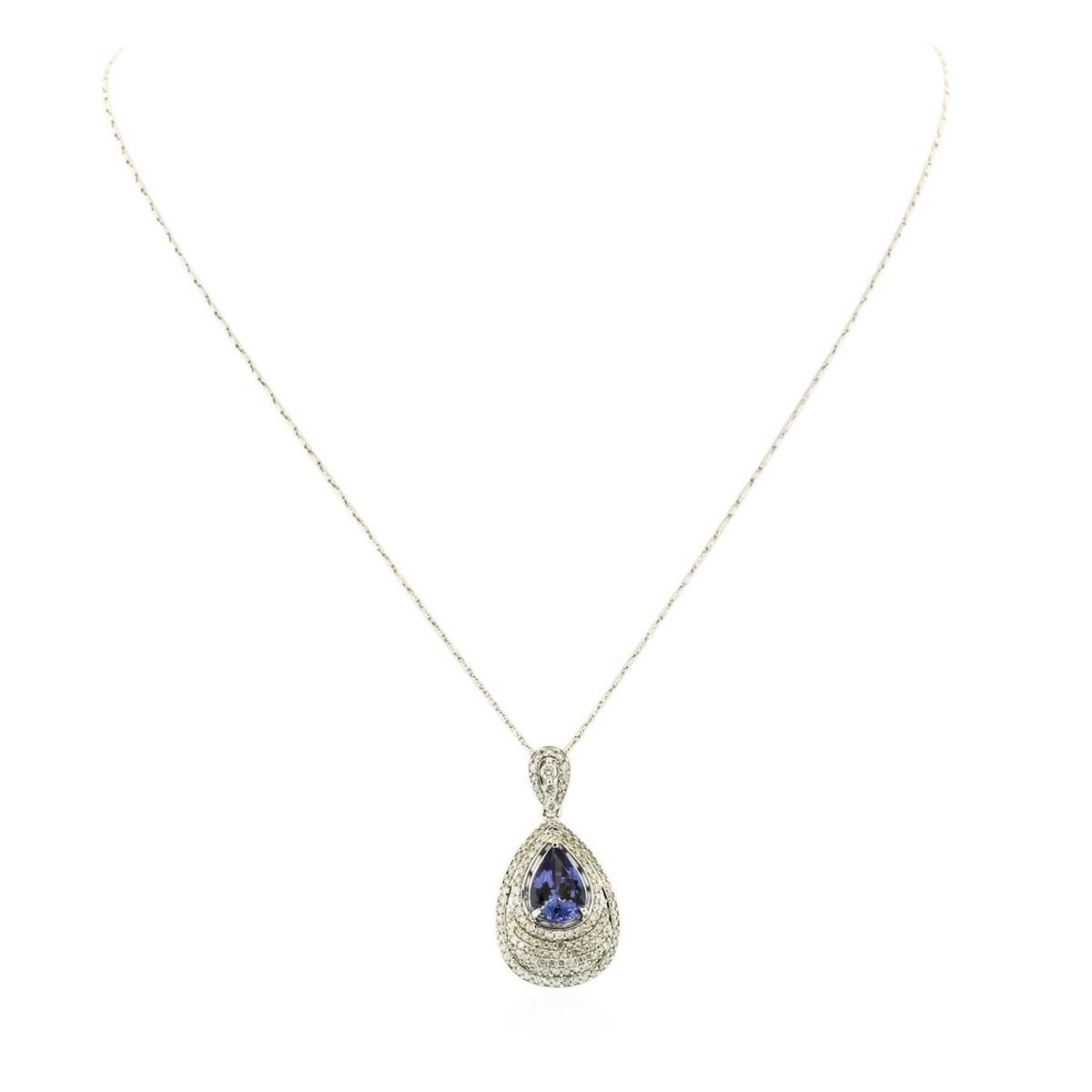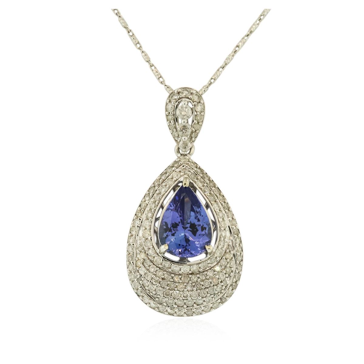 One electronically tested 14KT white gold ladies cast & assembled tanzanite and diamond pendant with chain. The pendant features a tanzanite set within a diamond gallery, completed by a diamond set bail. The pendant is supported by an eighteen inch length 14KT white gold designer style chain, terminating in a lobster claw clasp. Bright polish finish. Trademark is Orianne. Identified with markings of "14K". Condition is new, good workmanship. Containing: One prong set pear brilliant cut natural tanzanite, measuring 11.00 x 7.50 x 5.30mm, 6% bulge factor, approximate weight of 3.11ct., clarity is eye clean, type I, medium dark, very slightly grayish, bluish violet color, (GIA bV 6/3), cut is good. Transmitting light with no distortion, transparent. Graded in the setting. Tanzanite is a very rare gemstone that is only found in the country of Tanzania. Originally discovered in 1967. Tiffany & Company, named the stone Tanzanite. It is found in the Usumburu Mountains that border the Umba Valley of northern Tanzania. Tanzanite occurs in gray, brown, violet, blue, reddish-purple, & green. The gem is interesting because of its exceptional pleochroism. Rotated in different directions a tanzanite will exhibit multiple changes of color. Tanzanite has a low tolerance to ultrasonic cleaning, and should not be cleaned using this method. One Hundred Thirty-Four prong set round brilliant cut diamonds, measuring 1.40 - 1.30 x 0.81mm (depth est.) approximate total weight of 134 Stones = 1.30ct. Graded in the setting. Clarity: I-1 to I-2. Color: H - J Three prong set round brilliant cut diamonds, measuring 2.20 - 1.80 x 1.20mm (depth est.) approximate total weight of 3 Stones = 0.10ct. Graded in the setting. Clarity: I-1 to I-2. Color: G - I. Total Weight of Colored Stones 3.11ct. Total Weight of Diamonds 1.40ct. Total Weight of Pendant With Chain 7.84 grams. AIG Appraised at $12,755.00.