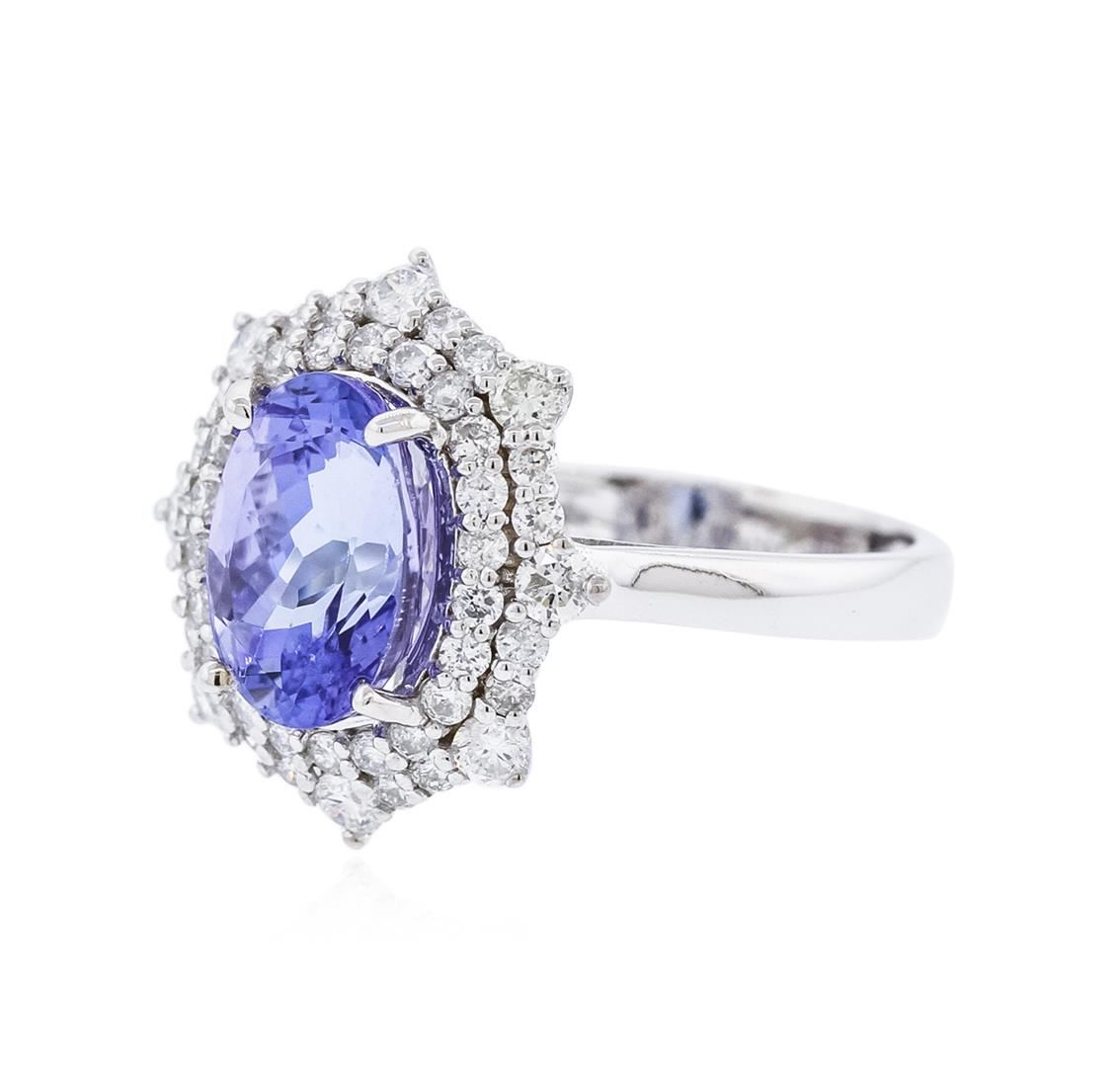 One electronically tested 14KT white gold ladies cast tanzanite and diamond ring with a bright polish finish. Identified with markings of "14K". Condition is new. Containing: One prong set oval modified brilliant cut natural tanzanite, measuring 10.00 x 7.50 x 5.90mm, approximate weight of 3.11ct., clarity is eye clean, type I, medium light, very slightly grayish, violet color, (GIA V 4/3), cut is good. Forty-Six prong set round brilliant cut diamonds, measuring 1.90 - 1.30 x 0.96mm (depth est.) approximate total weight of 46 Stones = 0.50ct. Clarity: SI-2 to I-2. Color: I - J, Cut is Good. Colored gemstones are presumed to have been subjected to commonly used enhancement processes. All diamonds and colored gemstones are graded in the mounting, unless otherwise stated. Total Weight of Colored Stones 3.11ct. Total Weight of Diamonds 0.50ct. Total Weight of Ring 6.75 grams. GGL Appraised at $4,840.00.