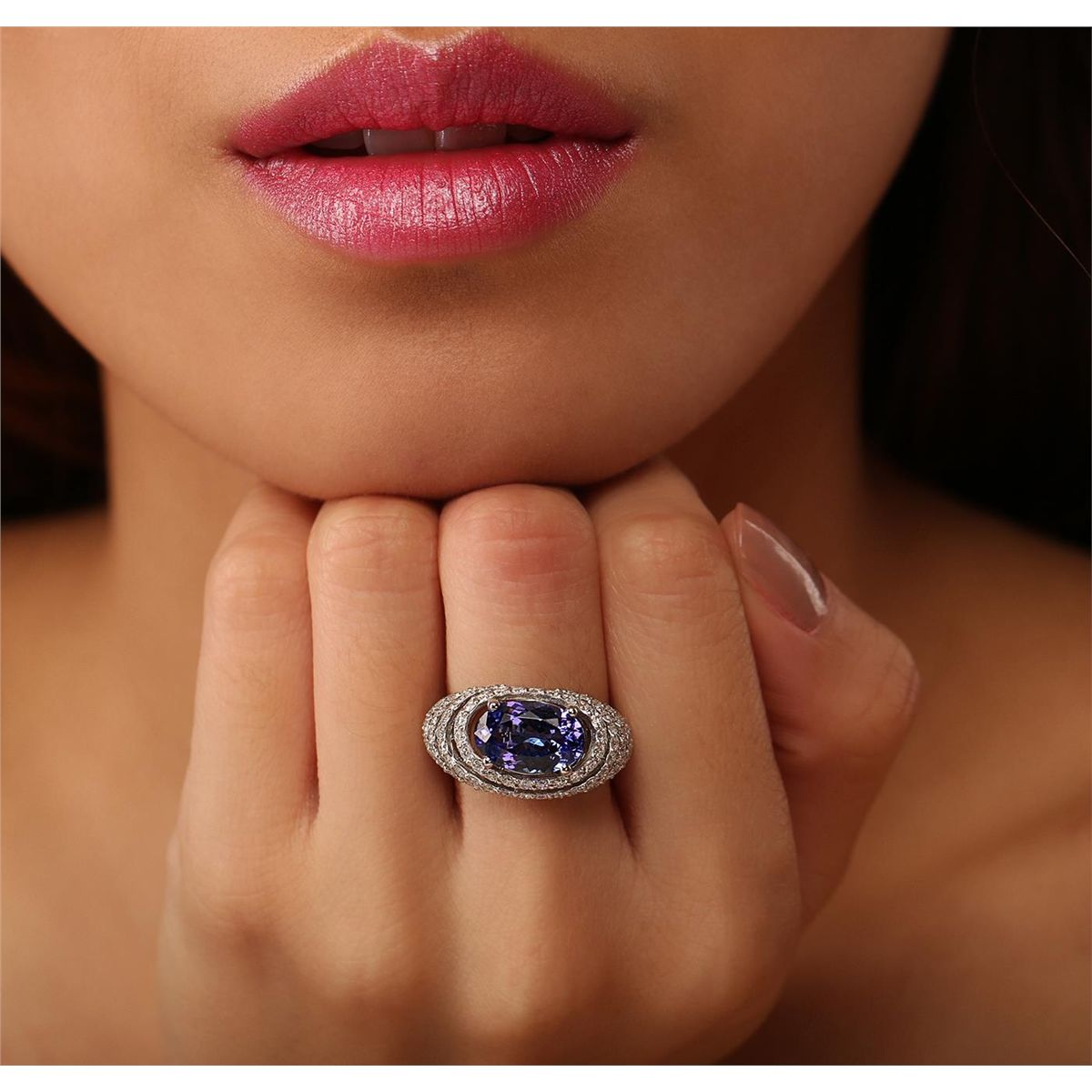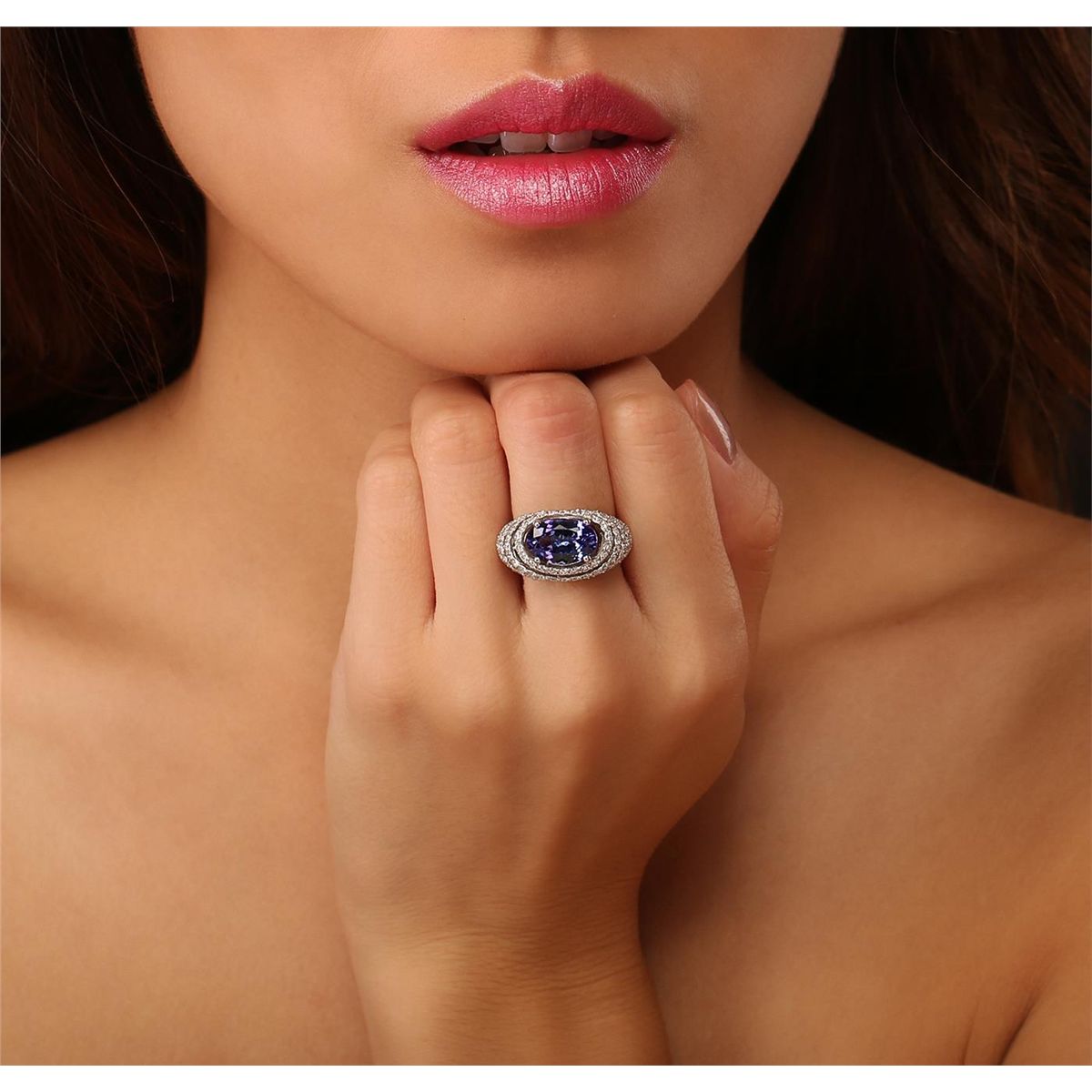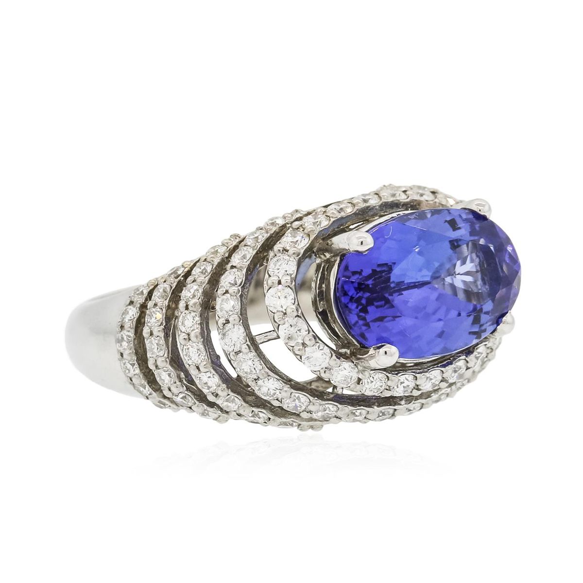 One electronically tested 14KT white gold ladies combination cast & assembled ring with a bright polish finish. Condition is new. Identified with markings of "14K". Containing: One prong set oval modified brilliant cut natural tanzanite, measuring 11.90 x 7.80 x 4.78mm, approximate weight of 3.11ct., clarity is eye clean, type I, medium, moderately strong, violetish blue color, (GIA vB 5/4), cut is good. Ninety prong set round brilliant cut diamonds, measuring 1.40 - 1.40 x 0.84mm (depth est.) approximate total weight of 90 Stones = 0.90ct. Clarity: I-1 to I-2. Color: H - I, Cut is Good. Colored gemstones are presumed to have been subjected to commonly used enhancement processes. All diamonds and colored gemstones are graded in the mounting, unless otherwise stated. Total Weight of Colored Stones 3.11ct. Total Weight of Diamonds 0.90ct. Total Weight of Ring 7.30 grams. GGL Appraised at $8,145.00.