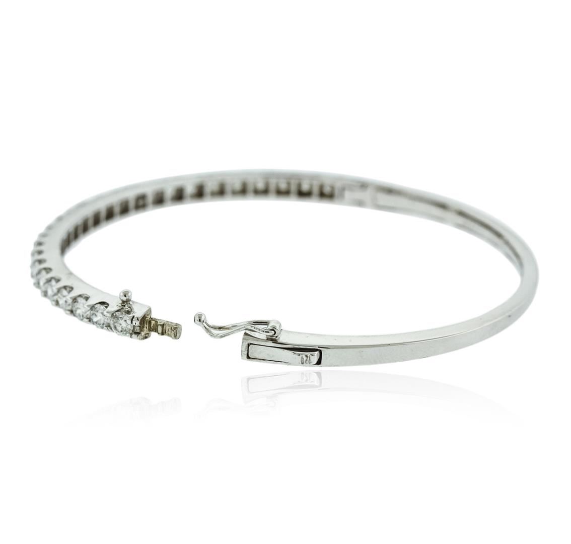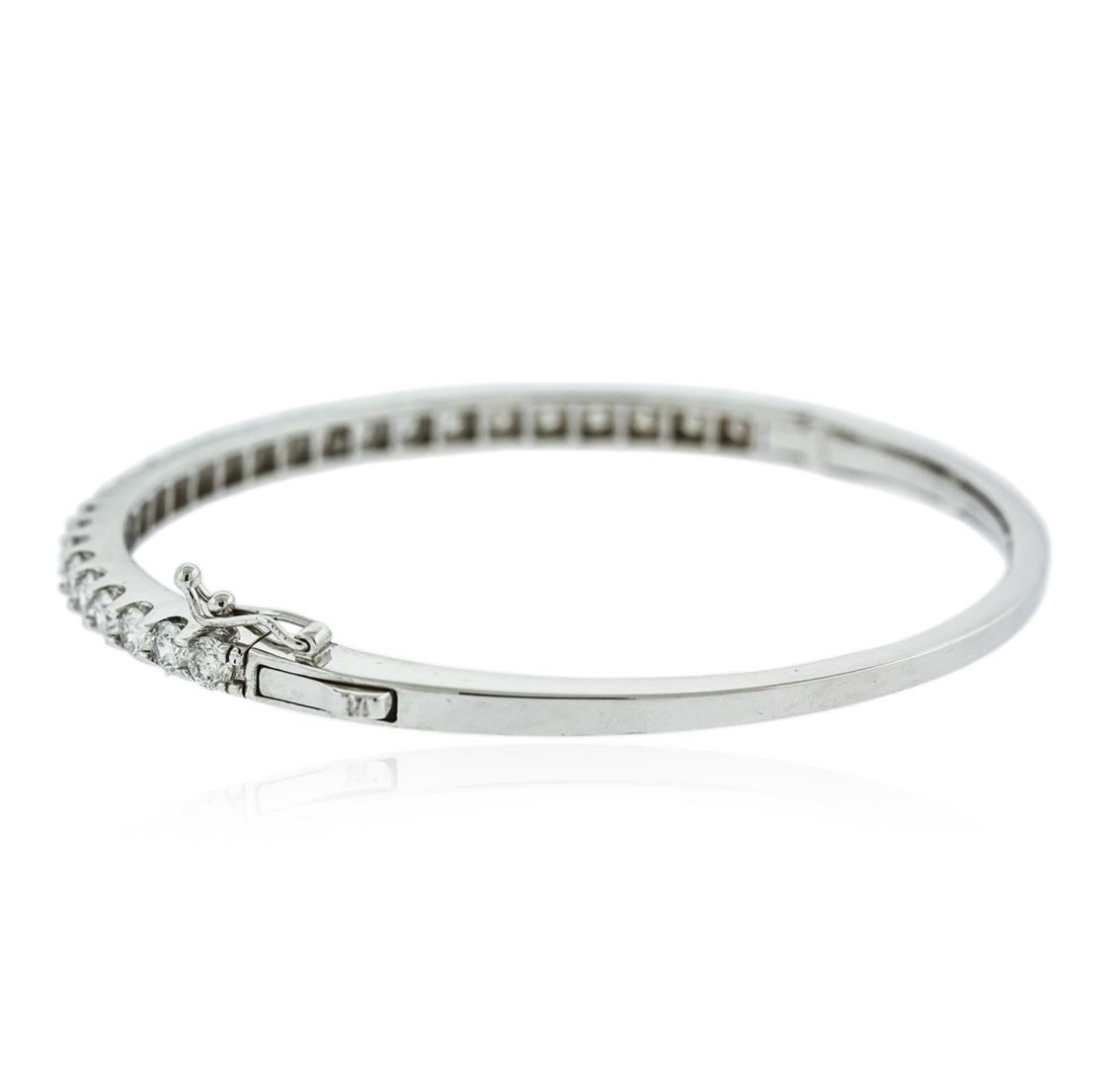 One electronically tested 14KT white gold ladies cast diamond bangle bracelet with a hidden box clasp with safety closer with a bright polish finish. Condition is new. Containing: Twenty-Six prong set round brilliant cut diamonds, measuring 3.20 - 3.20 x 1.92mm (depth est.) approximate total weight of 26 Stones = 3.12ct. Clarity: SI-1 to I-1. Color: H - J, Cut is Good. All diamonds are graded in the mounting, unless otherwise stated. Total Weight of Diamonds 3.12ct. Total Weight of Bangle Bracelet 13.40 grams. GGL Appraised at $8,520.00.