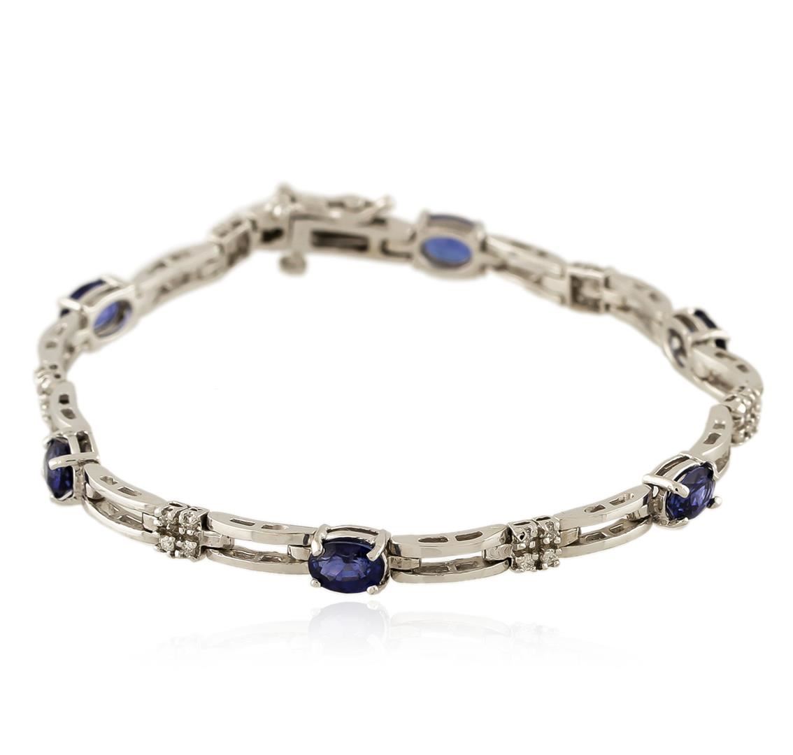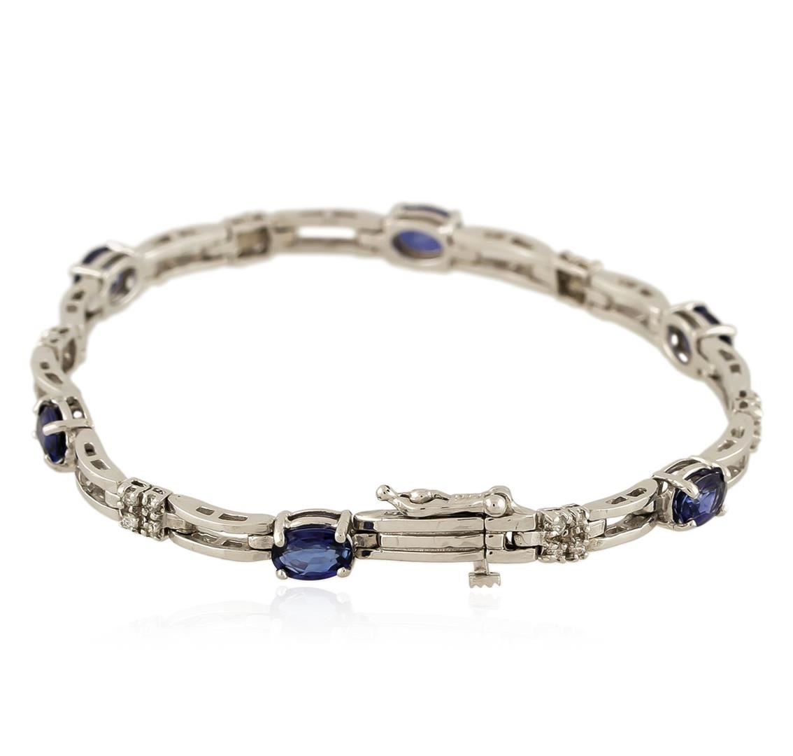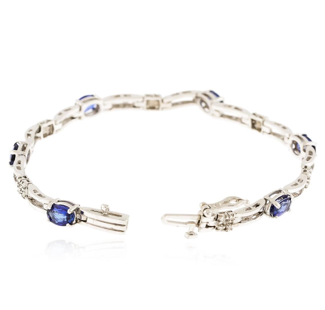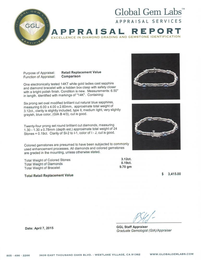 One electronically tested 14KT white gold ladies cast sapphire and diamond bracelet with a hidden box clasp with safety closer with a bright polish finish. Measurements: 6.50" in length. Identified with markings of "14K". Condition is new. Containing: Six prong set oval modified brilliant cut natural blue sapphires, measuring 6.00. x 4.00. x 2.60mm, approximate total weight of 3.12ct., clarity is slightly included, type II, medium light, very slightly grayish, blue color, (GIA B 4/3), cut is good. Twenty-Four prong set round brilliant cut diamonds, measuring 1.30 - 1.30 x 0.78mm (depth est.) approximate total weight of 24 Stones = 0.19ct. Clarity: SI-2 to I-1. Color: I - J, Cut is Good. Colored gemstones are presumed to have been subjected to commonly used enhancement processes. All diamonds and colored gemstones are graded in the mounting, unless otherwise stated. Total Weight of Colored Stones 3.12ct. Total Weight of Diamonds 0.19ct. Total Weight of Bracelet 9.70 grams. GGL Appraised at $3,415.00.