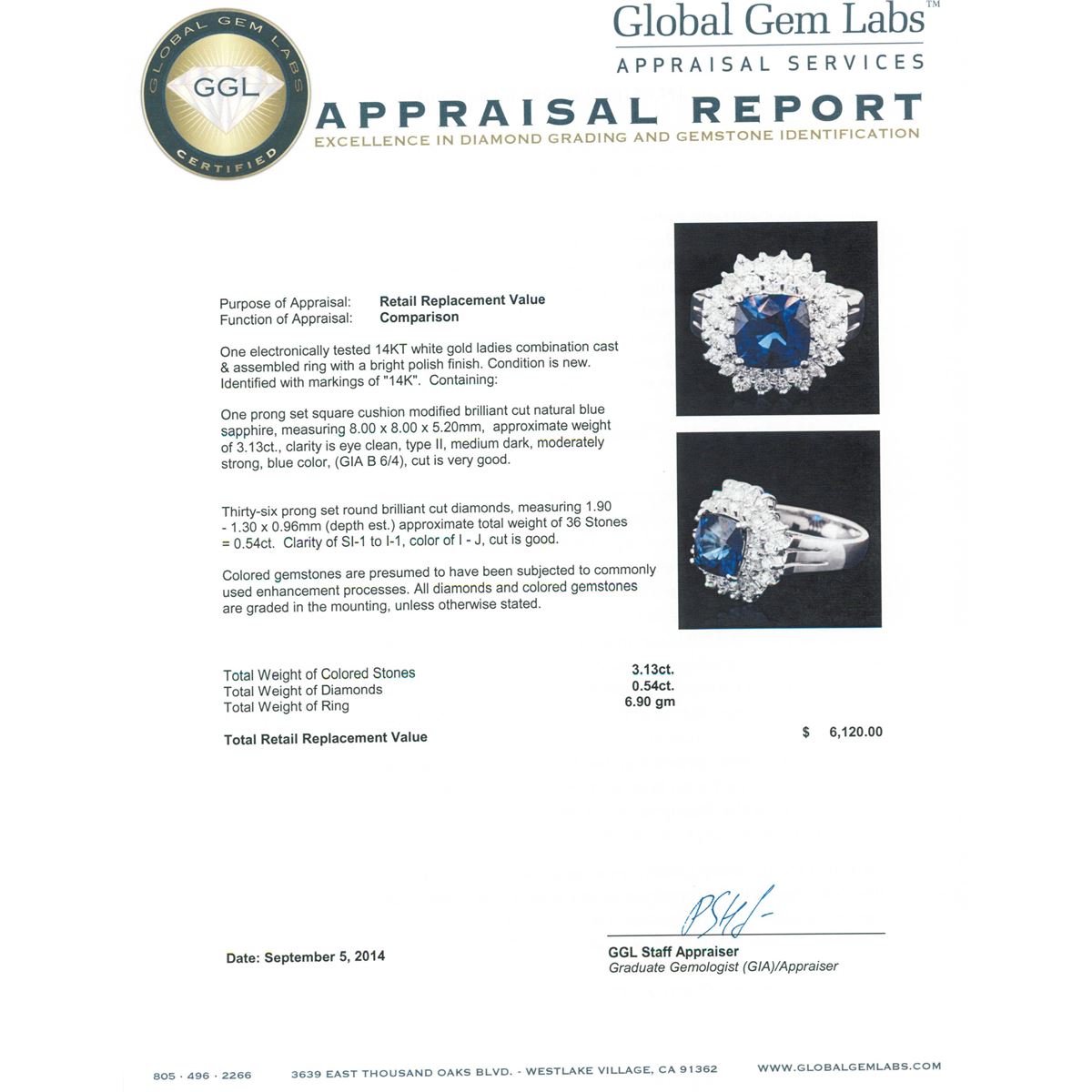 One electronically tested 14KT white gold ladies combination cast & assembled ring with a bright polish finish. Identified with markings of "14K". Condition is new. Containing: One prong set square cushion modified brilliant cut natural blue sapphire, measuring 8.00 x 8.00 x 5.20mm, approximate weight of 3.13ct., clarity is eye clean, type II, medium dark, moderately strong, blue color, (GIA B 6/4), cut is very good. Thirty-Six prong set round brilliant cut diamonds, measuring 1.90 - 1.30 x 0.96mm (depth est.) approximate total weight of 36 Stones = 0.54ct. Clarity: SI-1 to I-1. Color: I - J, Cut is Good. Colored gemstones are presumed to have been subjected to commonly used enhancement processes. All diamonds and colored gemstones are graded in the mounting, unless otherwise stated. Total Weight of Colored Stones 3.13ct. Total Weight of Diamonds 0.54ct. Total Weight of Ring 6.90 grams. GGL Appraised at $6,120.00.