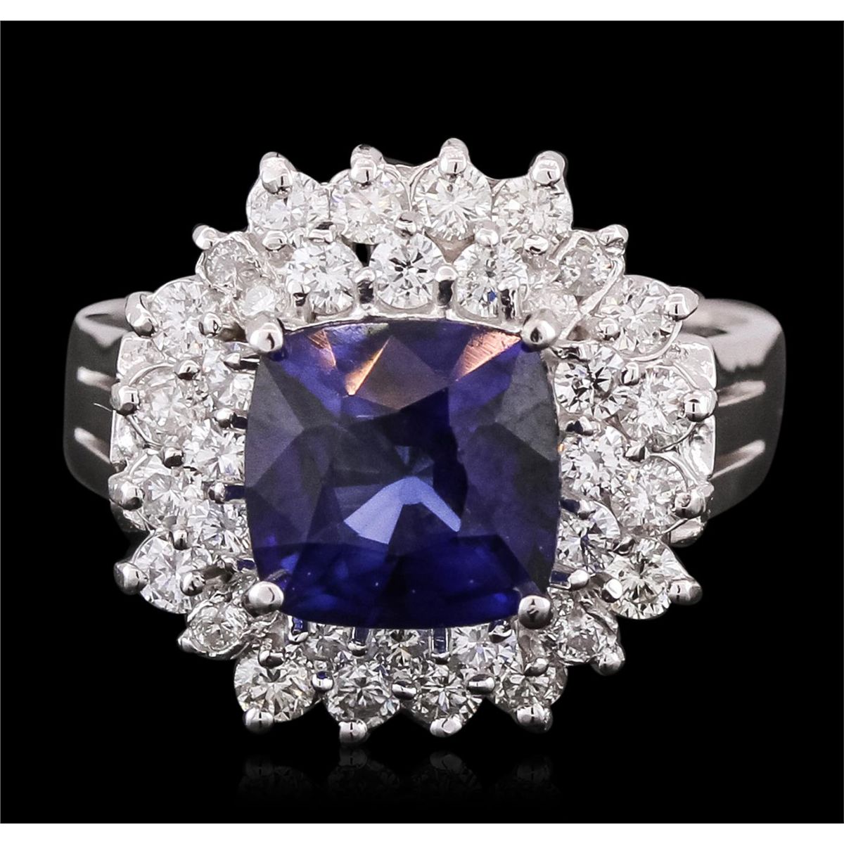 One electronically tested 14KT white gold ladies combination cast & assembled ring with a bright polish finish. Identified with markings of "14K". Condition is new. Containing: One prong set square cushion modified brilliant cut natural blue sapphire, measuring 8.00 x 8.00 x 5.20mm, approximate weight of 3.13ct., clarity is eye clean, type II, medium dark, moderately strong, blue color, (GIA B 6/4), cut is very good. Thirty-Six prong set round brilliant cut diamonds, measuring 1.90 - 1.30 x 0.96mm (depth est.) approximate total weight of 36 Stones = 0.54ct. Clarity: SI-1 to I-1. Color: I - J, Cut is Good. Colored gemstones are presumed to have been subjected to commonly used enhancement processes. All diamonds and colored gemstones are graded in the mounting, unless otherwise stated. Total Weight of Colored Stones 3.13ct. Total Weight of Diamonds 0.54ct. Total Weight of Ring 6.90 grams. GGL Appraised at $6,120.00.