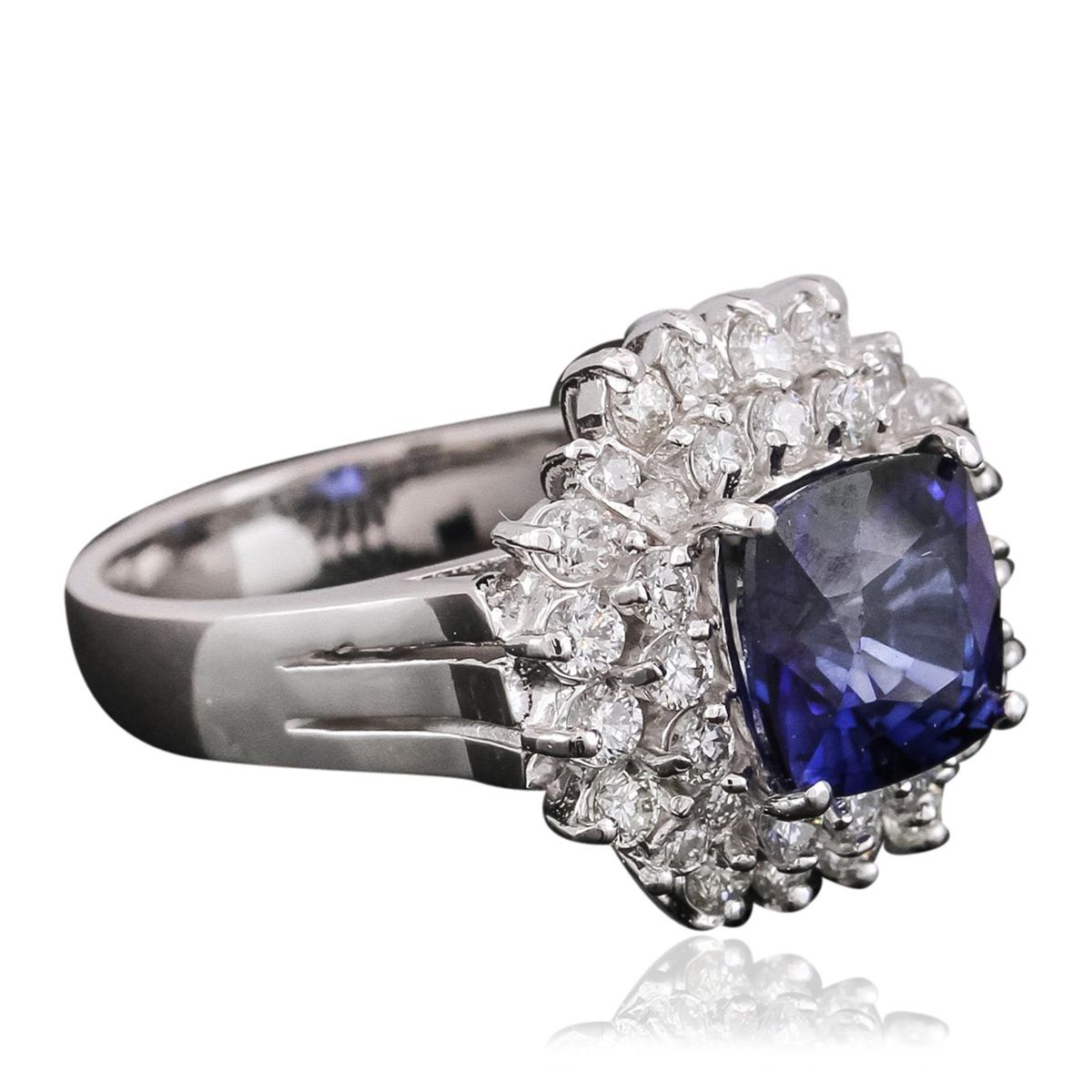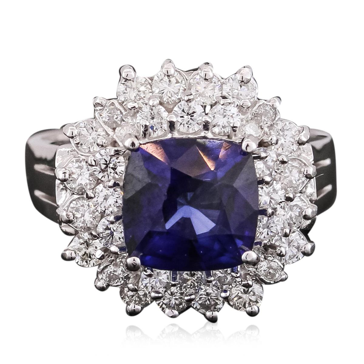 One electronically tested 14KT white gold ladies combination cast & assembled ring with a bright polish finish. Identified with markings of "14K". Condition is new. Containing: One prong set square cushion modified brilliant cut natural blue sapphire, measuring 8.00 x 8.00 x 5.20mm, approximate weight of 3.13ct., clarity is eye clean, type II, medium dark, moderately strong, blue color, (GIA B 6/4), cut is very good. Thirty-Six prong set round brilliant cut diamonds, measuring 1.90 - 1.30 x 0.96mm (depth est.) approximate total weight of 36 Stones = 0.54ct. Clarity: SI-1 to I-1. Color: I - J, Cut is Good. Colored gemstones are presumed to have been subjected to commonly used enhancement processes. All diamonds and colored gemstones are graded in the mounting, unless otherwise stated. Total Weight of Colored Stones 3.13ct. Total Weight of Diamonds 0.54ct. Total Weight of Ring 6.90 grams. GGL Appraised at $6,120.00.