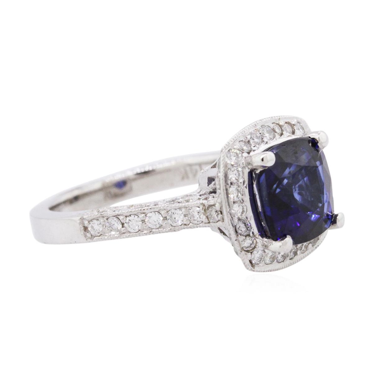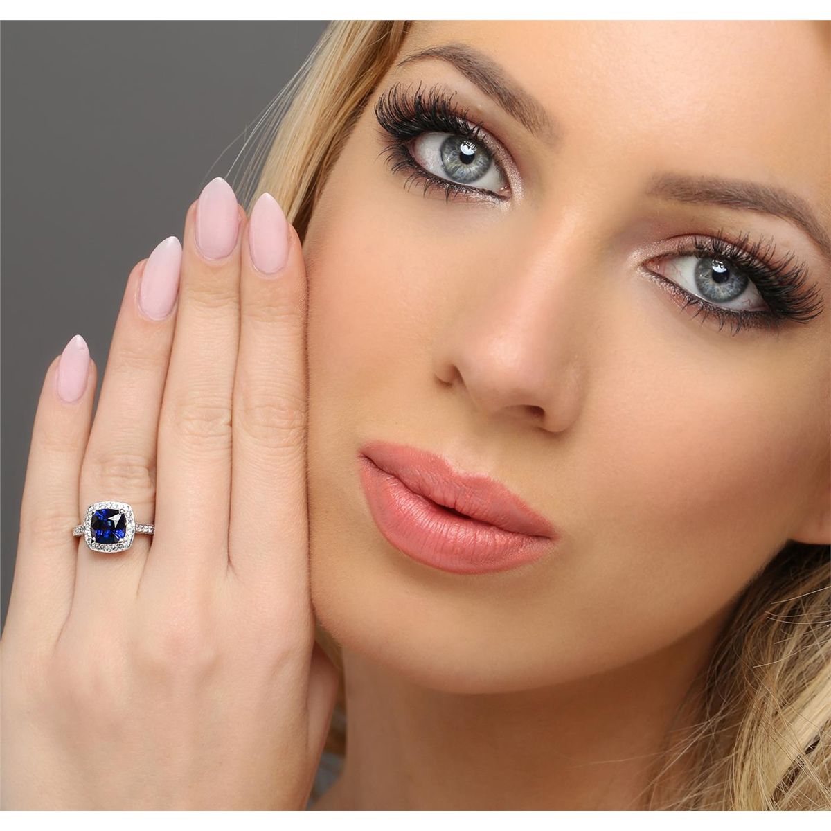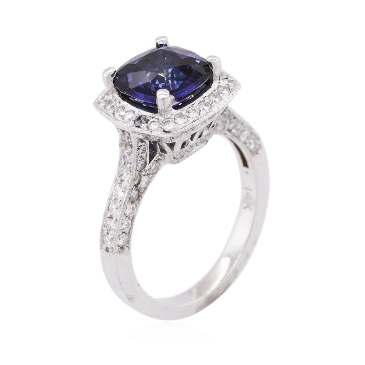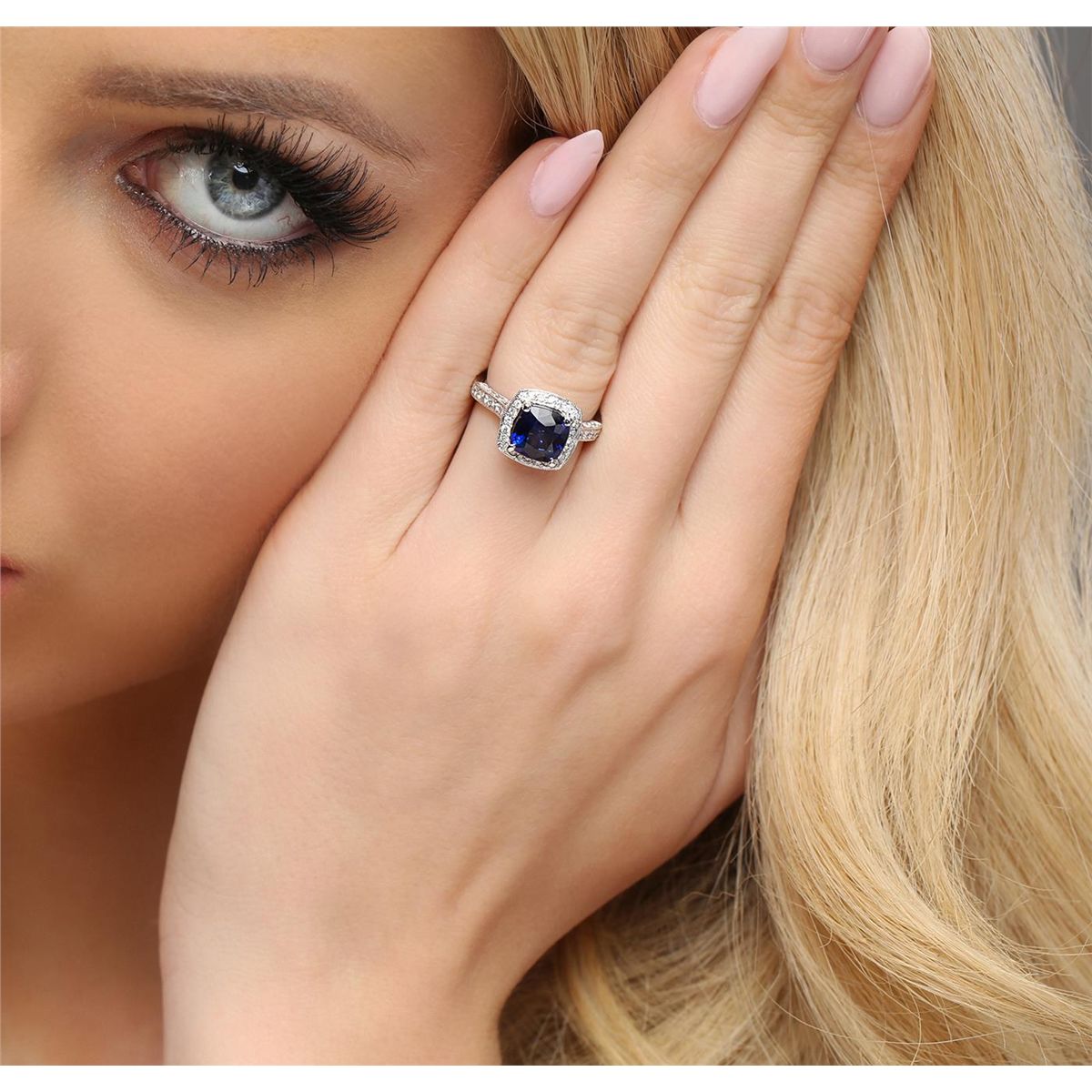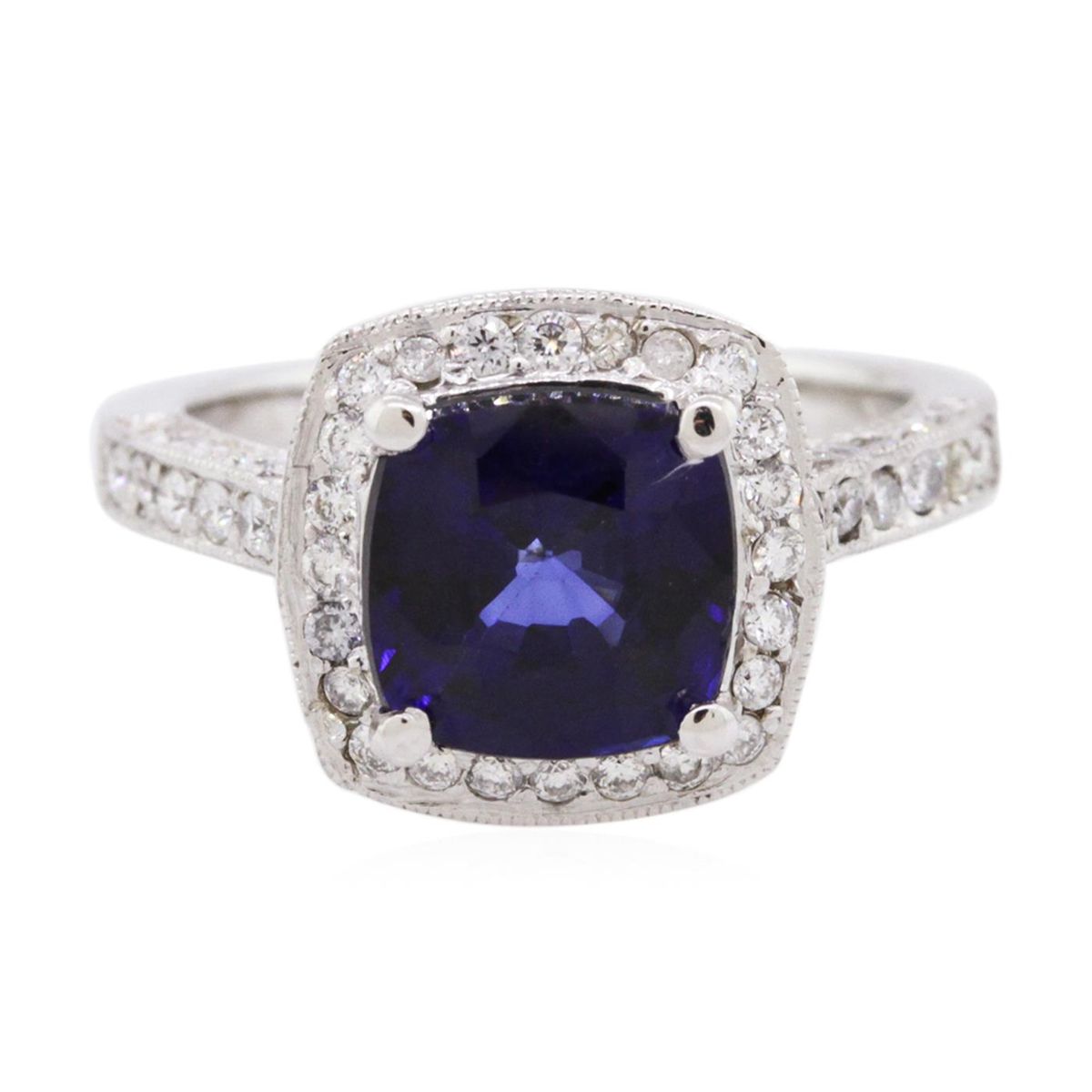 One electronically tested 14KT white gold ladies cast sapphire and diamond ring with a bright polish finish. Identified with markings of "14K". Condition is new. Containing: One prong set square cushion modified brilliant cut natural blue sapphire, measuring 8.00 x 8.00 x 5.20mm, approximate weight of 3.13ct., clarity is slightly included, type II, dark, moderately strong, blue color, (GIA B 7/4), cut is good. One Hundred Two prong set round brilliant cut diamonds, measuring 1.30 - 1.30 x 0.78mm (depth est.) approximate total weight of 102 Stones = 0.82ct. Clarity: SI-2 to I-1. Color: H - I, Cut is Good. Colored gemstones are presumed to have been subjected to commonly used enhancement processes. All diamonds and colored gemstones are graded in the mounting, unless otherwise stated. Total Weight of Colored Stones 3.13ct. Total Weight of Diamonds 0.82ct. Total Weight of Ring 5.10 grams. GGL Appraised at $5,810.00.