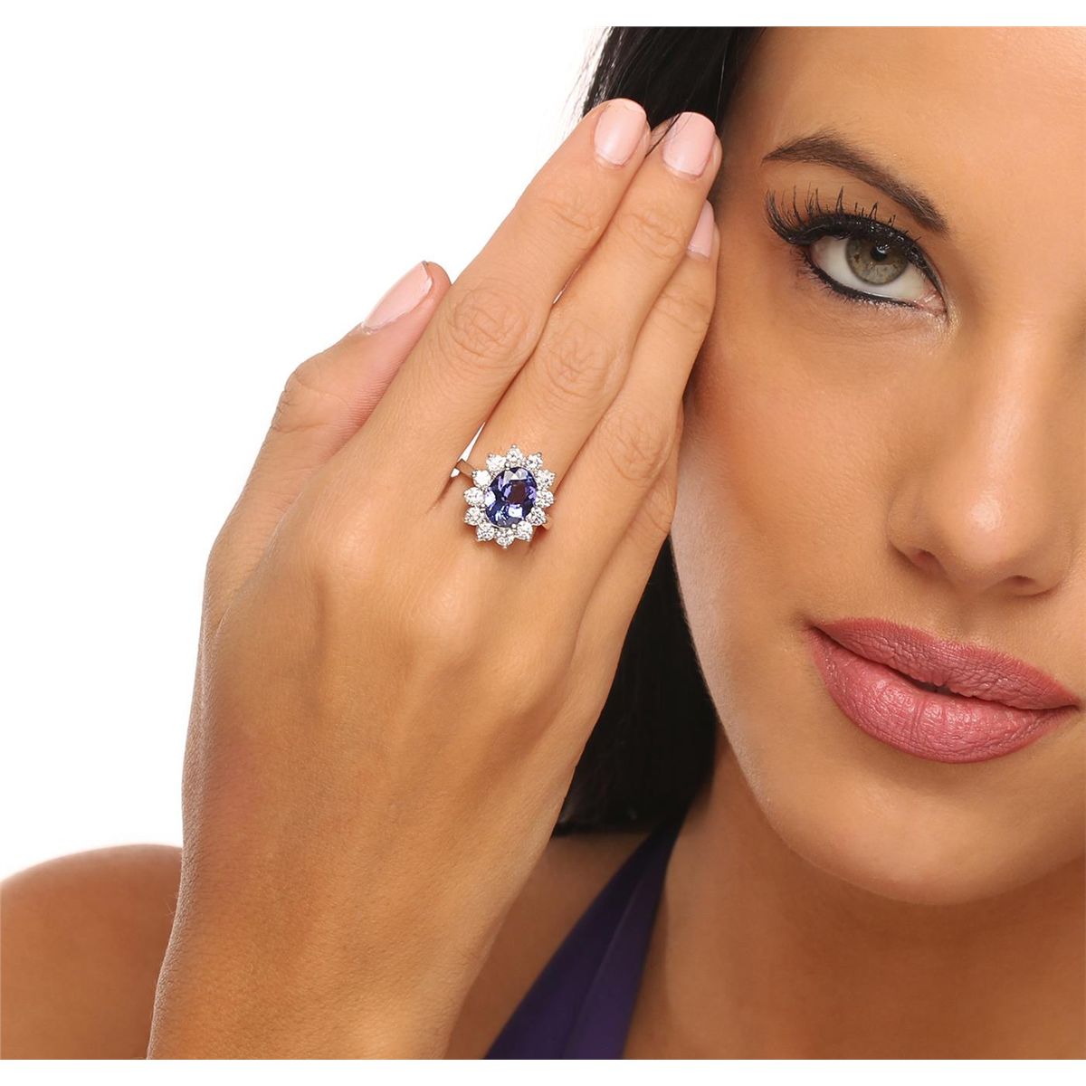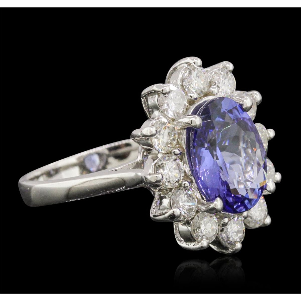One electronically tested 14KT white gold ladies cast tanzanite and diamond ring with a bright polish finish. Condition is new, good workmanship. The featured tanzanite is set within a diamond bezel, completed by a two and one-half millimeter wide band. Identified with markings of "K14". Containing: One prong set oval brilliant cut natural tanzanite, measuring 10.80 x 8.30 x 4.75mm, 8%. bulge factor, approximate weight of 3.13ct., clarity is eye clean, type I, medium dark, very slightly grayish, bluish violet color, (GIA bV 6/3), cut is good. Transmitting light with no distortion, transparent. Graded in the setting.Tanzanite is a very rare gemstone that is only found in the country of Tanzania. Originally discovered in 1967. Tiffany & Company, named the stone Tanzanite. It is found in the Usumburu Mountains that border the Umba Valley of northern Tanzania. Tanzanite occurs in gray, brown, violet, blue, reddish-purple, & green. The gem is interesting because of its exceptional pleochroism. Rotated in different directions a tanzanite will exhibit multiple changes of color. Tanzanite has a low tolerance to ultrasonic cleaning, and should not be cleaned using this method.Twelve prong set round brilliant cut diamonds, measuring 3.20 - 3.10 x 1.89mm (depth est.) approximate. Total Weight of 12 Stones = 1.47ct. Graded in the setting. Clarity: I-1 to I-2. Color: H - J. Total Weight of Colored Stones 3.13ct. Total Weight of Diamonds 1.47ct. Total Weight of Ring 5.72gm. AIG Appraised at $11,965.00.