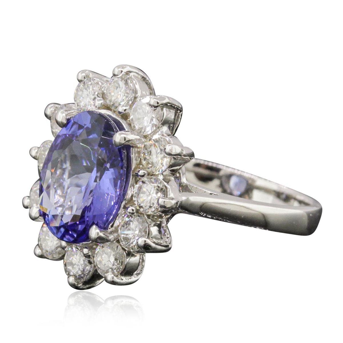 One electronically tested 14KT white gold ladies cast tanzanite and diamond ring with a bright polish finish. Condition is new, good workmanship. The featured tanzanite is set within a diamond bezel, completed by a two and one-half millimeter wide band. Identified with markings of "K14". Containing: One prong set oval brilliant cut natural tanzanite, measuring 10.80 x 8.30 x 4.75mm, 8%. bulge factor, approximate weight of 3.13ct., clarity is eye clean, type I, medium dark, very slightly grayish, bluish violet color, (GIA bV 6/3), cut is good. Transmitting light with no distortion, transparent. Graded in the setting.Tanzanite is a very rare gemstone that is only found in the country of Tanzania. Originally discovered in 1967. Tiffany & Company, named the stone Tanzanite. It is found in the Usumburu Mountains that border the Umba Valley of northern Tanzania. Tanzanite occurs in gray, brown, violet, blue, reddish-purple, & green. The gem is interesting because of its exceptional pleochroism. Rotated in different directions a tanzanite will exhibit multiple changes of color. Tanzanite has a low tolerance to ultrasonic cleaning, and should not be cleaned using this method.Twelve prong set round brilliant cut diamonds, measuring 3.20 - 3.10 x 1.89mm (depth est.) approximate. Total Weight of 12 Stones = 1.47ct. Graded in the setting. Clarity: I-1 to I-2. Color: H - J. Total Weight of Colored Stones 3.13ct. Total Weight of Diamonds 1.47ct. Total Weight of Ring 5.72gm. AIG Appraised at $11,965.00.