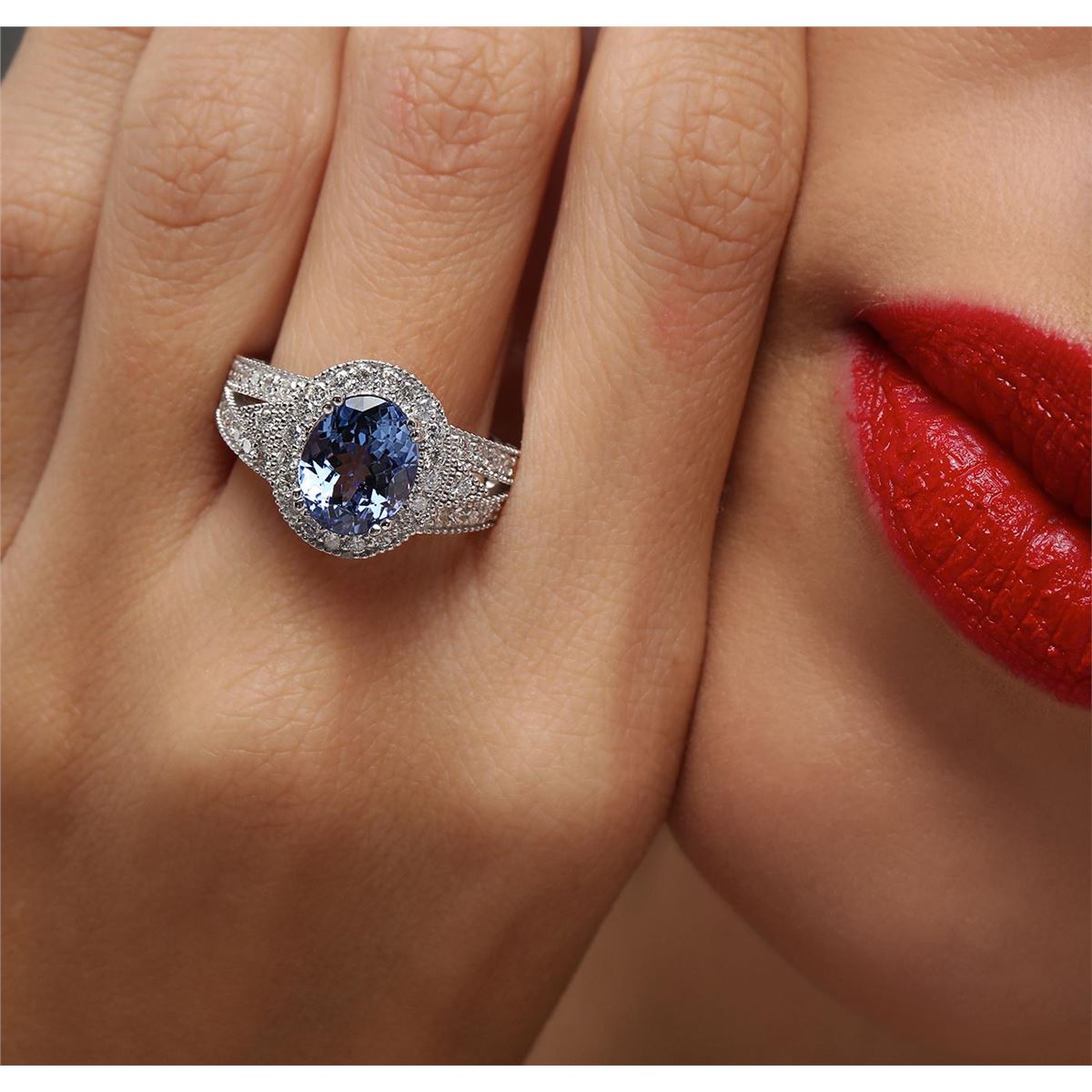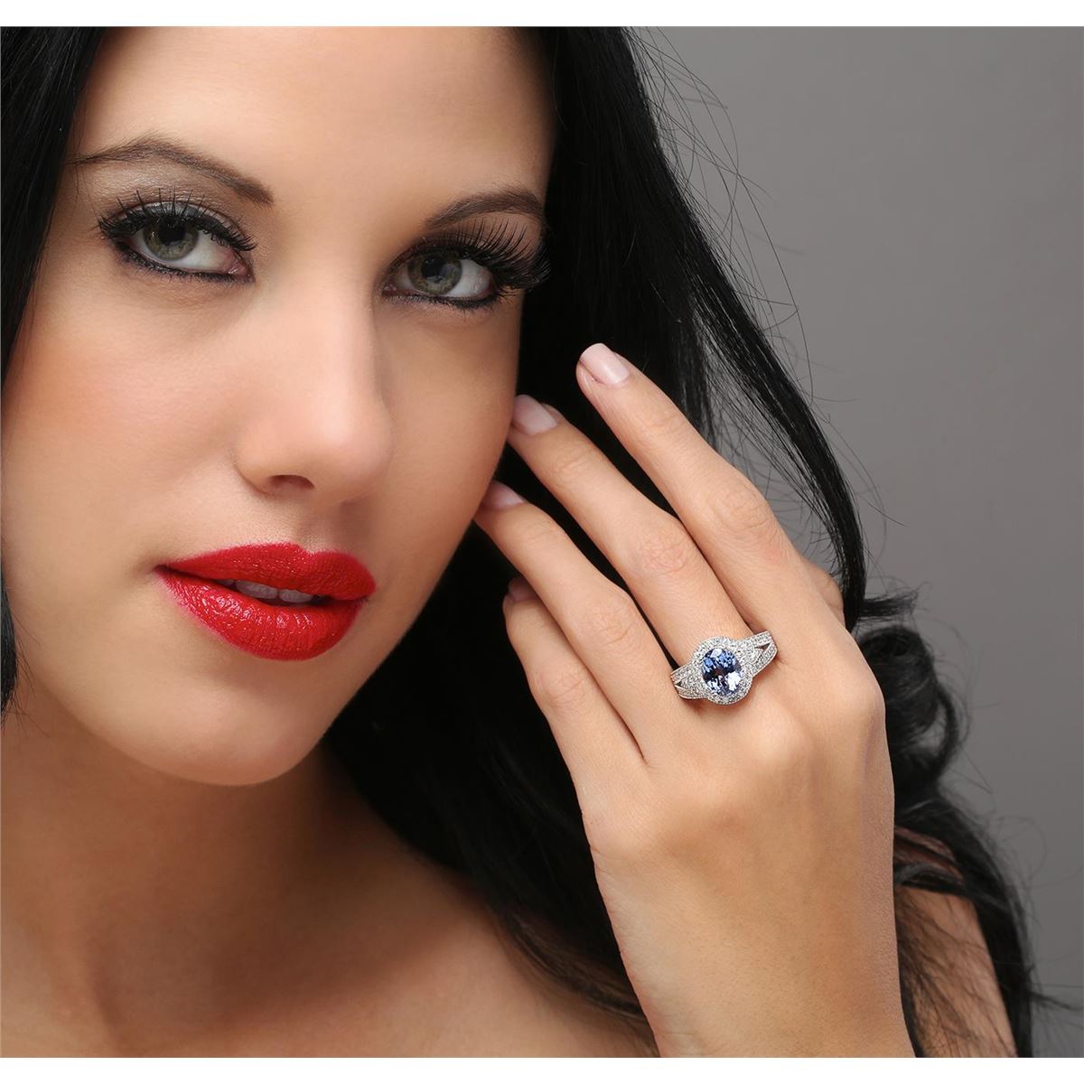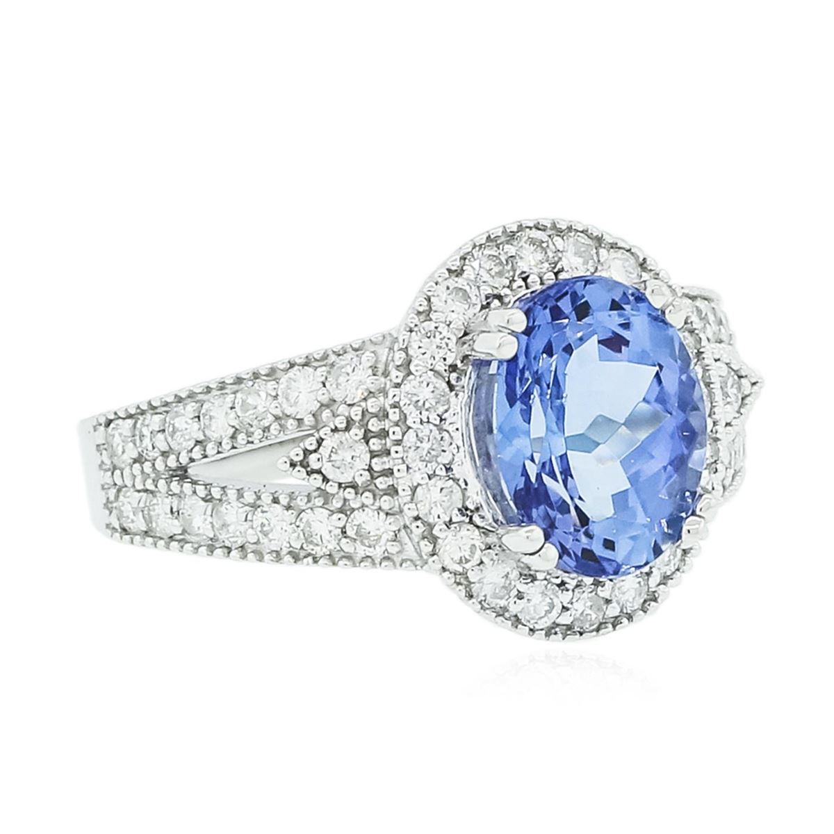 One electronically tested 14KT white gold ladies cast tanzanite and diamond ring with a bright polish finish. Identified with markings of "K14". Condition is new. Containing: One prong set oval modified brilliant cut natural tanzanite, measuring 10.20 x 8.20 x 5.33mm, approximate weight of 3.14ct., clarity is eye clean, type I, medium, very slightly grayish, violet color, (GIA V 5/3), cut is good. Fifty prong set round brilliant cut diamonds, measuring 1.50 - 1.50 x 0.90mm (depth est.) approximate total weight of 50 Stones = 0.62ct. Clarity: SI-1 to I-1. Color: H - I, Cut is Good. Colored gemstones are presumed to have been subjected to commonly used enhancement processes. All diamonds and colored gemstones are graded in the mounting, unless otherwise stated. Total Weight of Colored Stones 3.14ct. Total Weight of Diamonds 0.62ct. Total Weight of Ring 7.20 grams. GGL Appraised at $5,640.00.