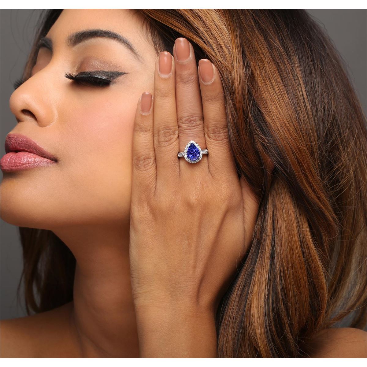 One electronically tested 14KT white gold ladies combination cast & assembled tanzanite and diamond ring with a flat shank with a bright polish finish. Identified with markings of 14K. Condition is new. Containing: One prong set pear modified brilliant cut natural tanzanite, measuring 10.47 x 8.18 x 5.48mm, approximate weight of 3.14ct., clarity is eye clean, type I, medium, moderately strong, violet color, (GIA V 5/4), cut is good. Thirty-Four prong set round brilliant cut diamonds, measuring 1.30 - 1.30 x 0.78mm (depth est.) approximate total weight of 34 Stones = 0.27ct. Clarity: SI-2 to I-1. Color: H - I, Cut is Good. Colored gemstones are presumed to have been subjected to commonly used enhancement processes. All diamonds and colored gemstones are graded in the mounting, unless otherwise stated. Total Weight of Colored Stones 3.14ct. Total Weight of Diamonds 0.27ct. Total Weight of Ring 4.90 grams. GGL Appraised at $5,635.00.