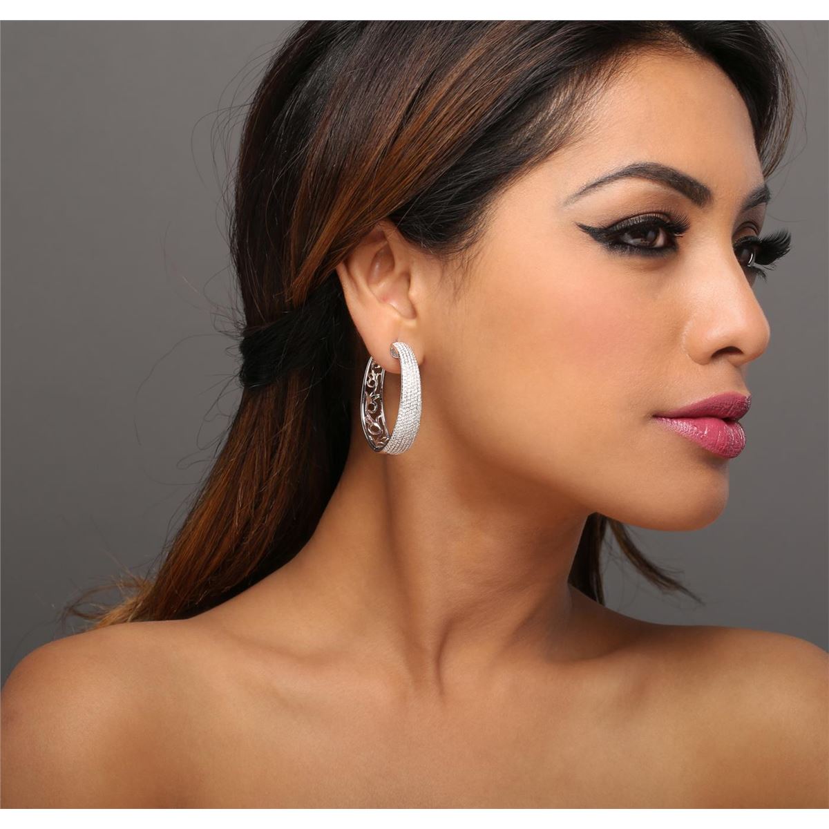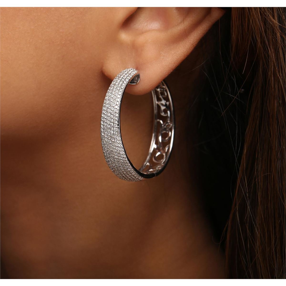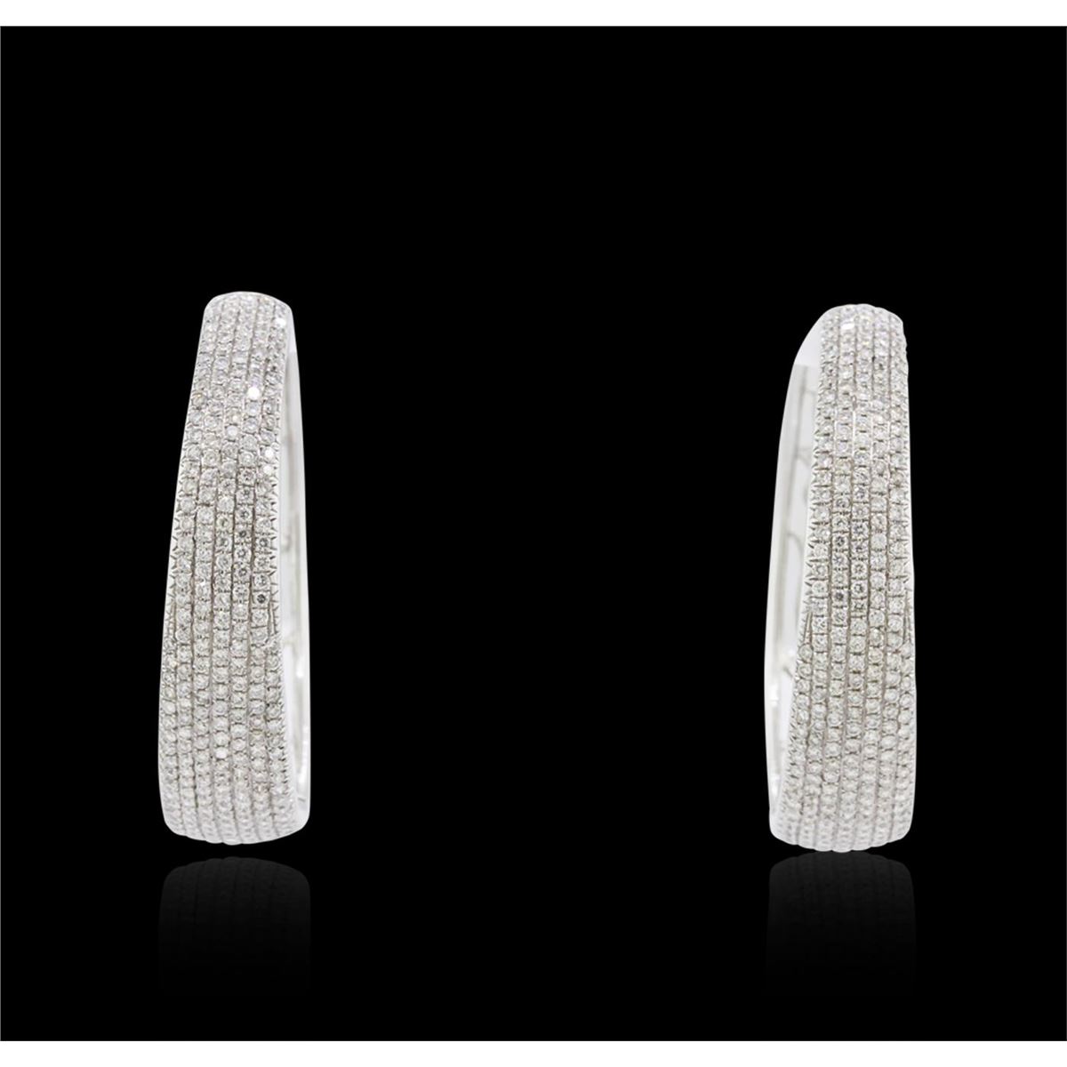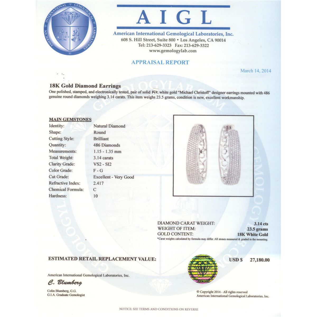 One polished, stamped, and electronically tested pair of solid 14KT white gold Michael Christoff designer earrings mounted with 486 genuine round diamonds weighing 3.14cts. This item weighs 23.50 grams, condition is new, excellent workmanship. AIGL Appraised at $27,180.00.