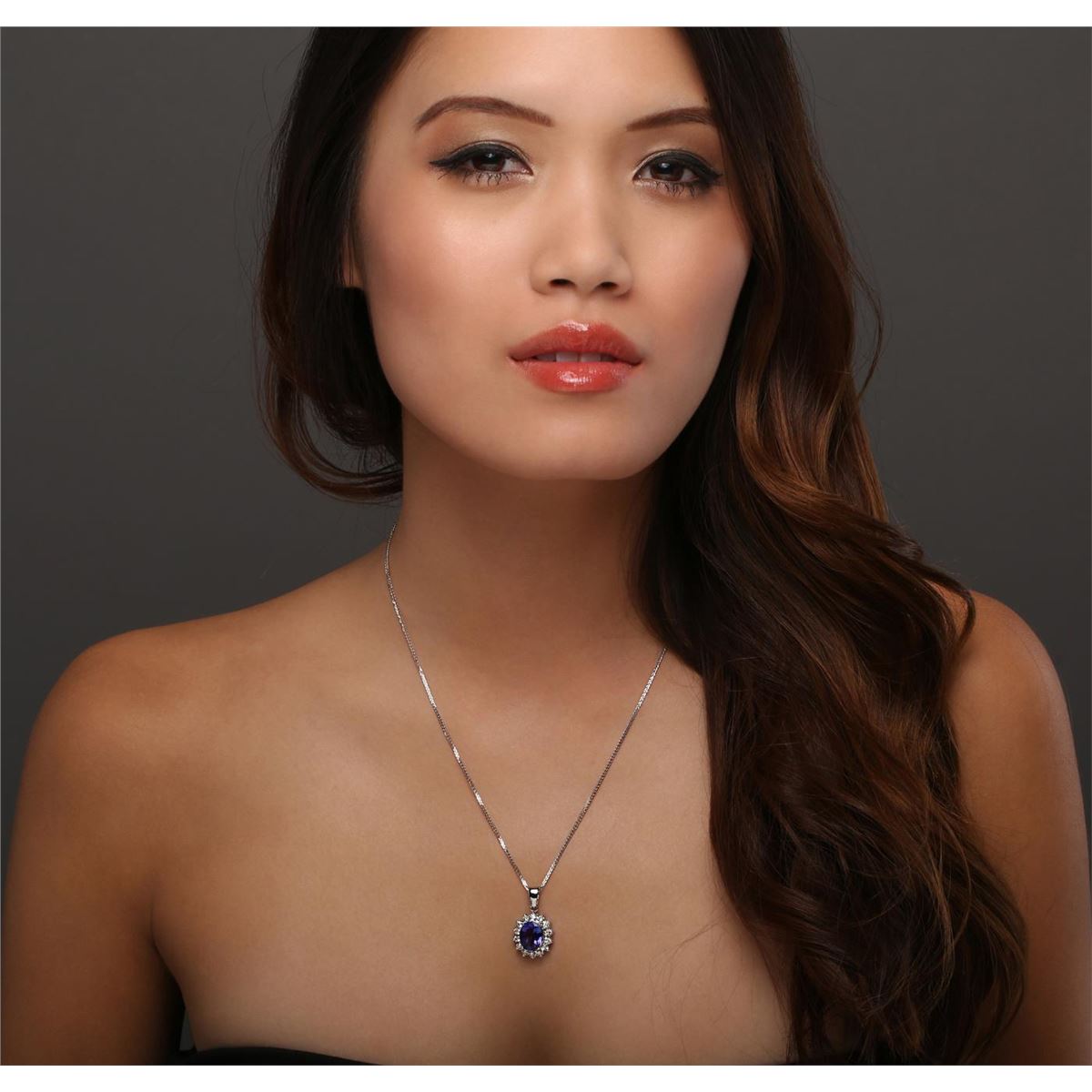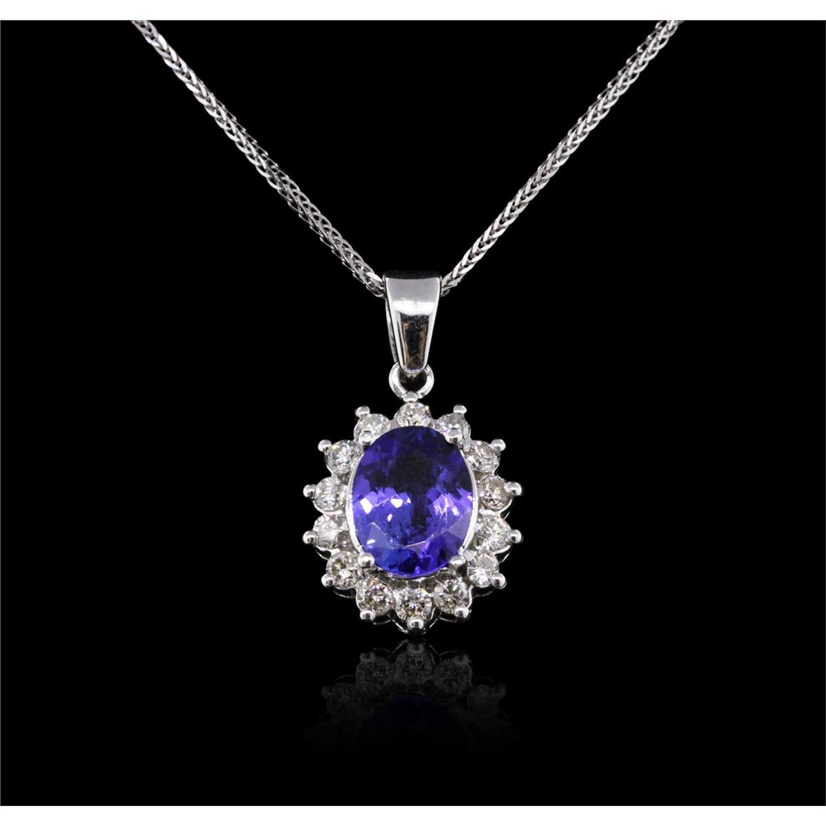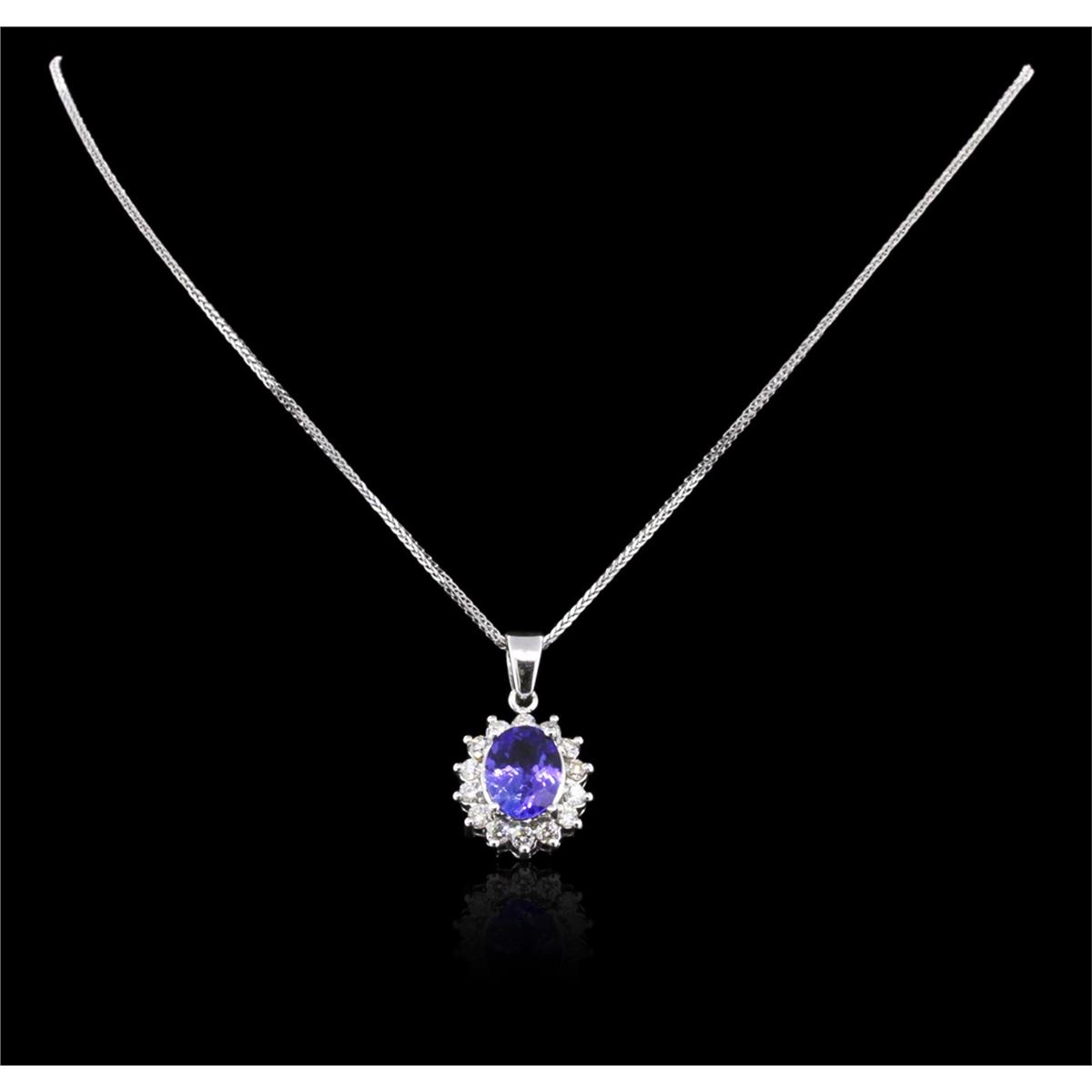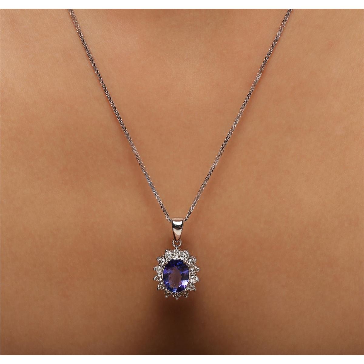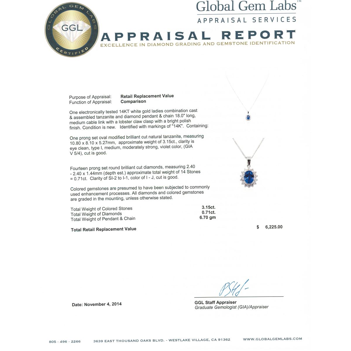 One electronically tested 14KT white gold ladies combination cast & assembled tanzanite and diamond pendant & chain 18.0" long, medium cable link with a lobster claw clasp with a bright polish finish. Identified with markings of "14K". Condition is new. Containing: One prong set oval modified brilliant cut natural tanzanite, measuring 10.80 x 8.10 x 5.27mm, approximate weight of 3.15ct., clarity is eye clean, type I, medium, moderately strong, violet color, (GIA V 5/4), cut is good. Fourteen prong set round brilliant cut diamonds, measuring 2.40 - 2.40 x 1.44mm (depth est.) approximate total weight of 14 Stones = 0.71ct. Clarity: SI-2 to I-1. Color: I - J, Cut is Good. Colored gemstones are presumed to have been subjected to commonly used enhancement processes. All diamonds and colored gemstones are graded in the mounting, unless otherwise stated. Total Weight of Colored Stones 3.15ct. Total Weight of Diamonds 0.71ct. Total Weight of Pendant & Chain 6.70 grams. GGL Appraised at $6,225.00.