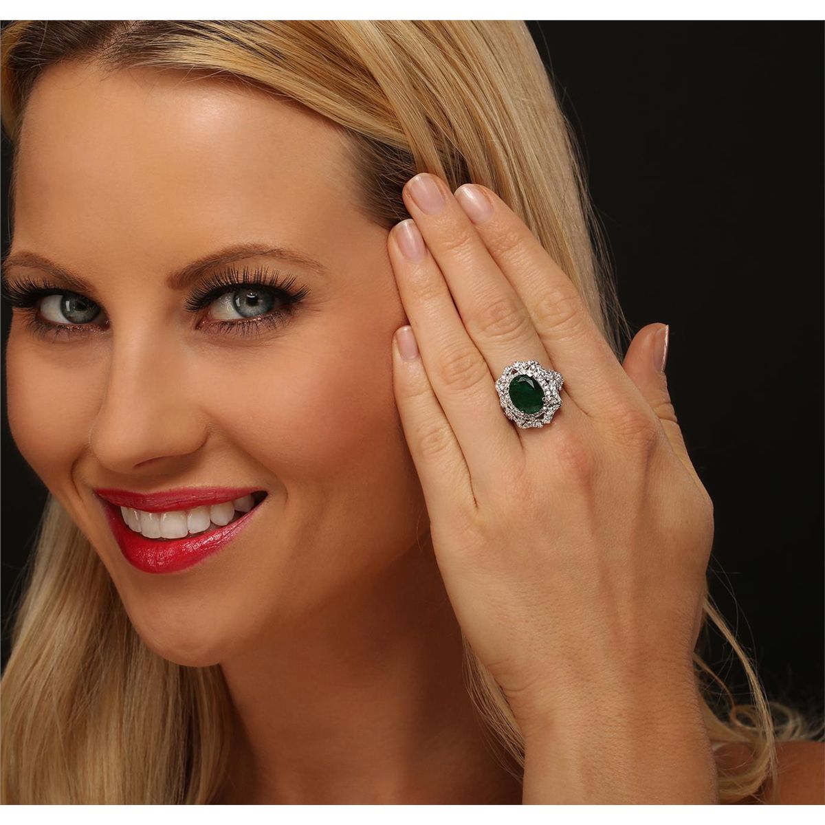 14KT White Gold 3.15ct Emerald and Diamond Ring A10528. One electronically tested 14KT white gold ladies cast emerald and diamond ring with a bright polish finish. The featured emerald is set within stylized diamond bezels supported by diamond set split shoulders, completed by a two and one-half millimeter wide band. Identified with markings of "K14". Condition is new, good workmanship. Containing: One prong set oval mixed cut natural emerald, measuring 12.20 x 9.60 x 4.60mm, 6%. bulge factor, approximate weight of 3.15ct., clarity is heavily included, type III, medium dark, moderately strong, very slightly bluish green color, (GIA vslbG 6/4), cut is good. Transmitting light with a minimum of distortion, transparent. Naturally occurring internal & external characteristics are present. Indications of oil residue. Graded in the setting. Sixty-Six prong set round brilliant cut diamonds, measuring 1.50 - 1.40 x 0.87mm (depth est.) approximate total weight of 66 Stones = 0.83ct. Graded in the setting. Clarity: SI-1 to I-1 . Color: G - I. Total Weight of Colored Stones 3.15ct. Total Weight of Diamonds 0.83ct. Total Weight of Ring 8.78 grams. AIG Appraised at $11,985.00.