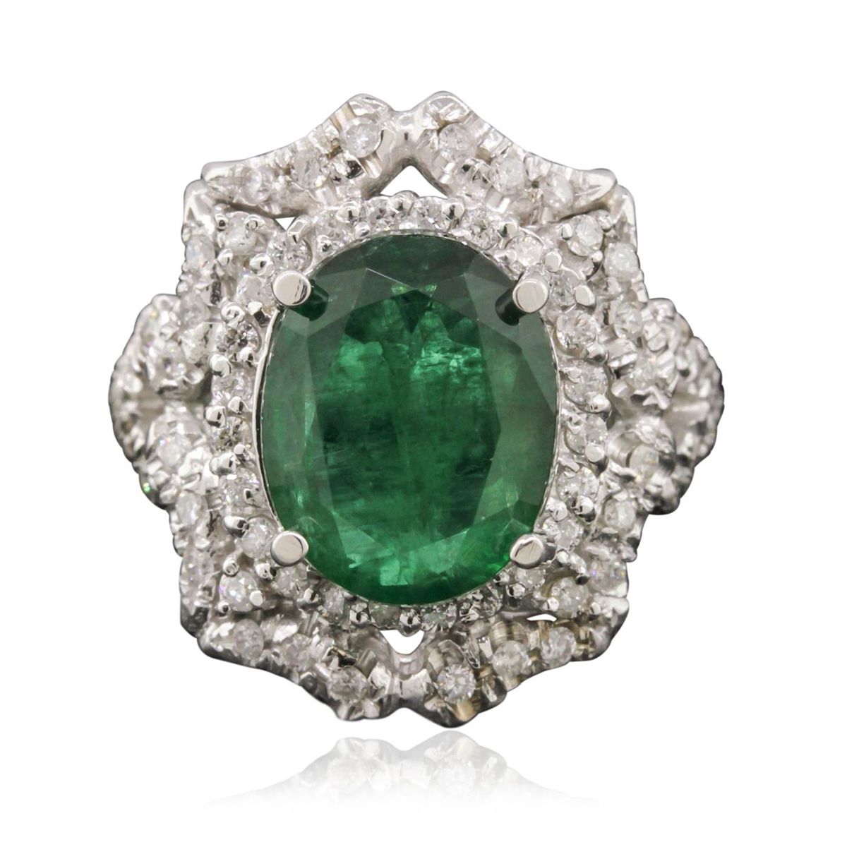 14KT White Gold 3.15ct Emerald and Diamond Ring A10528. One electronically tested 14KT white gold ladies cast emerald and diamond ring with a bright polish finish. The featured emerald is set within stylized diamond bezels supported by diamond set split shoulders, completed by a two and one-half millimeter wide band. Identified with markings of "K14". Condition is new, good workmanship. Containing: One prong set oval mixed cut natural emerald, measuring 12.20 x 9.60 x 4.60mm, 6%. bulge factor, approximate weight of 3.15ct., clarity is heavily included, type III, medium dark, moderately strong, very slightly bluish green color, (GIA vslbG 6/4), cut is good. Transmitting light with a minimum of distortion, transparent. Naturally occurring internal & external characteristics are present. Indications of oil residue. Graded in the setting. Sixty-Six prong set round brilliant cut diamonds, measuring 1.50 - 1.40 x 0.87mm (depth est.) approximate total weight of 66 Stones = 0.83ct. Graded in the setting. Clarity: SI-1 to I-1 . Color: G - I. Total Weight of Colored Stones 3.15ct. Total Weight of Diamonds 0.83ct. Total Weight of Ring 8.78 grams. AIG Appraised at $11,985.00.