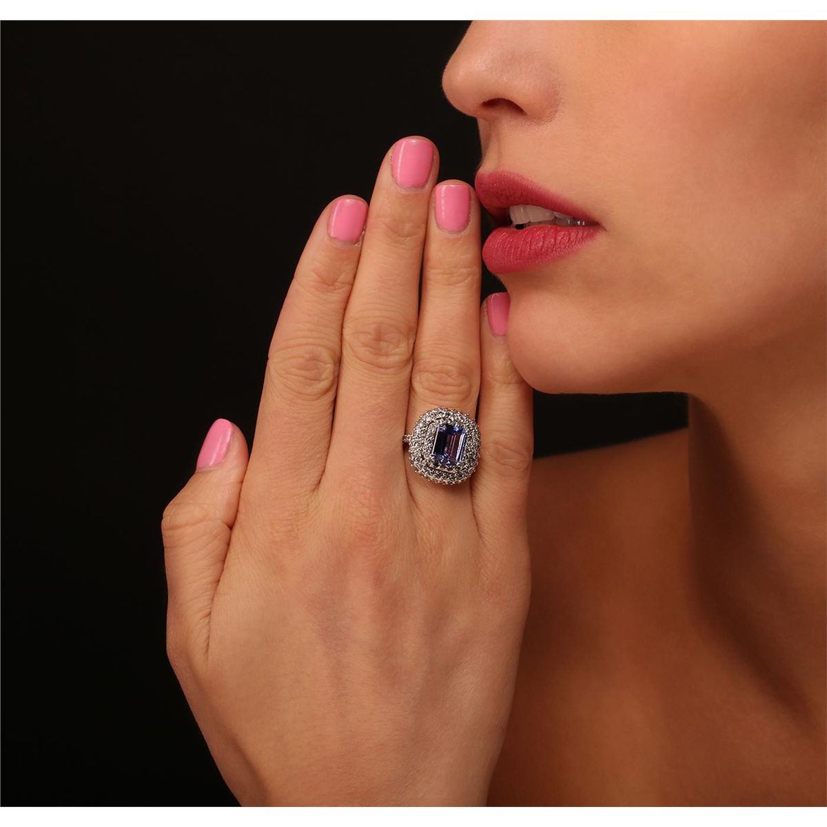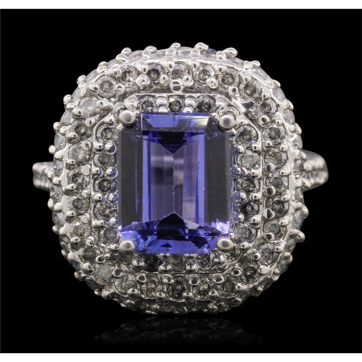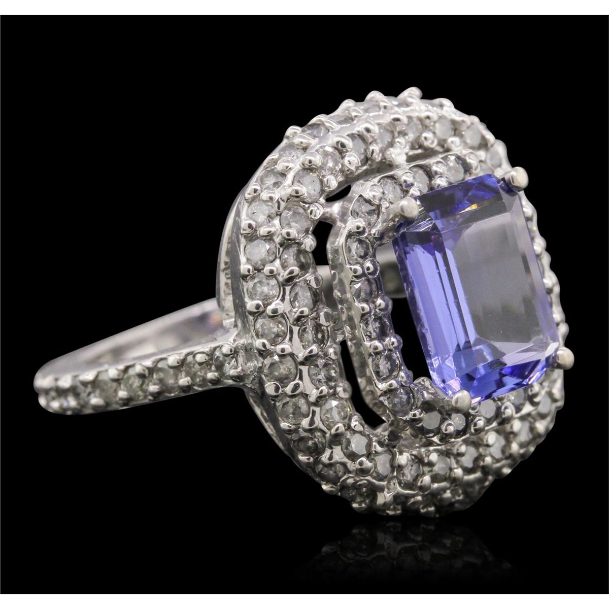 One electronically tested 14Kt white gold ladies cast tanzanite and diamond ring with a bright polish finish. Condition is new, good workmanship. The featured tanzanite is set within a double diamond bezel supported by diamond set shoulders, completed by a three millimeter wide band. Identified with markings of "K14". Containing: One prong set rectangular cushion mixed cut natural tanzanite, measuring 10.00 x 7.20 x 5.20mm, 8% bulge factor, approximate weight of 3.15ct, clarity is eye clean, type I, medium dark, very slightly grayish, bluish violet color (GIA bV 6/3) cut is good. Transmitting. light with no distortion, transparent. Graded in the setting. Tanzanite is a very rare gemstone that is only found in the country of Tanzania. Originally discovered in 1967. Tiffany & Company, named the stone Tanzanite. It is found in the Usumburu Mountains that border the Umba Valley of northern Tanzania. Tanzanite occurs in gray, brown, violet, blue, reddish-purple, & green. The gem is interesting because of its exceptional pleochroism. Rotated in different directions a tanzanite will exhibit multiple changes of color. Tanzanite has a low tolerance to ultrasonic cleaning, and should not be cleaned using this method. Ninety-eight prong set round brilliant cut diamonds, measuring 1.70 - 1.50 x 0.96mm (depth est) approximate total weight of 98 Stones = 1.47ct. Graded in the setting. Clarity I-1 to I-2. Color H-J. Total Weight of Colored Stones 3.15ct. Total Weight of Diamonds 1.47ct. Total Weight of Ring 12.54 grams. AIG Appraised at $13,930.00.